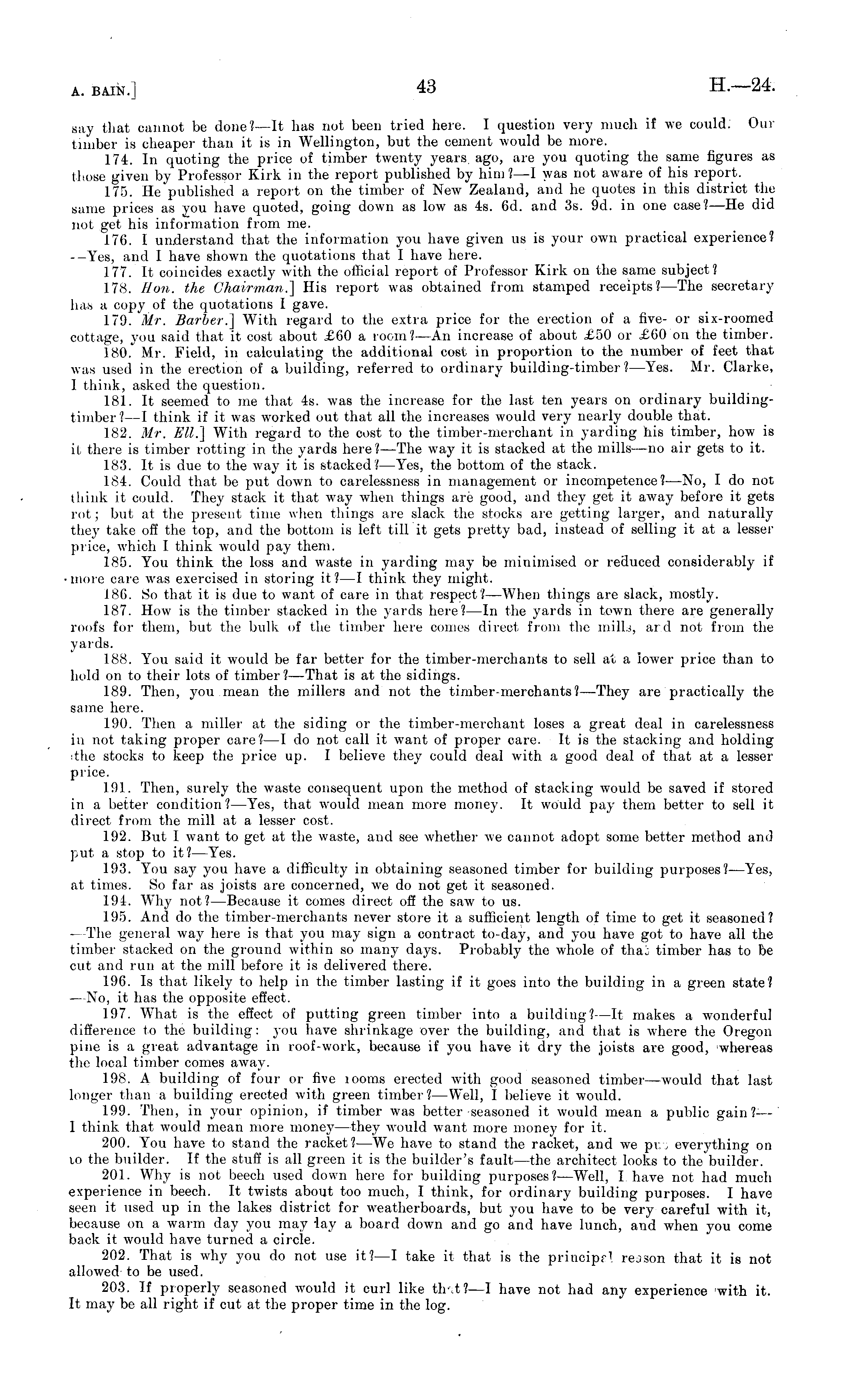 say that cannot be done? —It has not been tried here. I question very much if we could. Our timber is cheaper than it is in Wellington, but the cement would be more. 174. In quoting the price of timber twenty years ago, are you quoting the same figures as those given by Professor Kirk in the report published by him? —1 was not aware of his report. 175. He published a report on the timber of New Zealand, and he quotes in this district the same prices as you have quoted, going down as low as 4s. (id. and -'in. 9d. in one case?—He did no! get his information from me. 176. 1 understand that the information you have given us is your own practical experience? -_Yes, and I have shown the quotations that I have here. 177. It coincides exactly with the official report of Professor Kirk on the same subject? 178. Hon. the Chairman.] His report was obtained from stamped receipts?— The secretary has a copy of the quotations I gave. I 7!). Mr. Barber.] With regard to the extra price for the erection of a five- or six-roomed cottage, you said that it cost about .£6O a room?—An increase of about £50 or £60 on the timber. 180. Mr. Field, in calculating the additional cost in proportion to the number of feet that was used in the erection of a building, referred to ordinary building-timber?— Yes. Mr. Clarke, 1 think, asked the question. 181. It seemed to me that 4s. was the increase for the last ten years on ordinary buildingtimber? —1 think if it was worked out that all the increases would very nearly double that. 182. Mr. Ell.] With regard to the cost to the timber-merchant in yarding his timber, how is it there is timber rotting in the yards here?— The way it is stacked at the mills —no air gets to it. 183. It is due to the way it is stacked?— Yes, the bottom of the stack. 184. Could that be put down to carelessness in management or incompetence?—No, I do not think it could. They stack it that way when things are good, and they get it away before it gets rot ; but at the present time when tilings are slack the stocks are getting larger, and naturally they take off the top, and the bottom is left till it gets pretty bad, instead of selling it at a lesser price, which I think would pay them. 185. You think the loss and waste in yarding may be minimised or reduced considerably if more care was exercised in storing it?—l think they might. 186. So that it is due to want of care in that respect? —When things are slack, mostly. 187. How is the timber stacked in the yards here?—ln the yards in town there are generally roofs for them, but the bulk of the timber here conies direct from the milL, aid not from the \ aids. 188. You said it would be far better for the timber-merchants to sell at a lower price than to hold on to their lots of timber? —That is at the sidings. 189. Then, you mean the millers and not the timber-merchants?— They are practically the same here. 190. Then a miller at the siding or the timber-merchant loses a great deal in carelessness in not taking proper care? —I do not call it want of proper care. It is the stacking and holding the stocks to keep the price up. I believe they could deal with a good deal of that at a lesser price. 191. Then, surely the waste consequent upon the method of stacking would be saved if stored in a better condition? —Yes, that would mean more money. It would pay them better to sell it direct from the mill at a lesser cost. 192. But I want to get at the waste, and see whether we cannot adopt some better method and put a stop to it ?—Yes. 193. You say you have a difficulty in obtaining seasoned timber for building purposes?— Yes, at times. So far as joists are concerned, we do not get it seasoned. 191. Why not?— Because it comes direct off the saw to us. 195. And do the timber-merchants never store it a sufficient length of time to get it seasoned? —The general way here is that you may sign a contract to-day, and you have got to have all the timber stacked on the ground within so many days. Probably the whole of thai timber has to be cut and run at the mill before it is delivered there. 196. Is that likely to help in the timber lasting if it goes into the building in a green state? —No, it has the opposite effect. 197. What is the effect of putting green timber into a building?—lt makes a wonderful difference to the building: you have shrinkage over the building, and that is where the Oregon pine is a great advantage in roof-work, because if you have it dry the joists are good, whereas the local timber comes away. 198. A building of four or five looms erected with good seasoned timber—would that last longer than a building erected with green timber?— Well, I believe it would. 199. Then, in your opinion, if timber was better seasoned it would mean a public gain ? : — 1 think that would mean more money —they would want more money for it. 200. You have to stand the racket? —We have to stand the racket, and we pi , everything on io the builder. If the stuff is all green it is the builder's fault—the architect looks to the builder. 201. Why is not beech used down here for building purposes?— Well, I have not had much experience in beech. It twists about too much, I think, for ordinary building purposes. I have seen it used up in the lakes district for weatherboards, but you have to be very careful with it, because on a warm day you may lay a board down and go and have lunch, and when you come back it would have turned a circle. 202. That is why you do not use it? —I take it that is the principr! rejson that it is not allowed to be used. 203. If properly seasoned would it curl like tht?—l have not had any experience with it. It may be all right if cut at the proper time in the log.