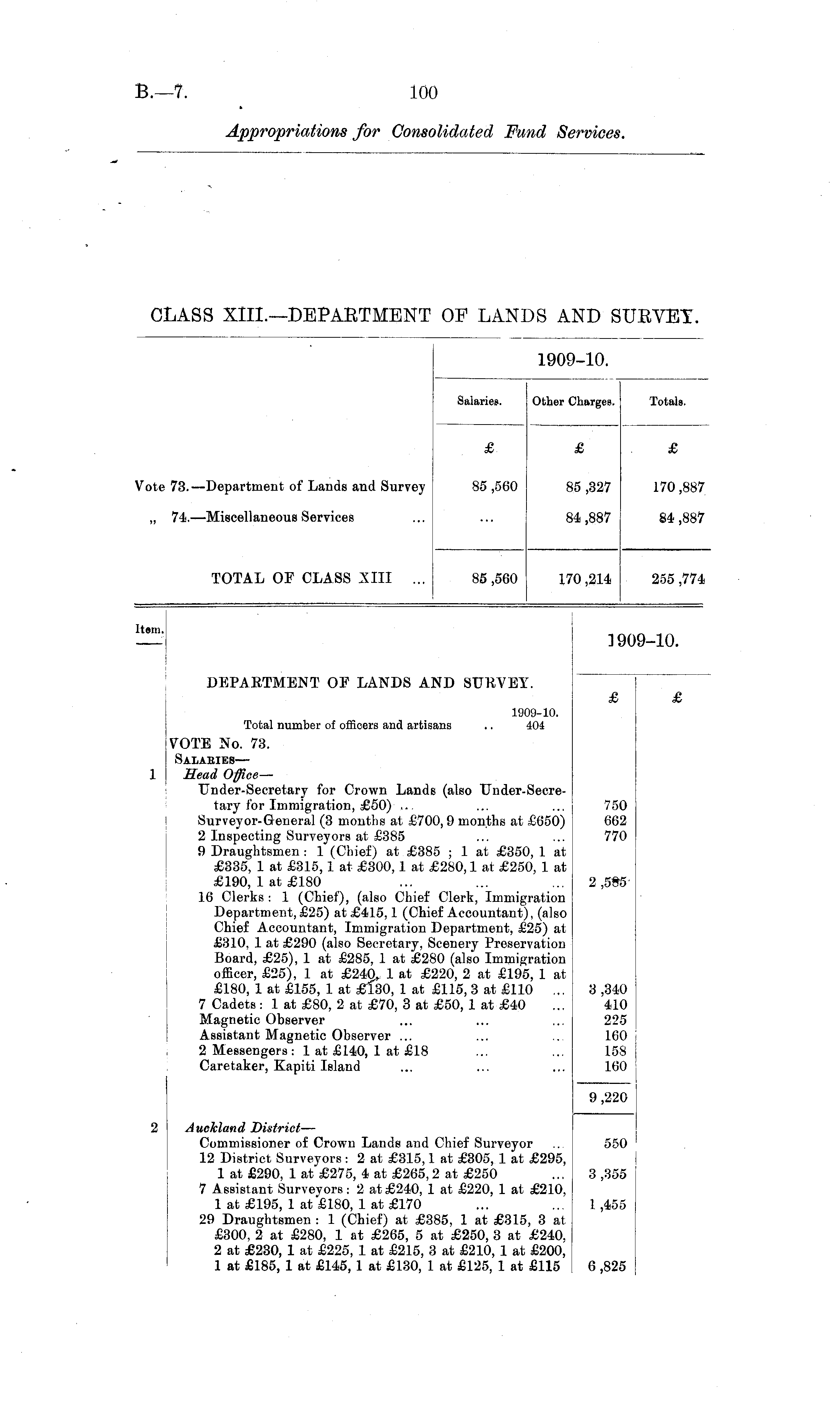 1909-10. Salaries. Other Charges. Totals. ote 73.—Department of Lands and Survey £ £ £ 85 ,560 85 ,327 170 ,887 „ 74.—Miscellaneous Services 84 ,887 84 ,887 TOTAL OF CLASS XIII ... 85 ,560 170 ,214 255 ,774 .tern. '9-10. DEPARTMENT OF LANDS AND SURVEY. 1909-10. Total number of offioers and artisans .. 404 VOTE No. 73. Salabies — Head Office — Under-Secretary for Crown Lands (also Under-Secre-tary for Immigration, £50) ,.. Surveyor-General (3 months at £700, 9 months at £650) 2 Inspecting Surveyors at £385 9 Draughtsmen : 1 (Chief) at £385 ; 1 at £350, 1 at £335, 1 at £3.15,1 at £300,1 at £280,1 at £250, 1 at £190, 1 at £180 16 Clerks : 1 (Chief), (also Chief Clerk, Immigration Department, £25) at £415,1 (Chief Accountant), (also Chief Accountant, Immigration Department, £25) at £310, 1 at £290 (also Secretary, Scenery Preservation Board, £25), 1 at £285, 1 at £280 (also Immigration officer, £25), 1 at £240. 1 at £220, 2 at £195, 1 at £180, 1 at £155, 1 at £130, 1 at £115, 3 at £110 ... 7 Cadets: 1 at £80, 2 at £70, 3 at £50, 1 at £40 Magnetic Observer Assistant Magnetic Observer ... 2 Messengers: 1 at £140, 1 at £18 Caretaker, Kapiti Island 750 662 770 2,5G5 3,340 410 225 160 158 160 9 ,220 Auckland District — Commissioner of Crown Lands and Chief Surveyor 12 District Surveyors : 2 at £315,1 at £305, 1 at £295, 1 at £290, 1 at £275, 4 at £265, 2 at £250 7 Assistant Survevors: 2 at £240, 1 at £220, 1 at £210, 1 at £195, 1 at £180, 1 at £170 29 Draughtsmen : 1 (Chief) at £385, 1 at £315, 3 at £300, 2 at £280, 1 at £265, 5 at £250, 3 at £240, 2 at £230, 1 at £225, 1 at £215, 3 at £210, 1 at £200, 1 at £185, 1 at £145, 1 at £130, 1 at £125, 1 at £115 550 3 ,355 1,455 6,825
