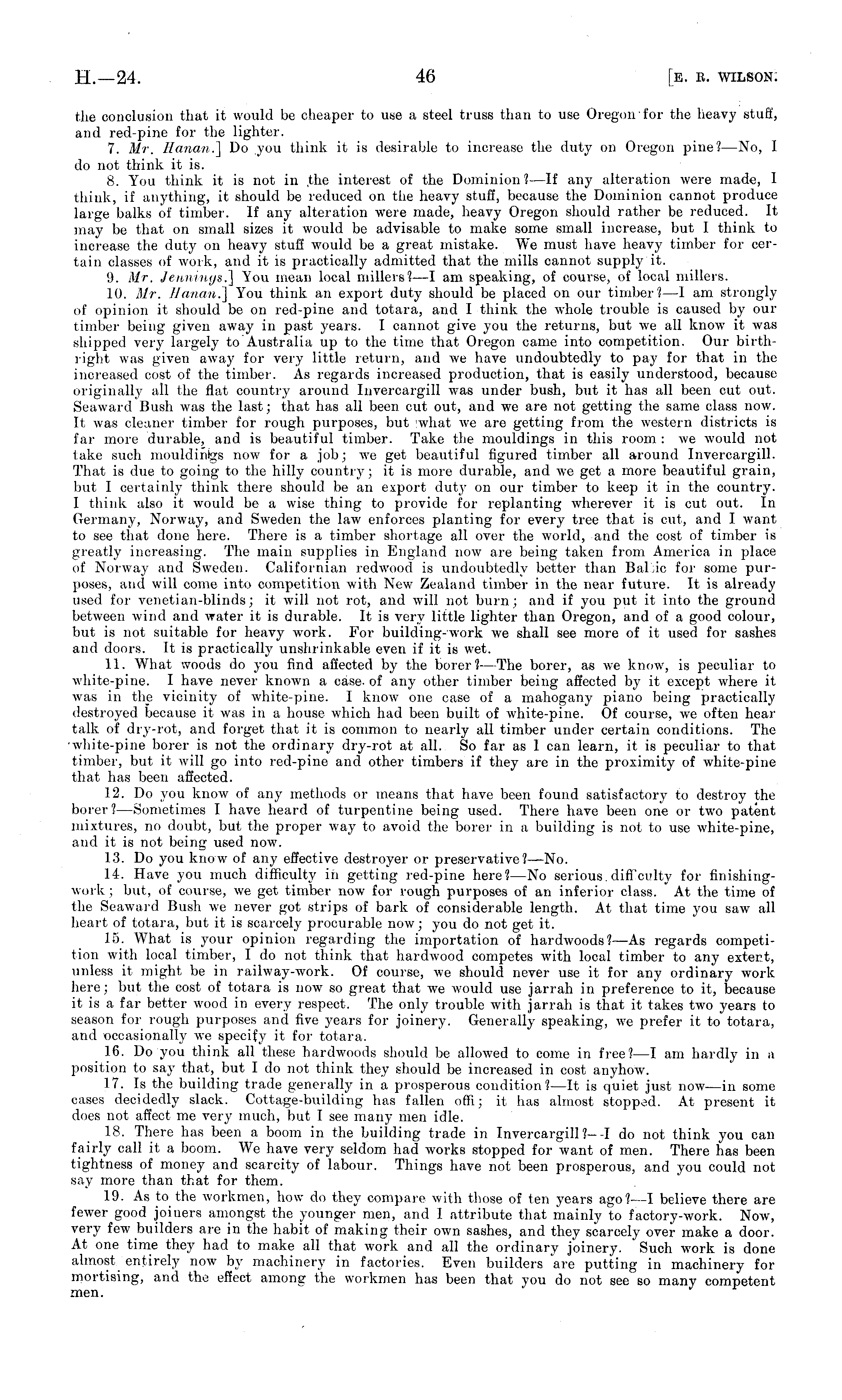 the conclusion that it would be cheaper to use a steel truss than to use Oregonfor the heavy stud, and red-pine for the lighter. 7. Mr. llanan.] Do you think it is desirable to increase the duty on Oregon pine?—No, I do not think it is. 8. You think it is not in the interest of the Dominion?—lf any alteration were made, 1 think, if anything, it should be reduced on the heavy stuff, because the Dominion cannot produce large balks of timber. If any alteration were made, heavy Oregon should rather be reduced. It may be that on small sizes it would be advisable to make some small increase, but I think to increase the duty on heavy stuff would be a great mistake. We must have heavy timber for certain classes of work, and it is practically admitted that the mills cannot supply it. 9. Mr. Jennings.] You mean local millers?—l am speaking, of course, of local millers. 10. Mr. J/nniin.] You think an export duty should be placed on our timber?—l am strongly of opinion it should be on red-pine and totara, and I think the whole trouble is caused by our timber being given away in past years. 1 cannot give you the returns, but we all know it was shipped very largely to Australia up to the time that Oregon came into competition. Our birthright was given away for very little return, and we have undoubtedly to pay for that in the increased coet of the timber. As regards increased production, that is easily understood, because originally all the flat country around Invercargill was under bush, but it has all been cut out. Seaward Bush was the last; that has all been cut out, and we are not getting the same class now. It was cleaner timber for rough purposes, but what we are getting from the western districts is Far more durable, and is beautiful timber. Take the mouldings in this room: we would not take such mouldinlgs now for a job; we get beautiful figured timber all around Invercargill. That is due to going to the hilly country; it is more durable, and we get a more beautiful grain, but I certainly think there should be an export duty on our timber to keep it in the country. I think also it would be a wise thing to provide for replanting wherever it is cut out. In Germany, Norway, and Sweden the law enforces planting for every tree that is cut, and I want to see that done here. There is a timber shortage all over the world, and the cost of timber is greatly increasing. The main supplies in England now are being taken from America in place of Norway and Sweden. Californian redwood is undoubtedly better than Bal.ic for some purposes, and will come into competition with New Zealand timber in the near future. It is already used for veiietian-blinds; it will not rot, and will not burn; and if you put it into the ground between wind and "water it is durable. It is very little lighter than Oregon, and of a good colour, but is not suitable for heavy work. For building-work we shall see more of it used for sashes and doors. It is practically unshrinkable even if it is wet. 11. What woods do you find affected by the borer?— The borer, as we know, is peculiar to white-pine. I have never known a case- of any other timber being affected by it except where it was in the vicinity of white-pine. I know one case of a mahogany piano being practically destroyed because it was in a house which had been built of white-pine. Of course, we often hear talk of dry-rot, and forget that it is common to nearly all timber under certain conditions. The white-pine borer is not the ordinary dry-rot at all. So far as 1 can learn, it is peculiar to that timber, but it will go into red-pine and other timbers if they are in the proximity of white-pine that has been affected. 12. Do you know of any methods or means that have been found satisfactory to destroy the borer? —Sometimes I have heard of turpentine being used. There have been one or two patent mixtures, no doubt, but the proper way to avoid the borer in a building is not to use white-pine, and it is not being used now. 13. Do you know of any effective destroyer or preservative? —No. 14. Have you much difficulty in getting red-pine here? —No serious.diffculty for finishingwork; but, of course, we get timber now for rough purposes of an inferior class. At the time of the Seaward Bush we never got strips of bark of considerable length. At that time you saw all heart of totara, but it is scarcely procurable now; you do not get it. 15. What is your opinion regarding the importation of hardwoods? —As regards competition with local timber, I do not think that hardwood competes with local timber to any extent, unless it might be in railway-work. Of course, we should never use it for any ordinary work here; but the cost of totara is now so great that we would use jarrab in preference to it, because it is a far better wood in every respect. The only trouble with jarrah is that it takes two years to season for rough purposes and five years for joinery. Generally speaking, we prefer it to totara, and occasionally we specify it for totara. 16. Do you think all these hardwoods should be allowed to come in free? —l am hardly in a position to say that, but I do not think they should be increased in cost anyhow. 17. Is the building trade generally in a prosperous condition?—lt is quiet just now—in some cases decidedly slack. Cottage-building lias fallen ofii; it has almost stopped. At present it does not affect me very much, but I see many men idle. 18. There has been a boom in the building trade in Invercargill ?--I do not think you can fairly call it a boom. We have very seldom had works stopped for want of men. There has been tightness of money and scarcity of labour. Things have not been prosperous, and you could not say more than that for them. 19. As to the workmen, how do they compare with those of ten years ago?—l believe there are fewer good joiners amongst the younger men, and I attribute that mainly to factory-work. Now, very few builders are in the habit of ma