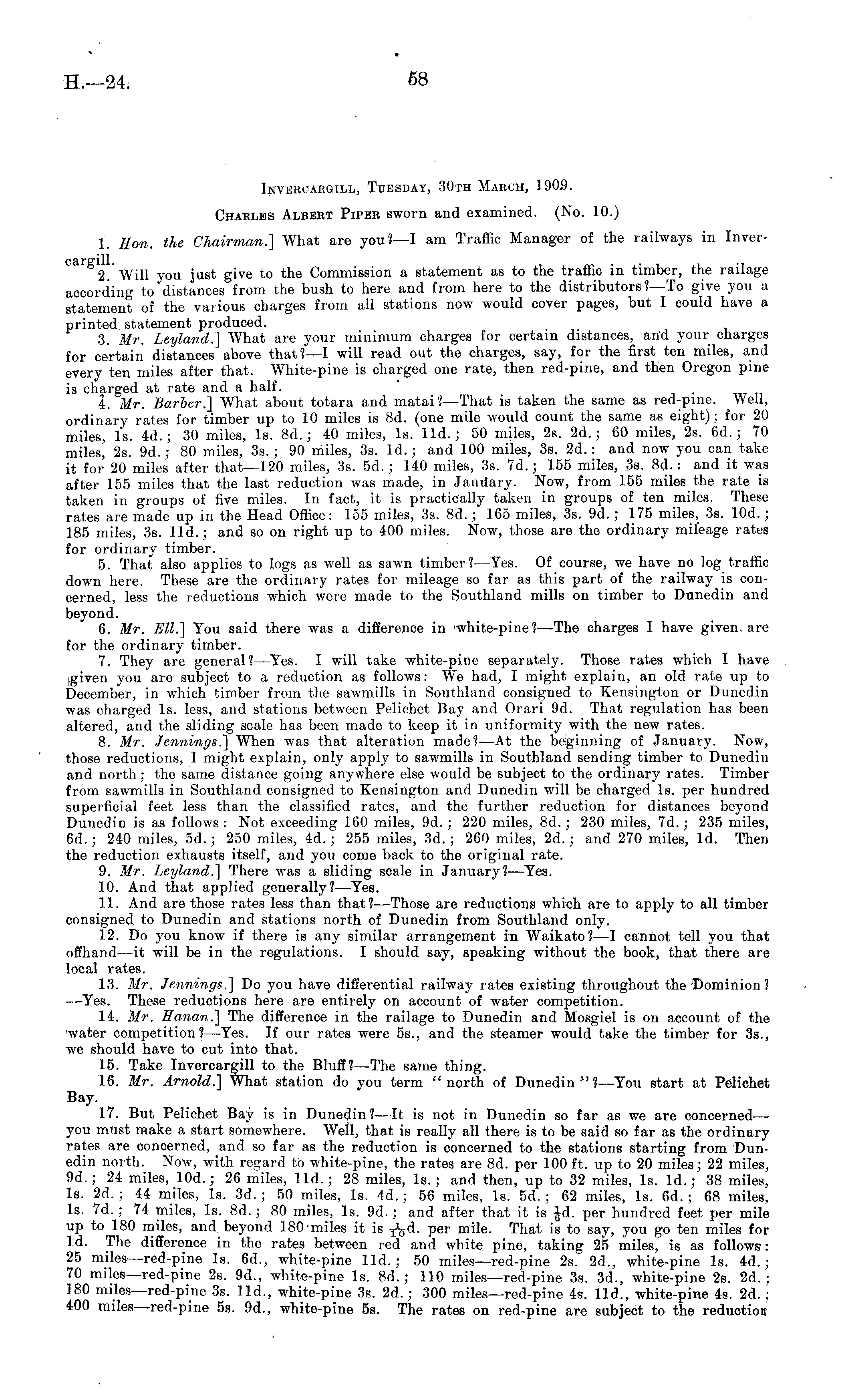 Inveucargill, Tuesday, 30th March, 190.9. Charles Albert Piper sworn and examined. (No. 10.) 1. Hon. the Chairman.] What are you? —I am Traffic Manager of the railways in Inverc&rffill. 2. Will you just give to the Commission a statement as to the traffic in timber, the railage according to distances from the bush to here and from here to the distributors? —To give you a statement of the various charges from all stations now would cover pages, but I could have a printed statement produced. 3. Mr. Leyland.] What are your minimum charges for certain distances, and your charges for certain distances above that?—l will read out the charges, say, for the first ten miles, and every ten miles after that. White-pine is charged one rate, then red-pine, and then Oregon pine is charged at rate and a half. 4. Mr. Barber.] What about totara and matai ?—That is taken the same as red-pme. Well, ordinary rates for timber up to 10 miles is Bd. (one mile would count the same as eight); for 20 miles, Is. 4d.; 30 miles, Is. Bd.; 40 miles, Is. lid.; 50 miles, 2s. 2d.; 60 miles, 2s. 6d.; 70 miles, 2s. 9d.; 80 miles, 35.; 90 miles, 3s. Id.; and 100 miles, 3s. 2d.: and now you can take it for 20 miles after that —120 miles, 3s. 5d.; 140 miles, 3s. 7d.; 155 miles, 3s. Bd.: and it was after 155 miles that the last reduction was made, in January. Now, from 155 miles the rate is taken in groups of five miles. In fact, it is practically taken in groups of ten miles. These rates are made up in the Head Office: 155 miles, 3s. Bd.; 165 miles, 3s. 9d.; 175 miles, 3s. 10d.; 185 miles, 3s. lid.; and so on right up to 400 miles. Now, those are the ordinary mileage rates for ordinary timber. 5. That also applies to logs as well as sawn timber? —Yes. Of course, we have no log traffic down here. These are the ordinary rates for mileage so far as this part of the railway is concerned, less the reductions which were made to the Southland mills on timber to Dunedin and beyond. 6. Mr. Ell.] You said there was a difference in white-pine?— The charges I have given are for the ordinary timber. 7. They are general? —Yes. I will take white-pine separately. Those rates which I have given you are subject to a reduction as follows: We had, I might explain, an old rate up to December, in which timber from the sawmills in Southland consigned to Kensington or Dunedin was charged Is. less, and stations between Pelichet Bay and Orari 9d. That regulation has been altered, and the sliding scale has been made to keep it in uniformity with the new rates. 8. Mr. Jennings.] When was that alteration made?—At the beginning of January. Now, those reductions, I might explain, only apply to sawmills in Southland sending timber to Dunedin and north; the same distance going anywhere else would be subject to the ordinary rates. Timber from sawmills in Southland consigned to Kensington and Dunedin will be charged Is. per hundred superficial feet less than the classified rates, and the further reduction for distances beyond Dunedin is as follows : Not exceeding 160 miles, 9d.; 220 miles, Bd.; 230 miles, 7d.; 235 miles, 6d.; 240 miles, 5d.; 250 miles, 4d.; 255 miles, 3d.; 260 miles, 2d.; and 270 miles, Id. Then the reduction exhausts itself, and you come back to the original rate. 9. Mr. Leyland.] There was a sliding scale in January?— Yes. 10. And that applied generally?— Yes. 11. And are those rates less than that?— Those are reductions which are to apply to all timber consigned to Dunedin and stations north of Dunedin from Southland only. 12. Do you know if there is any similar arrangement in Waikato? —I cannot tell you that offhand—it will be in the regulations. I should say, speaking without the book, that there are local rates. 13. Mr. Jennings.] Do you have differential railway rates existing throughout the Dominion? —Yes. These reductions here are entirely on account of water competition. 14. Mr. Hanan.] The difference in the railage to Dunedin and Mosgiel is on account of the ■water competition?— Yes. If our rates were 55., and the steamer would take the timber for 35., we should have to cut into that. 15. Take Invercargill to the Bluff?— The same thing. 16. Mr. Arnold.] What station do you term "north of Dunedin"? —You start at Pelichet Bay. 17. But Pelichet Bay is in Dunedin?—lt is not in Dunedin so far as we are concerned— you must make a start somewhere. Well, that is really all there is to be said so far as the ordinary rates are concerned, and so far as the reduction is concerned to the stations starting from Dunedin north. Now, with regard to white-pine, the rates are Bd. per 100 ft. up to 20 miles; 22 miles, 9d.; 24 miles, 10d.; 26 miles, lid.; 28 miles, Is.; and then, up to 32 miles, Is. Id.; 38 miles, Is. 2d.; 44 miles, Is. 3d.; 50 miles, Is. 4d.; 56 miles, Is. sd. ; 62 miles, Is. 6d. ; 68 miles, Is. 7d.; 74 miles, Is. Bd.; 80 miles, Is. 9d.; and after that it is fd. per hundred feet per mile up to 180 miles, and beyond ISO-miles it is per mile. That is to say, you go ten miles for Id. The difference in the rates between red and white pine, taking 25 miles, is as follows: 25 miles—red-pine Is. 6d., white-pine lid.; 50 miles—red-pine 2s. 2d., white-pine Is. 4d.; 70 miles—red-pine 2s. 9d., white-pine Is. Bd.; 110 miles—red-pine 3s. 3d., white-pine 2s. 2d.; 180 miles—red-pine 3s. lid., white-pine 3s. 2d. ; 300 miles—red-pine 4s. lid., white-pine 4s. 2d. ; 400 miles—red-pine ss. 9d., white-pine ss. The rates on red-pine are subject to the reductioic