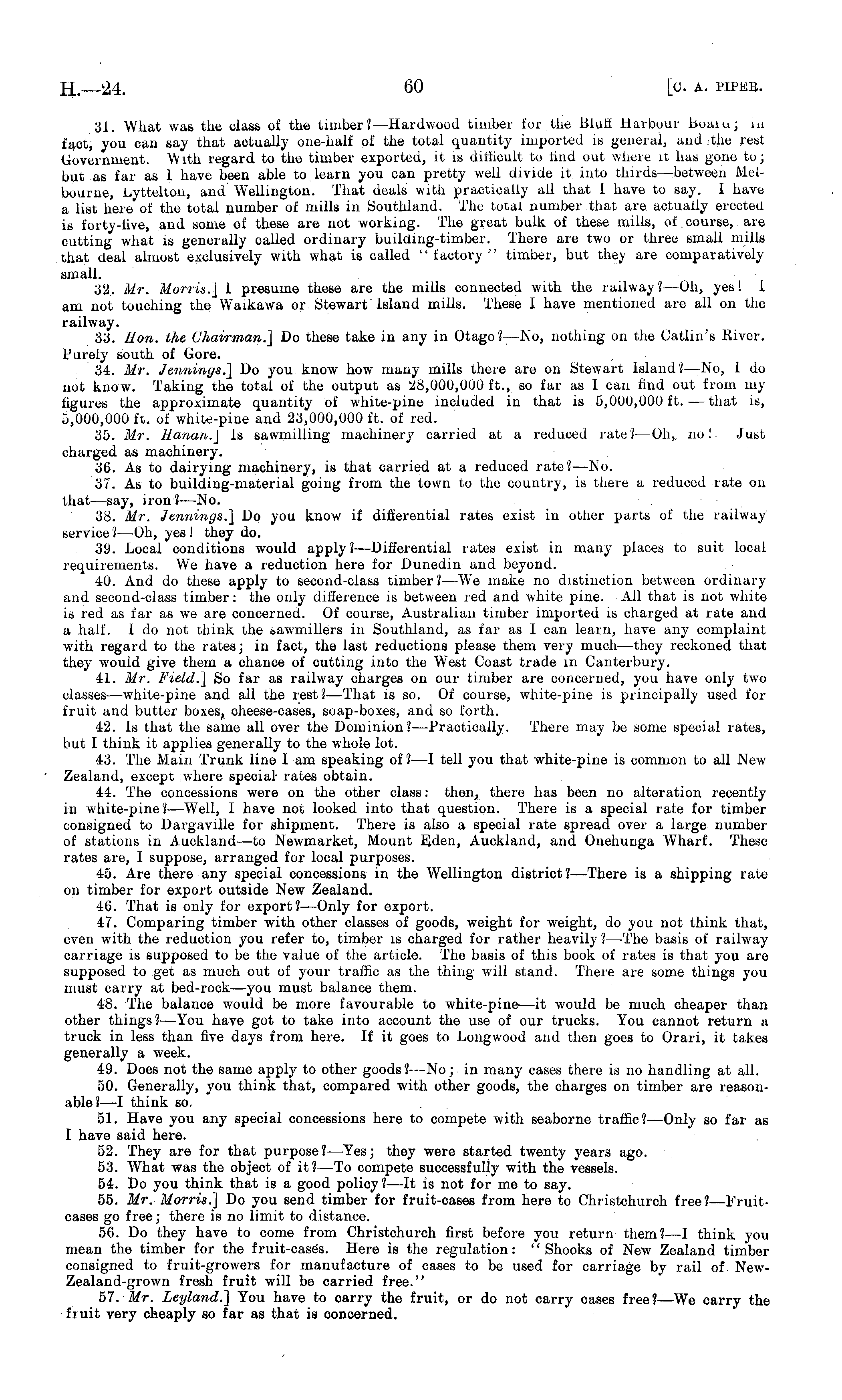 31. What was tlie class of the timber! —Hardwood timber for the Bluff Harbour boaiu; m fact, you can say that actually one-half of the total quantity imported is general, and the rest Government. With regard to the timber exported, it is difficult to rind out where it has gone to; but as far as 1 have been able to learn you can pretty well divide it into thirds —between Melbourne, liyttelton, and Wellington. That deals with practically ail that 1 have to say. 1 have a list here of the total number of mills in Southland. The total number that are actually erected is forty-live, and some of these are not working. The great bulk of these nulls, of course, are cutting what is generally called ordinary building-timber. There are two or three small mills that deal almost exclusively with what is called "factory" timber, but they are comparatively small. 32. Mr. Morris.] 1 presume these are the mills connected with the railway ? —Oh, yes! 1 am not touching the Waikawa or Stewart Island mills. These 1 have mentioned are all on the railway. 33. Eon. the. Chairman.] Do these take in any in Otago? —No, nothing on the Catlin's River. Purely south of Gore. 34. Mr. Jennings.] Do you know how many mills there are on Stewart Island? —No, 1 do not know. Taking the total of the output as 28,000,000 ft., so far as 1 can find out from my figures the approximate quantity of white-pine included in that is 5,000,000 ft. — that is, 5,000,000 ft. of white-pine and 23,000,000 ft. of red. 35. Mr. llanan.] Is sawmilling machinery carried at a reduced rate? —Oh,, no! Just charged as machinery. 36. As to dairying machinery, is that carried at a reduced rate?— No. 37. As to building-material going from the town to the country, is there a reduced rate on that—say, iron?— No. 38. Mr. Jennings.] Do you know if differential rates exist in other parts of the railway service ?—Oh, yes I they do. 39. Local conditions would apply? —Differential rates exist in many places to suit local requirements. We have a reduction here for Dunedin and beyond. 40. And do these apply to second-class timber?—We make no distinction between ordinary and second-class timber: the only difference is between red and white pine. All that is not white is red as far as we are concerned. Of course, Australian timber imported is charged at rate and a half. Ido not think the sawmillers in Southland, as far as 1 can learn, have any complaint with regard to the rates; in fact, the last reductions please them very much —they reckoned that they would give them a chance of cutting into the West Coast trade m Canterbury. 41. Mr. Field.] So far as railway charges on our timber are concerned, you have only two classes —white-pine and all the rest? —That is so. Of course, white-pine is principally used for fruit and butter boxes 4 cheese-cases, soap-boxes, and so forth. 42. Is that the same all over the Dominion?— Practically. There may be some special rates, but I think it applies generally to the whole lot. 43. The Main Trunk line I am speaking of? —I tell you that white-pine is common to all New Zealand, except where special rates obtain. 44. The concessions were on the other class: then, there has been no alteration recently in white-pine? —Well, 1 have not looked into that question. There is a special rate for timber consigned to Dargaville for shipment. There is also a special rate spread over a large number of stations in Auckland —to Newmarket, Mount Eden, Auckland, and Onehunga Wharf. These rates are, 1 suppose, arranged for local purposes. 45. Are there any special concessions in the Wellington district I— There is a shipping rate on timber for export outside New Zealand. 46. That is only for export?— Only for export. 47. Comparing timber with other classes of goods, weight for weight, do you not think that, even with the reduction you refer to, timber is charged for rather heavily? —The basis of railway carriage is supposed to be the value of the article. The basis of this book of rates is that you are supposed to get as much out of your traffic as the thing will stand. There are some things you must carry at bed-rock —-you must balance them. 48. The balance would be more favourable to white-pine —it would be much cheaper than other things ?—You have got to take into account the use of our trucks. You cannot return a truck in less than five days from here. If it goes to Longwood and then goes to Orari, it takes generally a week. 49. Does not the same apply to other goods?-—No; in many cases there is no handling at all. 50. Generally, you think that, compared with other goods, the charges on timber are reasonable?—l think so. 51. Have you any special concessions here to compete with seaborne traffic?— Only so far as I have said here. 52. They are for that purpose?— Yes; they were started twenty years ago. 53. What was the object of it? —To compete successfully with the vessels. 54. Do you think that is a good policy?—lt is not for me to say. 55. Mr. Morris.] Do you send timber for fruit-cases from here to Christchurch free?—Fruitcases go free; there is no limit to distance. 56. Do they have to come from Christchurch first before you return them?—l think you mean the timber for the fruit-cases. Here is the regulation: " Shooks of New Zealand timber consigned to fruit-growers for manufacture of cases to be used for carriage by rail of New-Zealand-grown fresh fruit will be carried free." 57. Mr. Leyland.] You have to carry the fruit, or do not carry cases free?—We carry the fruit very cheaply so far as that is concerned.