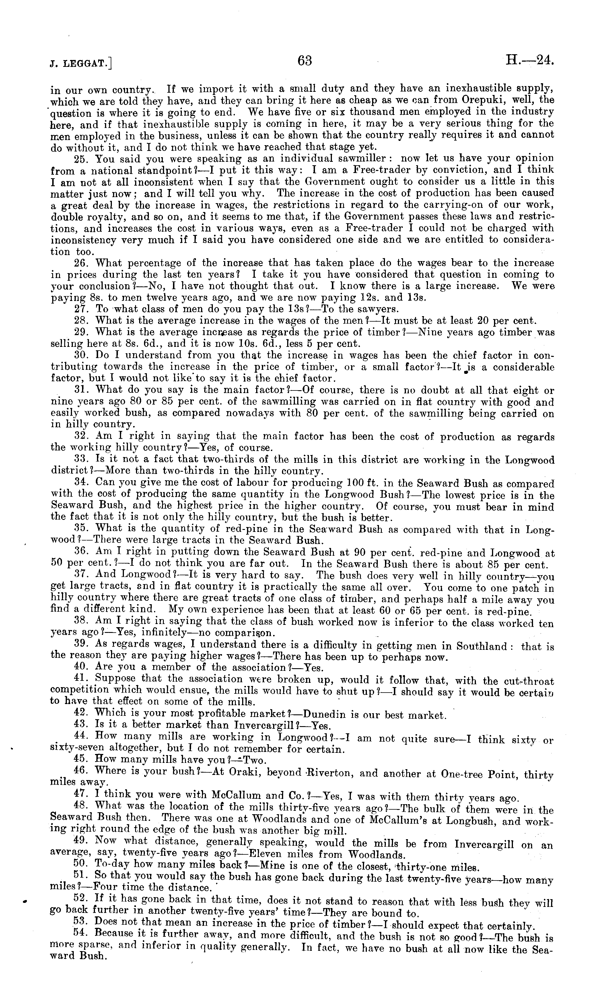 in our own country. If we import it with a small duty and they have an inexhaustible supply, which we are told they have, and they can bring it here as cheap as we can from Orepuki, well, the question is where it is going to end. We have five or six thousand men employed in the industry here, and if that inexhaustible supply is coming in here, it may be a very serious thing for the men employed in the business, unless it can be shown that the country really requires it and cannot do without it, and I do not think we have reached that stage yet. 25. You said you were speaking as an individual sawmiller : now let us have your opinion from a national standpoint?—l put it this way: lam a Free-trader by conviction, and I think I am not at all inconsistent when I say that the Government ought to consider us a little in this matter just now; and I will tell you why. The increase in the cost of production has been caused a great deal by the increase in wages, the restrictions in regard to the carrying-on of our work, double royalty, and so on, and it seems to me that, if the Government passes these laws and restrictions, and increases the cost in various ways, even as a Free-trader I could not be charged with inconsistency very much if I said you have considered one side and we are entitled to consideration too. 26. What percentage of the increase that has taken place do the wages bear to the increase in prices during the last ten years? I take it you have considered that question in coming to your conclusion? —No, I have not thought that out. I know there is a large increase. We were paying Bs. to men twelve years ago, and we are now paying 12s. and 13s. 27. To what class of men do you pay the 13s?—To the sawyers. 28. What is the average increase in the wages of the men?—lt must be at least 20 per cent. 29. What is the average increase as regards the price of timber?— Nine years ago timber was selling here at Bs. 6d., and it is now 10s. 6d., less 5 per cent. 30. Do I understand from you that the increase in wages has been the chief factor in contributing towards the increase in the price of timber, or a small factor ?—lt # is a considerable factor, but I would not like to say it is the chief factor. 31. What do you say is the main factor?—Of course, there is no doubt at all that eight or nine years ago 80 or 85 per cent, of the sawmilling was carried on in flat country with good and easily worked bush, as compared nowadays with 80 per cent, of the sawmilling being carried on in hilly country. 32. Am I right in saying that the main factor has been the cost of production as regards the working hilly country?— Yes, of course. 33. Is it not a fact that two-thirds of the mills in this district are working in the Longwood district? —More than two-thirds in the hilly country. 34. Can you give me the cost of labour for producing 100 ft. in the Seaward Bush as compared with the cost of producing the same quantity in the Longwood Bush?— The lowest price is in the Seaward Bush, and the highest price in the higher country. Of course, you must bear in mind the fact that it is not only the hilly country, but the bush is better. 35. What is the quantity of red-pine in the Seaward Bush as compared with that in Longwood ?—There were large tracts in the Seaward Bush. 36. Am I right in putting down the Seaward Bush at 90 per cent, red-pine and Longwood at 50 per cent. ?—I do not think you are far out. In the Seaward Bush there is about 85 per cent. 37. And Longwood?—lt is very hard to say. The bush does very well in hilly country—you get large tracts, and in flat country it is practically the same all over. You come to one patch in hilly country where there are great tracts of one class of timber, and perhaps half a mile away you find a different kind. My own experience lias been that at least 60 or 65 per cent, is red-pine. 38. Am I right in saying that the class of bush worked now is inferior to the class worked ten years ago?— Yes, infinitely—no comparison. 39. As regards wages, I understand there is a difficulty in getting men in Southland : that is the reason they are paying higher wages?— There has been up to perhaps now. 40. Are you a member of the association ?—Yes. 41. Suppose that the association were broken up, would it follow that, with the cut-throat competition which would ensue, the mills would have to shut up ?—I should say it would be certain to have that effect on some of the mills. 42. Which is your most profitable market?—Dunedin is our best market. 43. Is it a better market than Invercargill?—Yes. 44. How many mills are working in Longwood?-—I am not quite sure—l think sixty or sixty-seven altogether, but I do not remember for certain. 45. How many mills have you?— Two. 46. Where is your bush?—At Oraki, beyond Eiverton, and another at One-tree Point thirty miles away. 47. I think you were with McCallum and Co. ?—Yes, I was with them thirty years ago. 48. What was the location of the mills thirty-five years ago?— The bulk of them were in the Seaward Bush then. There was one at Woodlands and one of McCallum's at Longbush and working right round the edge of the bush was another big mill. 49. Now what distance, generally speaking, would the mills be from Invercargill on an average, say, twenty-five years ago?— Eleven miles from Woodlands. 50. To-day how many miles back?— Mine is one of the closest, thirty-one miles. 51. So that you would say the bush has gone back during the last twenty-five years—how many miles ?—Four time the distance. ' 52 If it has gone back in that time, does it not stand to reason that with less bush they will go back further m another twenty-five years' time?— They are bound to. 53. Does notthat mean an increase in the price of timber?—l should expect that certainly 54. Because it is further away, and more difficult, find the bush is not so good?— The bush is more sparse, and inferior in quality generally.