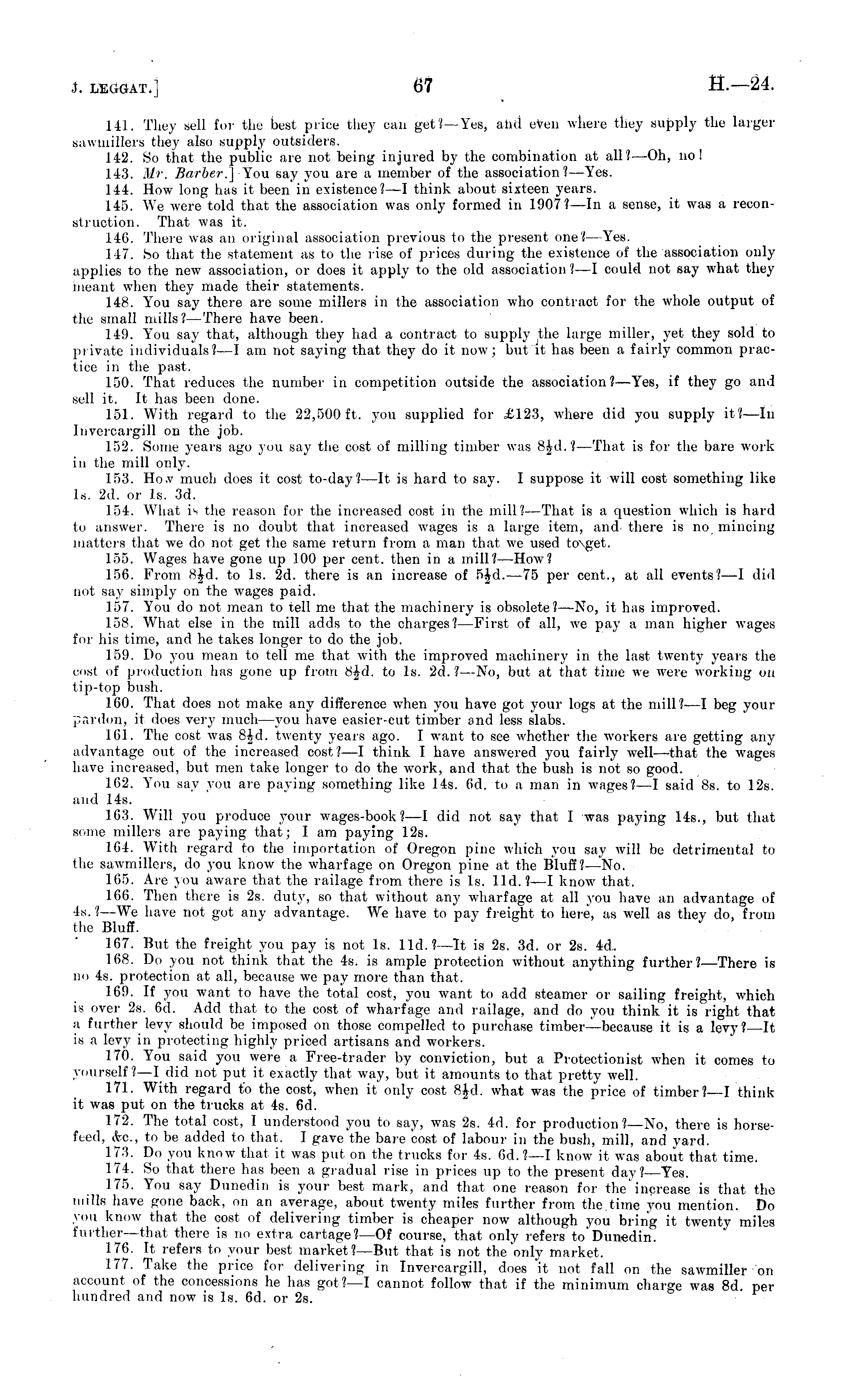 141. They sell for the best price they can get?— Yes, a lid even where they supply the larger gawmillerg they also supply outsiders. 142. So that the public are not being injured by the combination at all? —Oh, no! 143. Mr. Barber.\ You say you are a member of the association? —Yes. 144. How long has it been in existence? —I think about sixteen years. 145. We were told that the association was only formed in 1907?—1n a sense, it was a reconstruction. That was it. 146. There was an original association previous to the present one?— Yes. 147. So that the statement as to the rise of prices during the existence of the association only applies to the new association, or does it apply to the old association? —I could not say what they meant when they made their statements. 148. You say there are some millers in the association who contract for the whole output of the small mills? —There have been. 149. You say that, although they had a contract to supply the large miller, yet they sold to private individuals? —I am not saying that they do it now; but It has been a fairly common practice in the past. 150. That reduces the number in competition outside the association?— Yes, if they go and sell it. It lias been done. I'll. With regard to the 22,500 ft. you supplied for £123, where did you supply it?—ln Invercargill on the job. 152. Some years ago you say the cost of milling timber was ?—That is for the bare work in the mill only. 153. Ho.v much does it cost to-day?—lt is hard to say. I suppose it will cost something like Iβ. 2d. or Is. 3d. 154. What is the reason for the increased cost in the mill?— That is a question which is hard to answer. There is no doubt that increased wages is a large item, and there is no mincing matters that we do not get the same return from a man that we used to\get. ].">•"). Wages have gone up 100 per cent, then in a mill?— How? 156. From B£d. to Is. 2d. there is an increase of 5Jd. —75 per cent., at all events?—l did not say simply on the wages paid. J 57. You do not mean to tell me that the machinery is obsolete? —No, it has improved. 158. What else in the mill adds to the charges?— First of all, we pay a man higher wages for his time, and he takes longer to do the job. 159. Do you mean to tell me that with the improved machinery in the last twenty years the cost of production has gone up from Bjd. to Is. 2d. ?—No, but at that time we were working on tip-top bush. 160. That does not make any difference when you have got your logs at the mill?—I beg your pardon, it does very much—you have easier-cut timber end less slabs. 161. The cost was BJd. twenty years ago. I want to see whether the workers are getting any advantage out of the increased cost?—l think I have answered you fairly well—that the wages have increased, but men take longer to do the work, and that the bush is not so good. 162. You say you are paying something like 14s. 6d. to a man in wages?—l said Bs. to 12s. and 14s. 163. Will you produce your wages-book? —I did not say that I was paying 145., but that gome millers are paying that; I am paying 12s. 164. With regard to the importation of Oregon pine which you say will be detrimental to the sawmillcrs, do you know the wharfage on Oregon pine at the Bluff?— No. 165. Are you aware that the railage from there is Is. lid. ?—I know that. 166. Then there is 2s. duty, so that without any wharfage at all you have an advantage of 4s.?—We have not got any advantage. We have to pay freight to here, as well as they do, from the Bluff. 167. But the freight you pay is not Is. lid.?—lt is 2s. 3d. or 2s. 4d. 168. Do you not think that the 4s. is ample protection without anything further?— There is no 4s. protection at all, because we pay more than that. 169. If you want to have the total cost, you want to add steamer or sailing freight, which is over 2s. 6d. Add that to the cost of wharfage and railage, and do you think it is right that a further levy should be imposed on those compelled to purchase timber—because it is a levy?—lt is a levy in protecting highly priced artisans and workers. 170. You said you were a Free-trader by conviction, but a Protectionist when it comes to yourself ?—I did not put it exactly that way, but it amounts to that pretty well. 171. With regard to the cost, when it only cost B|d. what was the price of timber?—l think it was put on the trucks at 4s. 6d. 172. The total cost, I understood you to say, was 2s. 4d. for production?—No, there is horsefeed, eVe, to be added to that. I gave the bare 'cost of labour in the bush, mill, and yard. 173. Do you know that it was put on the trucks for 4s. 6d. ?—I know it was about that time. 174. So that there has been a gradual rise in prices up to the present day?— Yes. 175. You say Dunedin is your best mark, and that one reason for the'increase is that the mills have gone back, on an average, about twenty miles further from the time you mention. Do you know that the cost of delivering timber is cheaper now although you bring it twenty miles further—that there is no extra cartage?—Of course, that only refers to Dunedin. 176. It refers to your best market?— But that is not the only market. 177. Take the price for delivering in Invercargill, does "it not fall on the sawmiller on account of the concessions he has got?—l cannot follow that if the minimum charge was Bd. per hundred and now is Is. 6d. or 2s.