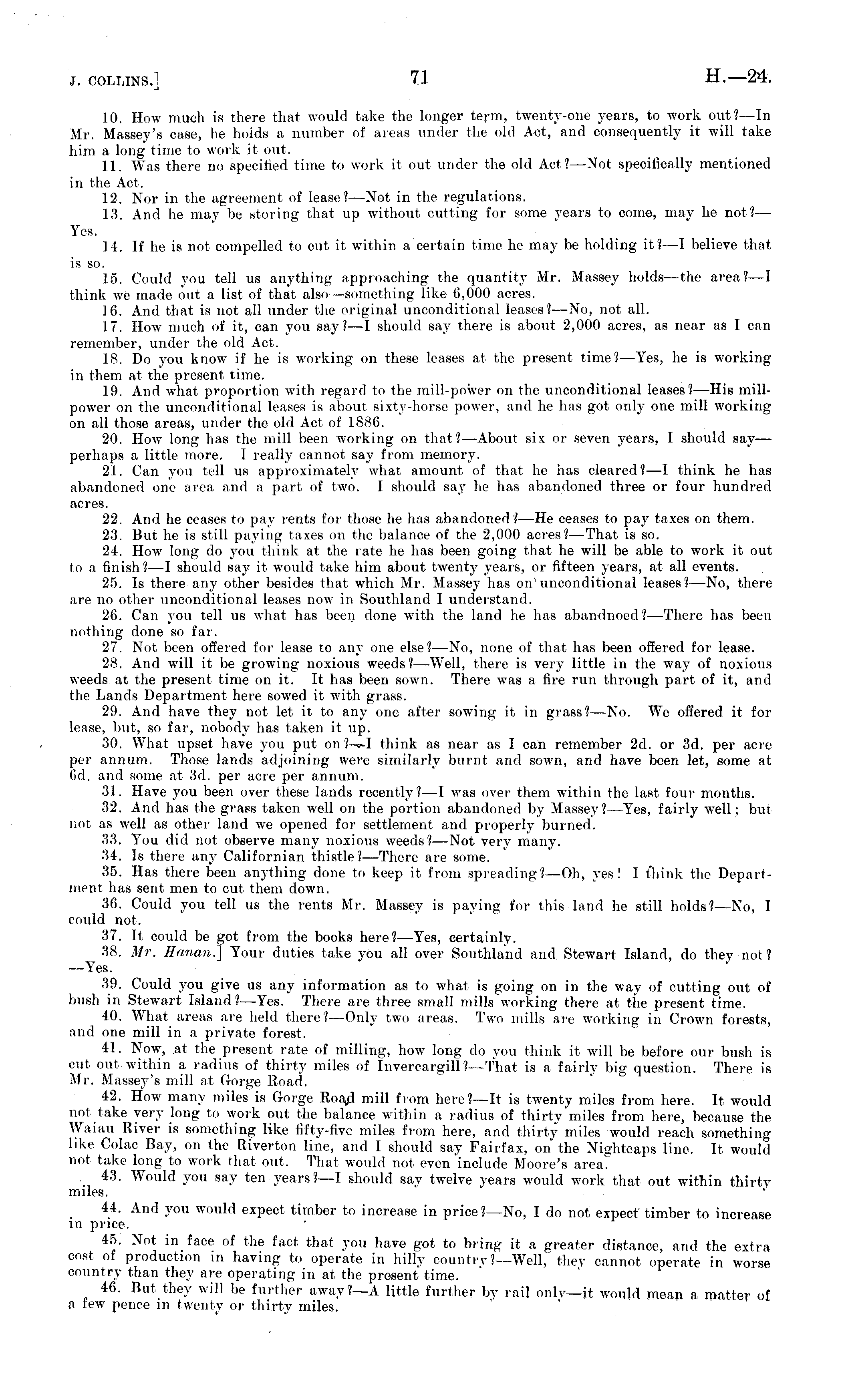 ](). How mueli is there that would take the longer term, twenty-one years, to work out?—ln Mr. Massey's case, he holds a number of areas under the old Act, and consequently it will take him a long time to work it out. 11. Was there no specified time to work it out under the old Act?— Not specifically mentioned in the Act. 12. Nor in the agreement of lease? —Not in the regulations. 13. And he may be storing that up without cutting for some years to come, may he not?— Yes. 14. If he is not compelled to cut it within a certain time he may be holding it?—l believe that is so. 15. Could you tell us anything approaching the quantity Mr. Massey holds —the area?—l think we made out a list of that also —something like 6,000 acres. 16. And that is not all under the original unconditional leases? —No, not all. 17. How much of it, can you say? —I should say there is about 2,000 acres, as near as I can remember, under the old Act. 18. Do you know if he is working on these leases at the present time? —Yes, he is working in them at the present time. 19. And what proportion with regard to the mill-power on the unconditional leases?— His millpower on the unconditional leases is about sixty-horse power, and he has got onh - one mill working on all those areas, under the old Act of 1886. 20. How long has the mill been working on that? —About six or seven years, I should say — perhaps a little more. I really cannot say from memory. 21. Can you tell us approximately what amount of that he lias cleared? —I think he has abandoned one area and a part of two. I should say lie lias abandoned three or four hundred acres. 22. And he ceases to pay rents for those he has abandoned? —He ceases to pay taxes on them. 2.'i. But he is still paying taxes on the balance of the 2,000 acres?— That is so. 24. How long do you think at the rate he has been going that he will be able to work it out to a finish?—l should say it would take him about twenty years, or fifteen years, at all events. 25. Is there any other besides that which Mr. Massey lias on unconditional leases?—No, there are no other unconditional leases now in Southland I understand. 26. Can you tell us what has been done with the land he has abandnoed? —There has been nothing done so far. 27. Not been offered for lease to any one else? —No, none of that has been offered for lease. 28. And will it be growing noxious weeds?— Well, there is very little in the way of noxious weeds at the present time on it. It has been sown. There was a fire run through part of it, and the Lands Department here sowed it with grass. 29. And have they not let it to any one after sowing it in grass? —No. We offered it for lease, but, so far, nobody has taken it up. 30. What upset have you put on think as near as I can remember 2d. or 3d. per acre per annum. Those lands adjoining were similarly burnt and sown, and have been let, some at fid. and some at 3d. per acre per annum. 31. Have you been over these lands recently? —I was over them within the last four months. 32. And has the grass taken well on the portion abandoned by Massey?—Yes, fairly well; but not as well as other land we opened for settlement and properly burned. 33. You did not observe many noxious weeds? —Not very many. 34. Is there any Californian thistle? —There are some. 35. Has there been anything done to keep it from spreading? —Oh, yes! I think the Department has sent men to cut them down. 36. Could you tell us the rents Mr. Massey is paying for this land he still holds?—No, I could not. 37. It could be got from the books here?— Yes, certainly. 38. Mr. Hanan.) Your duties take you all over Southland and Stewart Island, do they not? —Yes. 39. Could you give us any information as to what is going on in the way of cutting out of bush in Stewart Island?— Yes. There are three small mills working there at the present time. 40. What areas are held there?— Only two areas. Two mills are working in Crown forests, and one mill in a private forest. 41. Now, at the present rate of milling, how long do you think it will be before our bush is cut out within a radius of thirty miles of Tnvercargill ?—That is a fairly big question. There is Mr. .Massey's mill a< Gorge Road. 42. How many miles is Gorge Road mill from here? —It is twenty miles from here. It would not take very long to work out the balance within a radius of thirty miles from here, because the Waiau River is something like fifty-five miles from here, and thirty miles would reach something like Colac Bay, on the Riverton line, and I should say Fairfax, on' the Nightcaps line. It would not take long to work that out. That would not even include Moore's area. 43. Would you say ten years?—l should say twelve years would work that out within thirty miles. 44. And you would expect timber to increase in price?—No, Ido not expect timber to increase in price. 45. Not in face of the fact that you have got to bring it a greater distance, and the extra cost of production in having to operate in hilly country?— Well, they cannot operate in worse country than they are operating in at the present time. 46. But they will be further away?—A little further by rail only—it would mean a matter of a few pence in twenty or thirty miles.