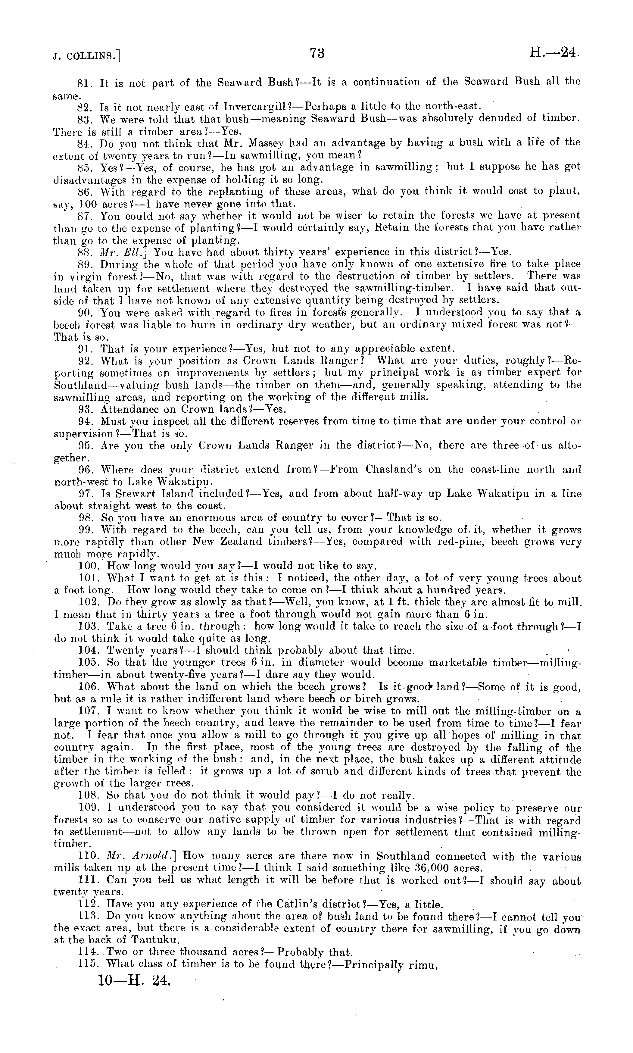 81. It is not part of the Seaward Bush? —It is a continuation of the Seaward Bush all the same. 82. Is it not nearly east of Invercargill?—Perhaps a little to the north-east. 83. We were told that that bush —meaning Seaward Bush—was absolutely denuded of timber. There is still a timber area? —Yes. 84. Do you not think that Mr. Massey had an advantage by having a bush with a life of the extent of twenty years to run ?— ln sawmilling, you mean ? 85. Yes?— Yes, of course, he has got an advantage in sawmilling; but I suppose he has got disadvantages in the expense of holding it so long. 86. With regard to the replanting of these areas, what do you think it would cost to plant, say, 100 acres?—l have never gone into that. 87. You could not say whether it would not be wiser to retain the forests we have at present than go to the expense of planting?—l would certainly say, lletain the forests that you have rather than go to the expense of planting. 88. Mr. EH.] You have had about thirty years' experience in this district? —Yes. 89. During the whole of that period you have only known of one extensive fire to take place in virgin forest? —No, that was with regard to the destruction of timber by settlers. There was land taken up for settlement where they destroyed the sawmilling-tiniber. I have said that outside of that I have not known of any extensive quantity being destroyed by settlers. 90. You were asked with regard to fires in forest's generally. 1 understood you to say that a beech forest was liable to burn in ordinary dry weather, but an ordinary mixed forest was not?— That is so. 91. That is your experience? —Yes, but not to any appreciable extent. 92. What is your position as Crown Lands Hanger? What are your duties, roughly?— Reporting sometimes on improvements by settlers; but my principal work is as timber expert for Southland—valuing bush lands—the timber on them—and, generally speaking, attending to the sawmilling areas, and reporting on the working of the different mills. 93. Attendance on Crown lands?— Yes. 94. Must you inspect all the different reserves from time to time that are under your control or supervision?— That is so. 95. Are you the only Crown Lands Ranger in the district?—No, there are three of us altogether. 96. Where does your district extend from? —From Chasland's on the coast-line north and north-west to Lake Wakatipu. 97. Is Stewart Island included?— Yes, and from about half-way up Lake Wakatipu in a line about straight west to the coast. 98. So you have an enormous area of country to cover?— That is so. 99. With regard to the beech, can you tell us, from your knowledge of it, whether it grows more rapidly than other New Zealand timbers?— Yes, compared with red-pine, beech grows very much more rapidly. 100. How long would you say?—l would not like to say. 101. What I want to get at is this : I noticed, the other day, a lot of very young trees about a foot long. How long would they take to come on?—I think about a hundred years. 102. Do they grow as slowly as that?— Well, you know, at 1 ft. thick they are almost fit to mill. I mean that in thirty years a tree a foot through would not gain more than 6 in. 103. Take a tree 6 in. through : how long would it take to reach the size of a foot through?—l do not think it would take quite as long. 104. Twenty years?—l should think probably about that time. 105. So that the younger trees 6 in. in diameter would become marketable timber—millingtimber —in about twenty-five years?—l dare say they would. 106. What about the land on which the beech grows? Is it good , land? —Some of it is good, but as a rule it is rather indifferent land where beech or birch grows. 107. I want to know whether you think it would be wise to mill out the milling-timber on a large portion of the beech country, and leave the remainder to be used from time to time?—l fear not. I fear that once you allow a mill to go through it you give up all hopes of milling in that country again. In the first place, most of the young trees are destroyed by the falling of the timber in the working of the bush : and, in the next place, the bush takes up a different attitude after the timber is felled : it grows up a lot of scrub and different kinds of trees that prevent the growth of the larger trees. 108. So that you do not think it would pay?—l do not really. 109. I understood you to saj 7 that you considered it would be a wise policy to preserve our forests so as to conserve our native supply of timber for various industries? —That is with regard to settlement—not to allow any lands to be thrown open for settlement that contained millingtimber. 110. Mr. Arnold.'] How many acres are there now in Southland connected with the various mills taken up at the present time? —I think I said something like 36,000 acres. 111. Can you tell us what length it will be before that is worked out?—l should say about twenty years. 112. Have you any experience of the Catlin's district? —Yes, a little. 113. Do you know anything about the area of bush land to be found there?—l cannot tell you the exact area, but there is a considerable extent of country there for sawmilling, if you go down at the back of Tautuku. 114. Two or three thousand acres?— Probably that. 115. What class of timber is to be found there? —Principally rimu,