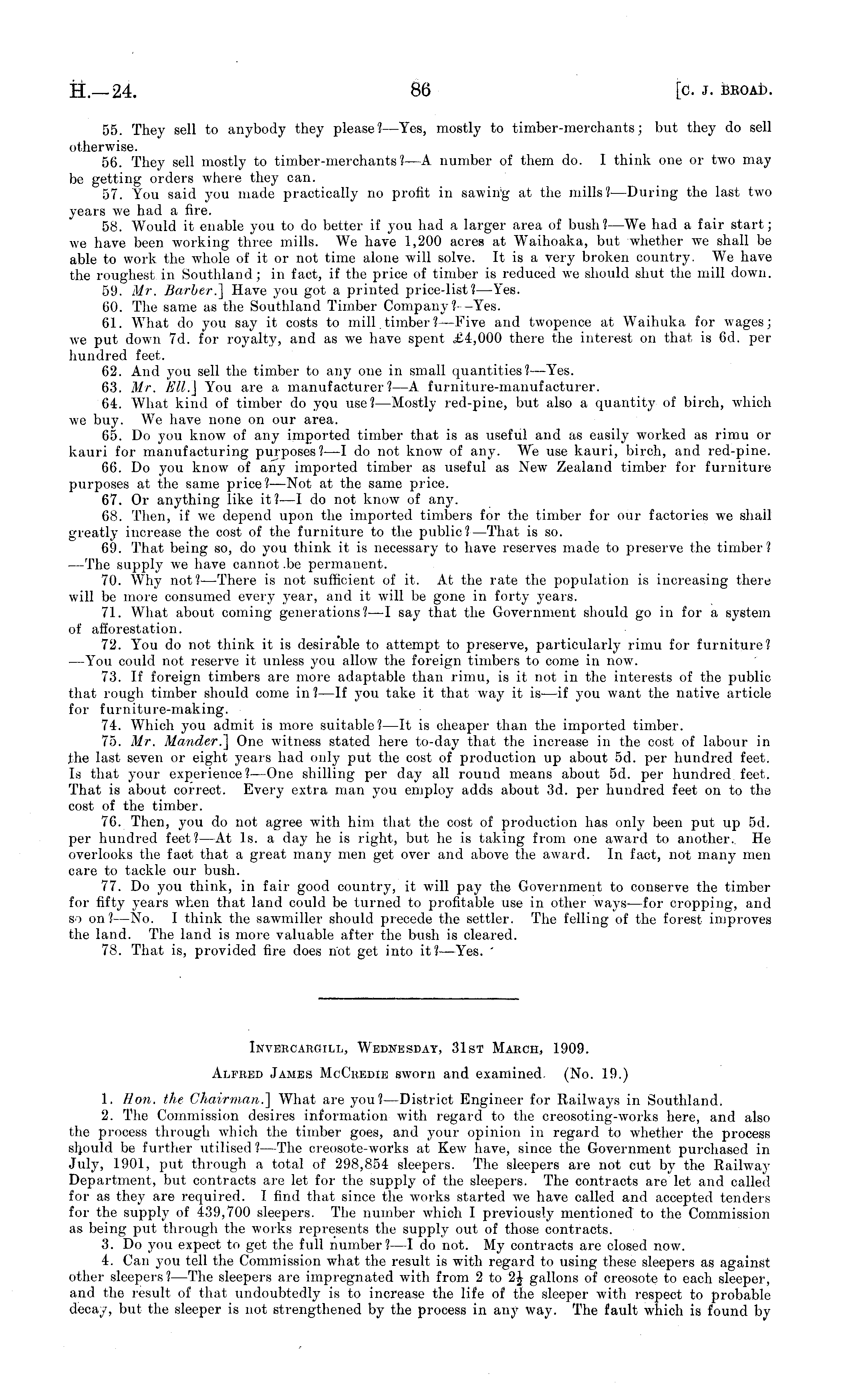 Invercargill, Wednesday, 31st March, 1909. Alfred James McCredie sworn and examined. (No. 19.) 1. Hon. the Chairman.] What are you?— District Engineer for Railways in Southland. 2. The Commission desires information with regard to the creosoting-works here, and also the process through which the timber goes, and your opinion in regard to whether the process should be further utilised ?—The creosote-works at Kew have, since the Government purchased in July, 1901, put through a total of 298,854 sleepers. The sleepers are not cut by the Railway Department, but contracts are let for the supply of the sleepers. The contracts are let and called for as they are required. I find that since the works started we have called and accepted tenders for the supply of 439,700 sleepers. The number which I previously mentioned to the Commission as being put through the works represents the supply out of those contracts. 3. Do you expect to get the full number?—l do not. My contracts are closed now. 4. Can you tell the Commission what the result is with regard to using these sleepers as against other sleepers?— The sleepers are impregnated with from 2to 1\ gallons of creosote to each sleeper, and the result of that undoubtedly is to increase the life of the sleeper with respect to probable decay, but the sleeper is not strengthened by the process in any way. The fault which is found by