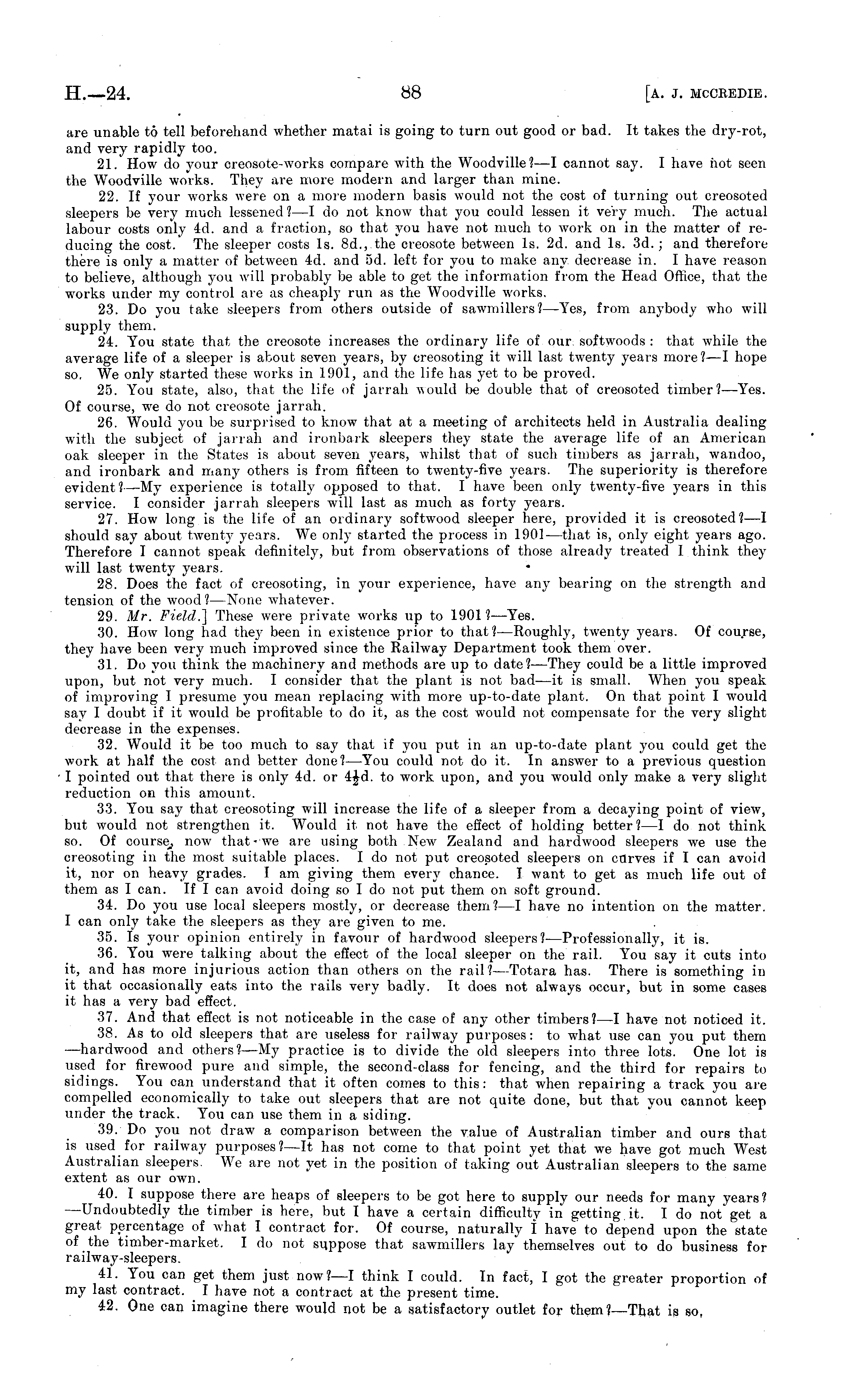 are unable to tell beforehand whether matai is going to turn out good or bad. It takes the dry-rot, and very rapidly too. 21. How do your creosote-works compare with the Woodville? —I cannot say. I have hot seen the Woodville works. They are more modern and larger than mine. 22. If your works were on a more modern basis would not the cost of turning out creosoted sleepers be very much lessened? —I do not know that you could lessen it very much. The actual labour costs only 4d. and a fraction, so that you have not much to work on in the matter of reducing the cost. The sleeper costs Is. Bd., the creosote between Is. 2d. and Is. 3d.; and therefore there is only a matter of between 4d. and sd. left for you to make any decrease in. I have reason to believe, although you will probably be able to get the information from the Head Office, that the works under my control are as cheaply run as the Woodville works. 23. Do you take sleepers from others outside of sawmillers I —Yes, from anybody who will supply them. 24. You state that the creosote increases the ordinary life of our softwoods : that while the average life of a sleeper is about seven years, by creosoting it will last twenty years more?—l hope so. We only started these works in 1901, and the life has yet to be proved. 25. You state, also, that the life of jarrah would be double that of creosoted timber?— Yes. Of course, we do not creosote jarrah. 26. Would you be surprised to know that at a meeting of architects held in Australia dealing with the subject of j.arrah and ironbark sleepers they state the average life of an American oak sleeper in the Stales is about seven years, whilst that of such timbers as jarrah, wandoo, and ironbark and many others is from fifteen to twenty-five years. The superiority is therefore evident?—My experience is totally opposed to that. I have been only twenty-five years in this service. I consider jarrah sleepers will last as much as forty years. 27. How long is the life of an ordinary softwood steeper here, provided it is creosoted? —I should say about twenty years. We only started the process in 1901—that is, only eight years ago. Therefore I cannot speak definitely, but from observations of those already treated I think they will last twenty years. 28. Does the fact of creosoting, in your experience, have any bearing on the strength and tension of the wood?— None whatever. 29. Mr. Field.] These were private works up to 1901 ? —Yes. 30. How long had they been in existence prior to that?— Roughly, twenty years. Of course, they have been very much improved since the Railwa) 7 Department took them over. 31. Do you think the machinery and methods are up to date?— They could be a little improved upon, but not very much. I consider that the plant is not bad—it is small. When you speak of improving I presume you mean replacing with more up-to-date plant. On that point I would say I doubt if it would be profitable to do it, as the cost would not compensate for the very slight decrease in the expenses. 32. Would it be too much to say that if you put in an up-to-date plant you could get the work at half the cost and better done? —You could not do it. In answer to a previous question I pointed out that there is only 4d. or to work upon, and you would only make a very slight reduction on this amount. 33. You say that creosoting will increase the life of a sleeper from a decaying point of view, but would not strengthen it. Would it not have the effect of holding better ? —I do not think so. Of now that-we are using both New Zealand and hardwood sleepers we use the creosoting in the most suitable places. I do not put creosoted sleepers on curves if I can avoid it, nor on heavy grades. I am giving them every chance. I want to get as much life out of them as I can. If I can avoid doing so Ido not put them on soft ground. 34. Do you use local sleepers mostly, or decrease them?—l have no intention on the matter. I can only take the sleepers as they are given to me. 35. Is your opinion entirely in favour of hardwood sleepers?— Professionally, it is. 36. You were talking about the effect of the local sleeper on the rail. You say it cuts into it, and has more injurious action than others on the rail?—Totara has. There is something in it that occasionally eats into the rails very badly. It does not always occur, but in some cases it has a very bad effect. 37. And that effect is not noticeable in the case of any other timbers?—l have not noticed it. 38. As to old sleepers that are useless for railway purposes: to what use can you put them —hardwood and others?—My practice is to divide the old sleepers into three lots. One lot is used for firewood pure and simple, the second-class for fencing, and the third for repairs to sidings. You can understand that it often comes to this: that when repairing a track you are compelled economically to take out sleepers that are not quite done, but that you cannot keep under the track. You can use them in a siding. 39. Do you not draw a comparison between the value of Australian timber and ours that is used for railway purposes?—lt has not come to that point yet that we have got much West Australian sleepers. We are not yet in the position of taking out Australian sleepers to the same extent as our own. 40. I suppose there are heaps of sleepers to be got here to supply our needs for many years? —Undoubtedly the timber is here, but I have a certain difficulty in getting it. I do not get a great percentage of what I contract for. Of course, naturally I have to depend upon the state of the timber-market. I do not suppose that sawmillers lay" themselves out to do business for railway-sleepers. 41. You can get them just now?—l think I could. In fact, I got the greater proportion of my last contract. I have not a contract at the present time. 42. One can imagine there would not be a satisfactory outlet for them?— That is so.
