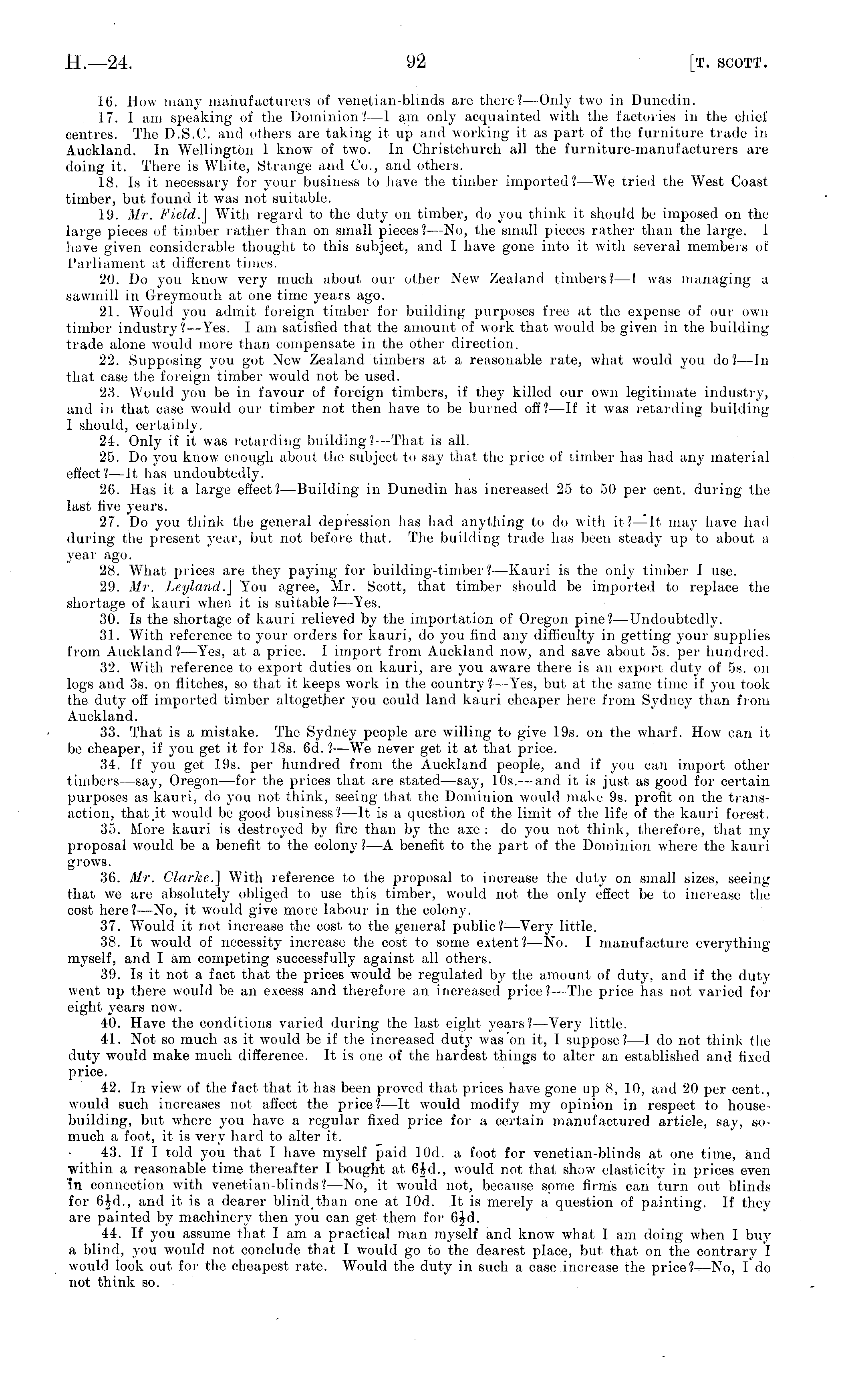 16. How many manufacturers of venetian-blinds are there? —Only two in Dunedin. 17. 1 am speaking of the Dominion? I am only acquainted with the factories in the chief centres. The D.S.C. and others are taking it up and working it as part of the furniture trade in Auckland. In Wellington 1 know of two. In Christchurch all the furniture-manufacturers are doing it. There is White, Strange and Co., and others. 18. Is it necessary for your business to have the timber imported?—We tried the West Coast timber, but found it was not suitable. 19. Mr. Field.'] With regard to the duty on timber, do you think it should be imposed on the large pieces of timber rather than on small pieces?—No, the small pieces rather than the large. 1 have given considerable thought to this subject, and 1 have gone into it with several members of Parliament at different times. 20. Do you know very much about our other New Zealand timbers? —1 was managing a sawmill in Greymouth a! one time years ago. 21. Would you admit foreign timber for building purposes free at the expense of our own timber industry?— Yes. 1 am satisfied that the amount of work that would be given in the building trade alone would more than compensate in the other direction. 22. Supposing you got New Zealand timbers at a reasonable rate, what would you do? —In that case the foreign timber would not be used. 2-' i. Would you be in favour of foreign timbers, if they killed our own legitimate industry, and in that case would our timber not then have to be burned off?—lf it was retarding building 1 should, certainly 24. Only if it was retarding building?— That is all. 25. Do you know enough about the subject to say that the price of timber has had any material effect?—lt has undoubtedly. 26. Has it a large effect? —Building in Dunedin has increased 25 to 50 per cent, during the last five years. 27. Do you think the general depression has had anything to do with it? —It may have had during the present year, but not before that. The building trade has been steady up to about a year ago. 28. What prices are they paying for building-timber?— Kauri is the only timber I use. 29. Mr. Leyland.] You agree, Mr. Scott, that timber should be imported to replace the shortage of kauri when it is suitable? —Yes. 30. Is the shortage of kauri relieved by the importation of Oregon pine?— Undoubtedly. 31. With reference to your orders for kauri, do }-ou find any difficulty in getting your sujiplies from Auckland?— Yes, at a price. I import from Auckland now, and save about ss. per hundred. 32. With reference to export duties on kauri, are you aware there is an export duty of ss. on logs and 3s. on flitches, so that it keeps work in the country?— Yes, but at the same time if you took the duty oil imported timber altogether you could land kauri cheaper here from Sydney than from Auckland. 33. That is a mistake. The Sydney people are willing to give 19s. on the wharf. How can it be cheaper, if you get it for 18s. 6d. I —We never get it at that price. 34. If you get 19s. per hundred from the Auckland people, and if you can import other timbers —say, Oregon—for the prices that are stated —say, 10s. —and it is just as good for certain purposes as kauri, do you not think, seeing that the Dominion would make 9s. profit on the transaction, that.it would be good business?—lt is a question of the limit of the life of the kauri forest. 35. More kauri is destroyed by fire than by the axe : do you not think, therefore, that my proposal would be a benefit to the colony?—A benefit to the part of the Dominion where the kauri grows. 30. Mr. Clarke..] With reference to the proposal to increase the duty on small sizes, seeing that we are absolutely obliged to use this timber, would not the only effect lie to increase the cost here?—No, it would give more labour in the colony. 37. Would it not increase the cost to the general public?— Very little. 38. It would of necessity increase the cost to some extent? —No. I manufacture everything myself, and I am competing successfully against all others. 39. Is it not a fact that the prices would be regulated by the amount of duty, and if the duty went up there would be an excess and therefore an increased price?— The price lias not varied for eight years now. 40. Have the conditions varied during the last eight years? —Very little. 41. Not so much as it would be if the increased duty was on it, I suppose?—l do not think the duty would make much difference. It is one of the hardest things to alter an established and fixed price. 42. In view of the fact that it has been proved that prices have gone up 8, ](), and 20 per cent., would such increases not affect the price?—lt would modify my opinion in respect to housebuilding, but where you have a regular fixed price for a certain manufactured article, say, somuch a foot, it is very hard to alter it. 43. If I told you that I have myself paid 10d. a foot for venetian-blinds at one time, and within a reasonable time thereafter I bought at 6Jd., would not that show elasticity in prices even in connection with venetian-blinds? —No, it would not, because some firms can turn out blinds for 6Jd., and it is a dearer blindthan one at 10d. It is merely a question of painting. If they are painted by machinery then you can get them for 6|d. 44. If you assume that I am a practical man myself and know what 1 am doing when I buy a blind, you would not conclude that I would go to the dearest place, but that on the contrary I would look out for the cheapest rate. Would the duty in such a case increase the price?—No, Ido not think so.