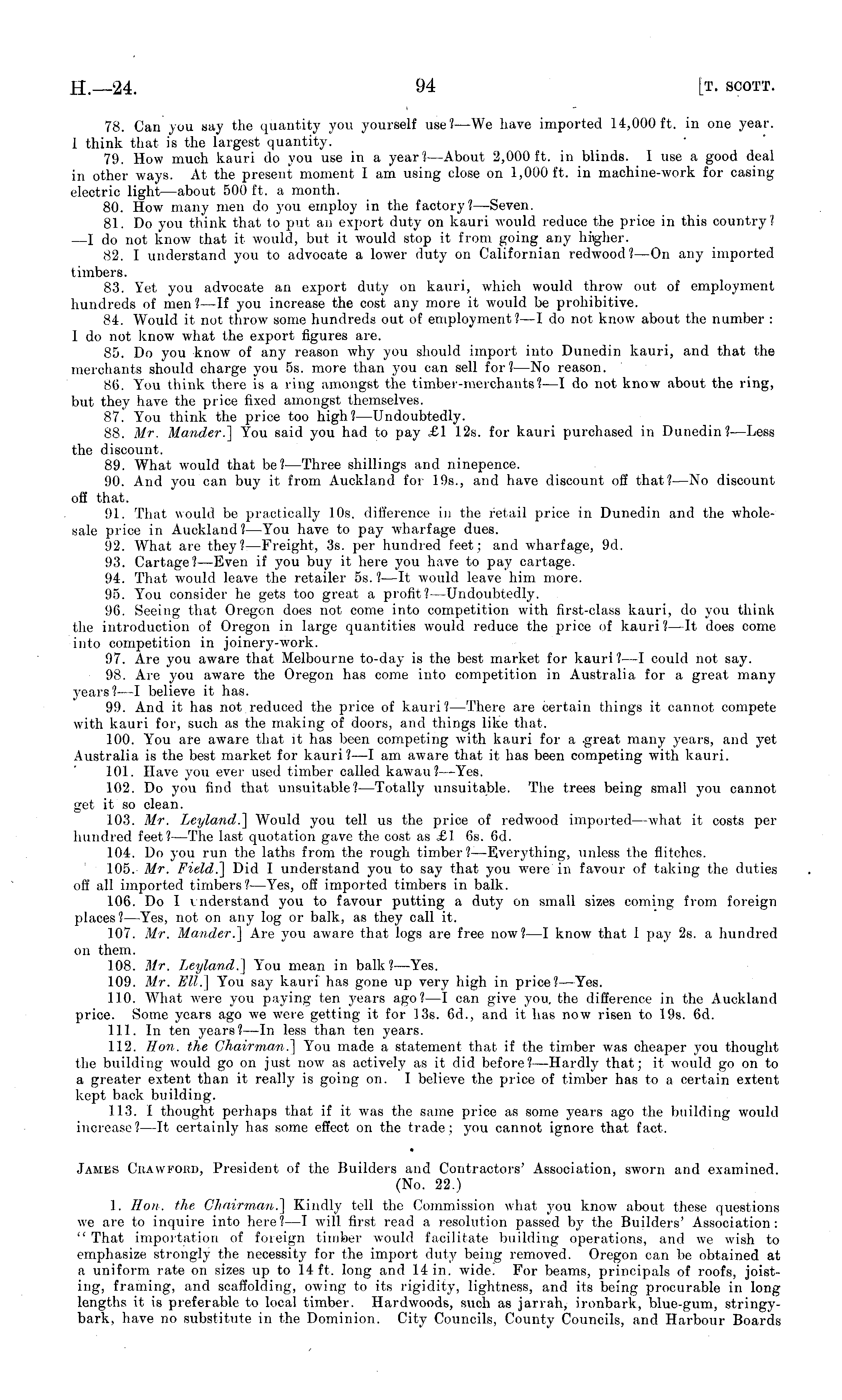 78. Can you say the quantity you yourself use? —We have imported 14,000 ft. in one year. I think that is the largest quantity. 79. How much kauri do you use in a year?— About 2,000 ft. in blinds. I use a good deal in other ways. At the present moment I am using close on 1,000 ft. in machine-work for casing electric light—about 500 ft. a month. 80. How many men do you employ in the factory? —Seven. 81. Do you think that to put an export duty on kauri would reduce the price in this country I — I do not know that it would, but it would stop it from going any higher. 82. I understand you to advocate a lower duty on Californian redwood?—On any imported timbers. 83. Yot you advocate an export duty on kauri, which would throw out of employment hundreds of men?—lf you increase the cost any more it would be prohibitive. 84. Would it not throw some hundreds out of employment? —I do not know about the number : 1 do not know what the export figures are. 85. Do you know of any reason why you should import into Dunedin kauri, and that the merchants should charge you ss. more than you can sell for?—No reason. 86. You think there is a ring amongst the timber-merchants? —I do not know about the ring, but they have the price fixed amongst themselves. 87. You think the price too high? —Undoubtedly. 88. Mr. Mander.] You said you had to pay £1 12s. for kauri purchased in Dunedin?—Less the discount. 89. What would that be? —Three shillings and ninepence. 00. And you can buy it from Auckland for 195., and have discount off that? —No discount off that. 91. That would be practically 10s. difference in the retail price in Dunedin and the wholesale juice in Auckland? —You have to pay wharfage dues. !)2. What are they?— Freight, 3s. per hundred feet; and wharfage, 9d. 93. Cartage?— Even if you buy it here you have to pay cartage. 94. That would leave the retailer ss. ?—lt would leave him more. 95. You consider lie gets too great a profit?— Undoubtedly. 9(5. Seeing that Oregon does not come into competition with first-class kauri, do you think the introduction of Oregon in large quantities would reduce the price of kauri?—lt does come into competition in joinery-work. 97. Are you aware that Melbourne to-day is the best market for kauri?—l could not say. 98. Are you aware the Oregon has come into competition in Australia for a great many j-ears?—l believe it has. 99. And it has not reduced the price of kauri?— There are certain things it cannot compete with kauri for, such as the making of doors, and things like that. 100. You are aware that it has been competing with kauri for a -great many years, and yet Australia is the best market for kauri?—l am aware that it has been competing with kauri. 101. Have you ever used timber called kawau ?—Yes. 102. Do you find that unsuitable? —Totally unsuitable. The trees being small you cannot get it so clean. 103. Mr. Leyland.] Would you tell us the price of redwood imported—what it costs per hundred feet?— The last quotation gave the cost as £1 (Ss. 6d. 104. Do you run the laths from the rough timber? —Everything, unless the flitches. 105. Mr. Field.] Did I understand you to say that you were in favour of taking the duties off all imported timbers?— Yes, off imported timbers in balk. 106. Do I i nderstand you to favour putting a duty on small sizes coming from foreign places?— Yes, not on any log or balk, as they call it. 107. Mr. Mander.] Are you aware that logs are free now?—l know that I pay 2s. a hundred on them. 108. Mr. Leyland.] You mean in balk? —Yes. 109. Mr. Ell.] You say kauri has gone up very high in price?— Yes. 110. What were you paying ten years ago?—l can give you. the difference in the Auckland price. Some years ago we were getting it for 13s. 6d., and it has now risen to 19s. (id. 111. In ten years? —In less than ten years. 112. Hon. the Chairman.] You made a statement that if the timber was cheaper you thought the building would go on just now as actively as it did before?— Hardly that; it would go on to a greater extent than it really is going on. I believe the price of timber has to a certain extent kept back building. I I'!. I thought perhaps that if it was the same price as some years ago the building would increase? —It certainly has some effect on the trade: you cannot ignore that fact. Jaimes Cuavvfoud, President of the Builders and Contractors' Association, sworn and examined. (No. 22.) 1. Hon. the Chairman.] Kindly tell the Commission what you know about those questions we arc to inquire into here?—l will first read a resolution passed by the Builders' Association: "That importation of foreign timber would facilitate building operations, and we wish to emphasize strongly the necessity for the import duty being removed. Oregon can be obtained at a uniform rate on sizes up to 14 ft. long and 14 in. wide. For beams, principals of roofs, joisting, framing, and scaffolding, owing to its rigidity, lightness, and its being procurable in long lengths it is preferable to local timber. Hardwoods, such as jarrah, ironbark, blue-gum, stringybark, have no substitute in the Dominion. City Councils, County Councils, and Harbour Boards