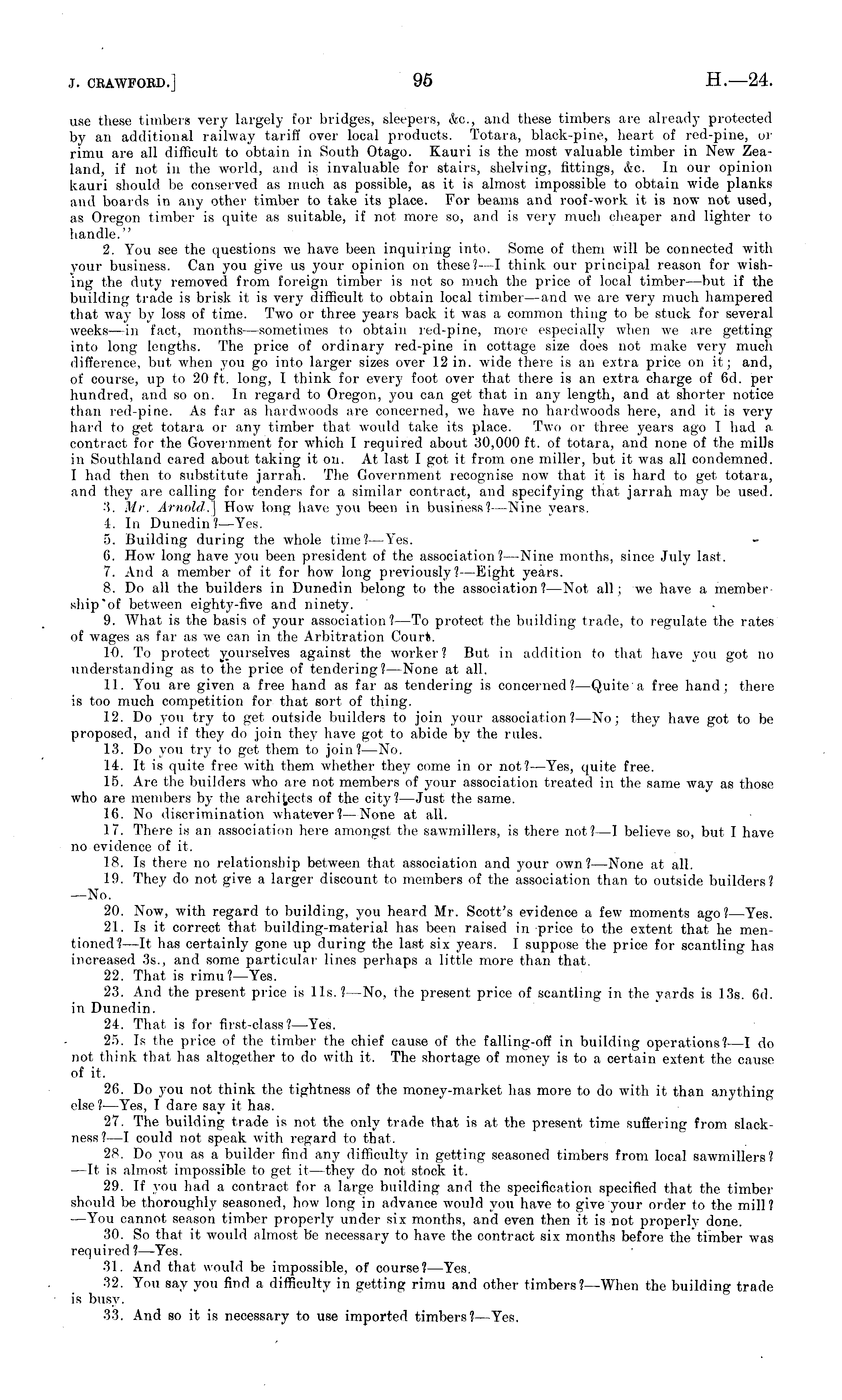 use these timbers very largely for bridges, sleepers, &c, and these timbers are already protected by an additional railway tariff over local products. Totara, black-pine, heart of red-pine, or rimu are all difficult to obtain in South Otago. Kauri is the most valuable timber in New Zeahmil, if nut in the world, and is invaluable for stairs, shelving, fittings, &c. In our opinion kauri should be conserved as much as possible, as it is almost impossible to obtain wide planks and boards in any other timber to take its place. For beams and roof-work it is now not used, as Oregon timber is quite as suitable, if not more so, and is very much cheaper and lighter to handle." 2. You see the questions we have been inquiring into. Some of them will be connected with your business. Can you give us your opinion on these? —I think our principal reason for wishing the duty removed from foreign timber is not so much the price of local timber —but if the building trade is brisk it is very difficult to obtain local timber—and we are very much hampered that way by loss of time. Two or three years back it was a common thing to be stuck for several weeks —in fact, months—sometimes to obtain red-pine, more especially when we are getting into long lengths. The price of ordinary red-pine in cottage size does not make very much difference, but when you go into larger sizes over 12 in. wide there is an e.vtra price on it; and, of course, up to 20 ft. long, I think for every foot over that there is an extra charge of 6d. per hundred, and so on. In regard to Oregon, you can get that in any length, and at shorter notice than red-pine. As far as hardwoods are concerned, we have no hardwoods here, and it is very hard to gel totara or any timber that would take its place. Two or three years ago I had a contract for the Government for which I required about 30,000 ft. of totara, and none of the mills in Southland cared about taking it on. At last I got it from one miller, but it was all condemned. I had then to substitute jarrah. The Governmeni recognise now that it is hard to get totara, and they are calling for tenders for a similar contract, and specifying that jarrah may be used. 3. Mr. Arnold.] How long have you been in business?— Nine years. L In Dunedin?—Yes. .">. Building during the whole time? —Yes. 6. How long have you been president of the association? —Nine months, since July last. 7. And a member of it for how long previously?— Eight years. 8. Do all the builders in Dunedin belong to the association?— Not all :we have a member ship'of between eighty-five and ninety. 9. What is the basis of your association?—To protect the building trade, to regulate the rates of wages as far as we can in the Arbitration Court. 10. To protect yourselves against the worker? But in addition to that have you got no understanding as to the price of tendering?— None at all. 11. You are given a free hand as far as tendering is concerned? — Quite a free hand; there is too much competition for that sort of thing. 12. Do you try to get outside builders to join your association) —No; they have got to be proposed, and if they do join they have got to abide by the rules. 13. Do you try to get them to join?— No. 14. It is quite free with them whether they come in or not?— Yes, quite free. 15. Are the builders who are not members of your association treated in the same way as those who are members by the architects of the city?— Just the same. 16. No discrimination whatever?— None at all. 17. There is an association here amongst the sawmillers, is there not?—l believe so, but I have no evidence of it. 18. Is there no relationship between thai association and your own?— None at all. 19. They do not give a larger discount to members of the association than to outside builders? —No. 20. Now, with regard to building, you heard Mr. Scott's evidence a few moments ago?— Yes. 21. Is it correct that building-material has been raised in price to the extent that he mentioned?—lt has certainly gone up during the last six years. I suppose the price for scantling has increased 35., and some particular lines perhaps a little more than that. 22. That is rimu?—Yes. 23. And the present price is lls.? —No, the present price of scantling in the yards is 13s. Gd. in Dunedin. 24. That is for first-class?— Yes. 25. Is the price of the timber the chief cause of the falling-off in building operations?—l do not think that has altogether to do with it. The shortage of money is to a certain extent the cause of it. 26. Do you not think the tightness of the money-market has more to do with it than anything else?— Yes, I dare say it has. 27. The building trade is not the only trade that is at the present time suffering from slackness?—l could not speak with regard to that. 28. Do you as a builder find any difficulty in getting seasoned timbers from local sawmillers? —It is almost impossible to get it—they do not stock it. 29. If you had a contract for a large building and the specification specified that the timber should be thoroughly seasoned, how long in advance would you have to give your order to the mill? —You cannot season timber properly under six months, and even then it is not properly done. 30. So that it would almost lie necessary to have the contract six months before the timber was required?— Yes. 31. And that would be impossible, of course?— Yes. 32. You say you find a difficulty in getting rimu and other timbers?— When the building trade is busy. 33. And so it is necessary to use imported timbers? —Yes.