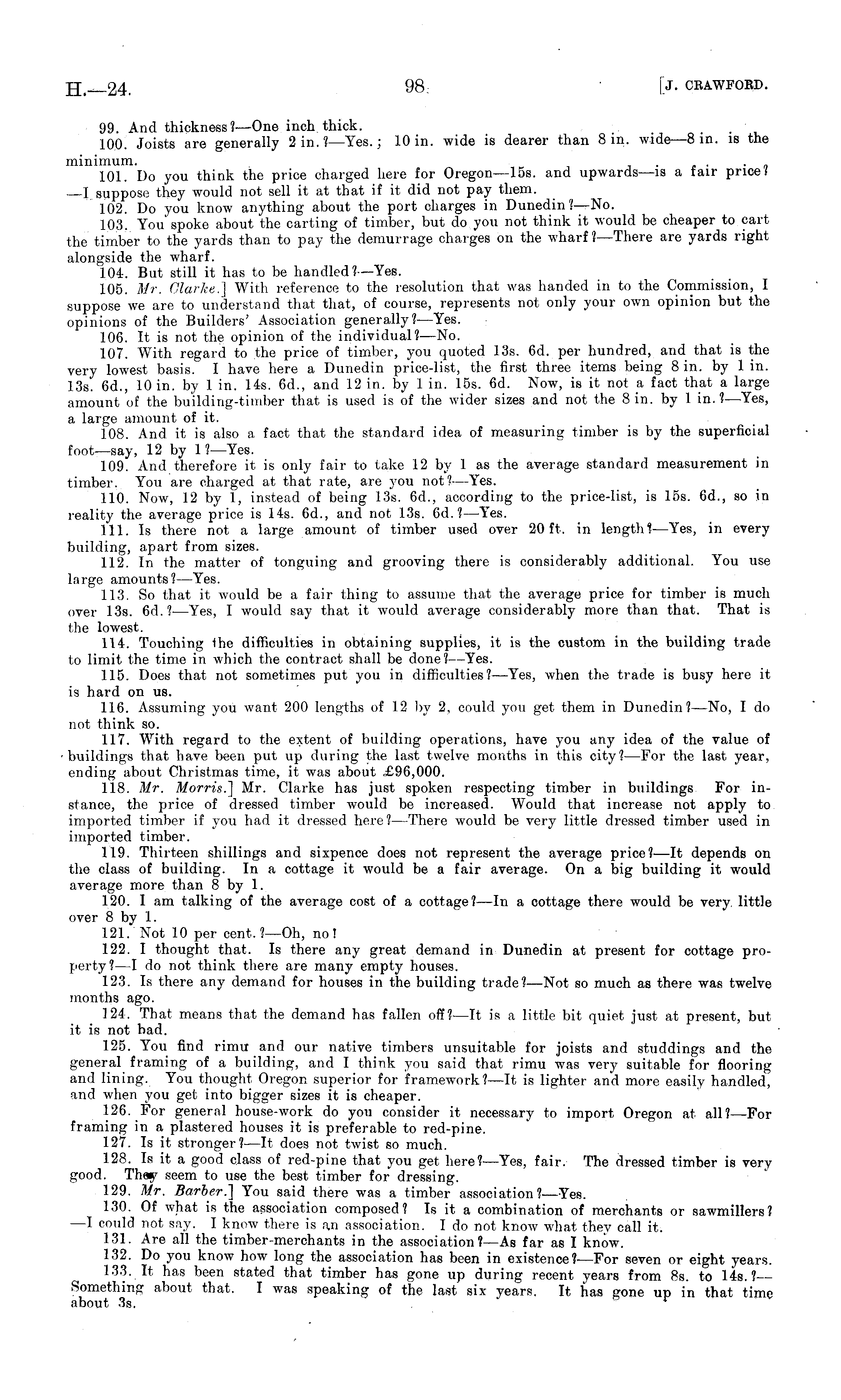 99. And thickness I— One inch thick. 100. Joists are generally 2 in.? —Yes.; 10 in. wide is dearer than Bm. wide —8 m. is the minimum. . . 101. Do you think the price charged here for Oregon—lss. and upwards—is a tair price! —I suppose they would not sell it at that if it did not pay them. 102. Do you know anything about the port charges in Dunedin? —No. 103. You spoke about the carting of timber, but do you not think it would be cheaper to cart the timber to the yards than to pay the demurrage charges on the wharf ?—There are yards right alongside the wharf. 104. But still it has to be handled?— Yes. 105. Mr. Clarke.] With reference to the resolution that was handed in to the Commission, I suppose we are to understand that that, of course, represents not only your own opinion but the opinions of the Builders' Association generally? —Yes. 106. It is not the opinion of the individual? —No. 107. With regard to the price of timber, you quoted 13s. 6d. per hundred, and that is the very lowest basis. I have here a Dunedin price-list, the first three items being 8 in. by 1 in. 13s. 6d., 10 in. by 1 in. 14s. 6d., and 12 in. by 1 in. 15s. 6d. Now, is it not a fact that a large amount of the building-timber that is used is of the wider sizes and not the 8 in. by 1 in.?— Yes, a large amount of it. 108. And it is also a fact that the standard idea of measuring timber is by the superficial foot—say, 12 by 1 1— Yes. 109. And therefore it is only fair to take 12 by 1 as the average standard measurement in timber. You are charged at that rate, are you not?— Yes. 110. Now, 12 by 1, instead of being 13s. 6d., according to the price-list, is 15s. Gd., so in reality the average price is 14s. 6d., and not 13s. 6d.? —Yes. 111. Is there not a large amount of timber used over 20ft. in length?— Yes, in every building, apart from sizes. 112. In the matter of tonguing and grooving there is considerably additional. You use large amounts? —Yes. 113. So that it would be a fair thing to assume that the average price for timber is much over 13s. 6d.?—Yes, I would say that it would average considerably more than that. That is the lowest. 114. Touching Ihe difficulties in obtaining supplies, it is the custom in the building trade to limit the time in which the contract shall be done? —Yes. 115. Does that not sometimes put you in difficulties? —Yes, when the trade is busy here it is hard on us. 116. Assuming you want 200 lengths of 12 by 2, could you get them in Dunedin?—No, I do not think so. 117. With regard to the extent of building operations, have you any idea of the value of buildings that have been put up during the last twelve months in this city? —For the last year, ending about Christmas time, it was about £96,000. 118. Mr. Morris.] Mr. Clarke has just spoken respecting timber in buildings For instance, the price of dressed timber would be increased. Would that increase not apply to imported timber if you had it dressed here ?—There would be very little dressed timber used in imported timber. 119. Thirteen shillings and sixpence does not represent the average price?—lt depends on the class of building. In a cottage it would be a fair average. On a big building it would average more than 8 by 1. 120. I am talking of the average cost of a cottage?—ln a cottage there would be very little over 8 by 1. 121. Not 10 per cent. ?—Oh, no! 122. I thought that. Is there any great demand in Dunedin at present for cottage property?—l do not think there are many empty houses. 123. Is there any demand for houses in the building trade?— Not so much as there was twelve months ago. 124. That means that the demand has fallen off?—lt is a little bit quiet just at present, but it is not bad. 125. You find rimu and our native timbers unsuitable for joists and studdings and the general framing of a building, and I think you said that rimu was very suitable for flooring and lining. You thought Oregon superior for framework?—lt is lighter and more easily handled, and when you get into bigger sizes it is cheaper. 126. For general house-work do you consider it necessary to import Oregon at all?— For framing in a plastered houses it is preferable to red-pine. 127. Is it stronger?—lt does not twist so much. 128. Is it a good class of red-pine that you get here?— Yes, fair. The dressed timber is very good. They seem to use the best timber for dressing. 129. Mr. Barber.] You said there was a timber association?-—Yes. 130. Of what is the association composed? Is it a combination of merchants or sawmillers? —I could not say. I know there is n.n association. I do not know what they call it. 131. Are all the timber-merchants in the association ?—As far as I know. 132. Do you know how long the association has been in existence?— For seven or eight years. 133. It has been stated that timber has gone up during recent years from Bs. to 145.? Something about that. I was speaking of the last six years. It has gone up in that time about 3s.