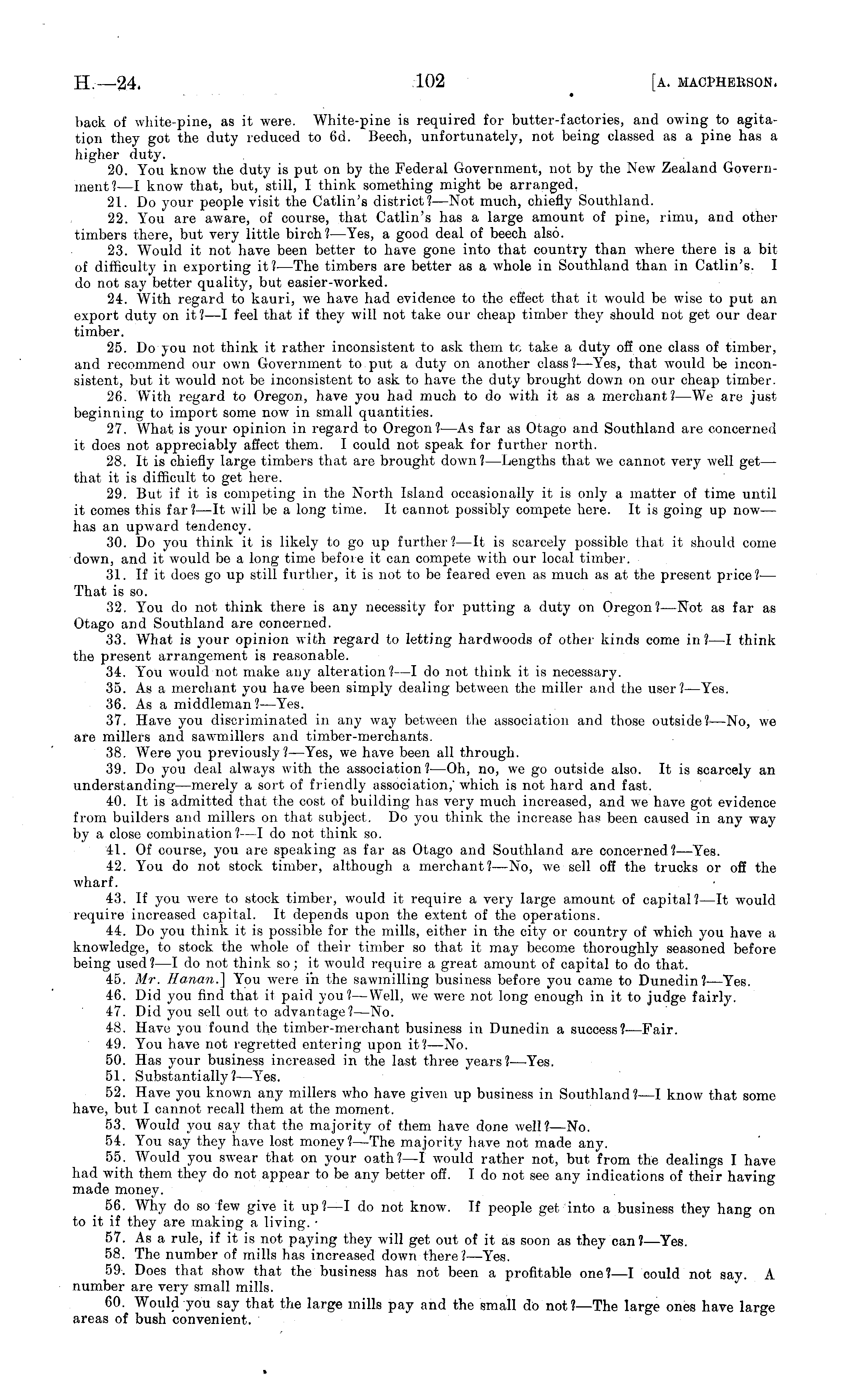 back of white-pine, as it were. White-pine is required for butter-factories, and owing to agitation they got the duty reduced to 6d. Beech, unfortunately, not being classed as a pine has a higher duty. 20. You know the duty is put on by the Federal Government, not by the New Zealand Government I—l1 — I know that, but, still, I think something might be arranged. 21. Do your people visit the Catlin's district? —Not much, chiefly Southland. 22. You are aware, of course, that Catlin's has a large amount of pine, rimu, and other timbers there, but very little birch? —Yes, a good deal of beech also. 23. Would it not have been better to have gone into that country than where there is a bit of difficulty in exporting it? —The timbers are better as a whole in Southland than in Catlin's. I do not say better quality, but easier-worked. 24. With regard to kauri, we have had evidence to the effect that it would be wise to put an export duty on it?—l feel that if they will not take our cheap timber they should not get our dear timber. 25. Do you not think it rather inconsistent to ask them to take a duty off one class of timber, and recommend our own Government to put a duty on another class?— Yes, that would be inconsistent, but it would not be inconsistent to ask to have the duty brought down on our cheap timber. 26. With regard to Oregon, have you had much to do with it as a merchant?—We are just beginning to import some now in small quantities. 27. What is your opinion in regard to Oregon?—As far as Otago and Southland are concerned it does not appreciably affect them. I could not speak for further north. 28. It is chiefly large timbers that are brought down?— Lengths that we cannot very well get— that it is difficult to get here. 29. But if it is competing in the North Island occasionally it is only a matter of time until it comes this far ?—lt will be a long time. It cannot possibly compete here. It is going up now — has an upward tendency. 30. Do you think it is likely to go up further?—lt is scarcely possible that it should come down, and it would be a long time before it can compete with our local timber. 31. If it does go up still further, it is not to be feared even as much as at the present price?— That is so. 32. You do not think there is any necessity for putting a duty on Oregon?— Not as far as Otago and Southland are concerned. 33. What is your opinion with regard to letting hardwoods of other kinds come in?—l think the present arrangement is reasonable. 34. You would not make any alteration? —I do not think it is necessary. 35. As a merchant you have been simply dealing between the miller and the user?— Yes. 36. As a middleman? —Yes. 37. Have you discriminated in any way between the association and those outside?—No, we are millers and sawmillers and timber-merchants. 38. Were you previously? —Yes, we have been all through. 39. Do you deal always with the association? —Oh, no, we go outside also. It is scarcely an understanding—merely a sort of friendly association,' which is not hard and fast. 40. It is admitted that the cost of building has very much increased, and we have got evidence from builders and millers on that subject. Do you think the increase has been caused in any way by a close combination? —I do not think so. 41. Of course, you are speaking as far as Otago and Southland are concerned?— Yes. 42. You do not stock timber, although a merchant?—No, we sell off the trucks or off the wharf. 43. If you were to stock timber, would it require a very large amount of capital?—lt would require increased capital. It depends upon the extent of the operations. 44. Do you think it is possible for the mills, either in the city or country of which you have a knowledge, to stock the whole of their timber so that it may become thoroughly seasoned before being used ?—I do not think so; it would require a great amount of capital to do that. 45. Mr. Hanan.~\ You were in the sawmilling business before you came to Dunedin?—Yes. 46. Did you find that it paid you?— Well, we were not long enough in it to judge fairly. 47. Did you sell out to advantage?— No. 48. Have you found the timber-merchant business in Dunedin a success? —Fair. 49. You have not regretted entering upon it?— No. 50. Has your business increased in the last three years?— Yes. 51. S übst anti ally ?—Yes. 52. Have you known any millers who have given up business in Southland?—l know that some have, but I cannot recall them at the moment. 53. Would you say that the majority of them have done well?— No. 54. You say they have lost money? —The majority have not made any. 55. Would you swear that on your oath? —I would rather not, but from the dealings I have had with them they do not appear to be any better off. Ido not see any indications of their having made money. 56. Why do so few give it up ?—I do not know. If people get into a business they hang on to it if they are making a living. ■ 57. As a rule, if it is not paying they will get out of it as soon as they can?— Yes. 58. The number of mills has increased down there?— Yes. 59. Does that show that the business has not been a profitable one?—l could not say. A number are very small mills. 60. Would you say that the large mills pay and the small do not? —The large ones have large areas of bush convenient.