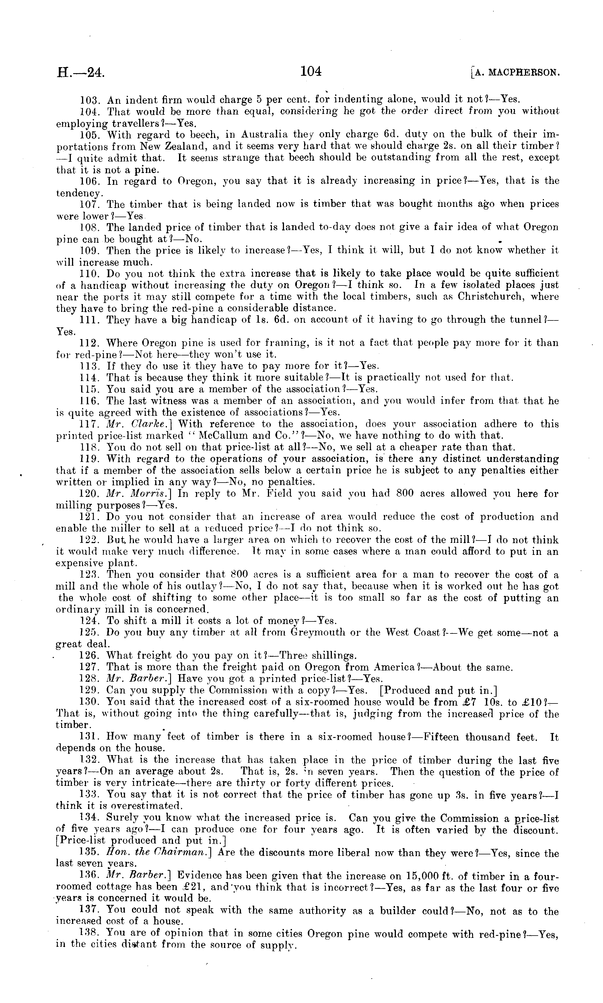 103. An indent firm would charge 5 per cent, for indenting alone, would it not?— Yes. 104. That would be more than equal, considering he got the order direct from you without employing travellers? —Yes. 105. With regard to beech, in Australia they only charge 6d. duty on the bulk of their importations from New Zealand, and it seems very hard that wo should charge 2s. on all their timber? — I quite admit that. It seems strange that beech should be outstanding from all the rest, except that it is not a pine. 106. In regard to Oregon, you say that it is already increasing in price?— Yes, that is the tendency. 107. The timber that is being landed now is timber that was bought months ago when prices were lower ? —Yes 108. The landed price of timber that is landed to-day does not give a fair idea of what Oregon pine can be bought at?— No. 109. Then the price is likely to increase? —Yes, I think it will, but I do not know whether it will increase much. 110. Do you not think the extra increase that is likely to take place would be quite sufficient of a handicap without increasing the duty on Oregon ?—I think so. In a few isolated places just near the ports it may still compete for a time with the local timbers, such as Christchurch, where they have to bring the red-pine a considerable distance. 111. They have a big handicap of Is. 6d. on account of it having to go through the tunnel? — Yes. 112. Where Oregon pine is used for framing, is it not a fact that people pay more for it than for red-pine? —Not here —they won't use it. 113. If they do use it they have to pay more for it?— Yes. 114. That is because they think it more suitable? —It is practically not used for that. 115. You said you are a member of the association? —Yes. 116. The last witness was a member of an association, and you would infer from that that he is (juite agreed with the existence of associations? —Yes. 117. Mr. Clarke.] With reference to the association, does your association adhere to this printed price-list marked " McCallum and Co."? —No, we have nothing to do with that. 118. You do not sell on that price-list at all? —No, we sell at a cheaper rate than that. 119. With regard to the operations of your association, is there any distinct understanding that if a member of the association sells below a certain price lie is subject to any penalties either written or implied in any way?—No, no penalties. 120. Mr. Morris.] In reply to Mr. Field you said you had 800 acres allowed you here for milling purposes ?—Yes. 121. Do you not consider that an increase of area would reduce the cost of production and enable the miller to sell at a reduced price?—l do not think so. 122. But he would have a larger area on which to recover the cost of the mill? —I do not think it would make very much difference. It may in some cases where a man could afford to put in an expensive plant. 12.3. Then you consider that 800 acres is a sufficient area for a man to recover the cost of a mill and the whole of his outlay? —No, I do not say that, because when it is worked out he has got the whole cost of shifting to some other place—it is too small so far as the cost of putting an ordinary mill in is concerned. 124. To shift a mill it costs a lot of money?— Yes. 125. Do you buy any timber at all from Greymouth or the West Coast?—We get some —not a great deal. 126. What freight do you pay on it?— Three shillings. 127. That is more than the freight paid on Oregon from America?— About the same. 128. Mr. Barber.] Have you got a printed price-list?— Yes. 129. Can you supply the Commission with a copy?— Yes. [Produced and put in.] 130. You said that the increased cost of a six-roomed house would be from £7 10s. to £10? — That is, without going into the thing carefully —that is, judging from the increased price of the timber. 131. How many feet of timber is there in a six-roomed house?— Fifteen thousand feet. It depends on the house. 132. What is the increase that has taken place in the price of timber during the last five years?—On an average about 2s. That is, 2s. ; n seven years. Then the question of the price of timber is very intricate —there are thirty or forty different prices. 133. You say that it is not correct that the price of timber has gone up 3s. in five years?—l think it is overestimated. 134. Surely you know what the increased price is. Can you give the Commission a price-list of five years ago?—l can produce one for four years ago. It is often varied by the discount. [Price-list produced and put in.] 135. Hon. the Chairman.] Are the discounts more liberal now than they were?— Yes, since the last seven years. 136. Mr. Barber.] Evidence has been given that the increase on 15,000 ft. of timber in a fourroomed cottage has been £21, and'you think that is incorrect?— Yes, as far as the last four or five years is concerned it would be. 137. You could not speak with the same authority as a builder could?—No, not as to the increased cost of a house. I -'is. You are of opinion that in some cities Oregon pine would compete with red-pine?— Yes, in the cities distant from the source of supply.