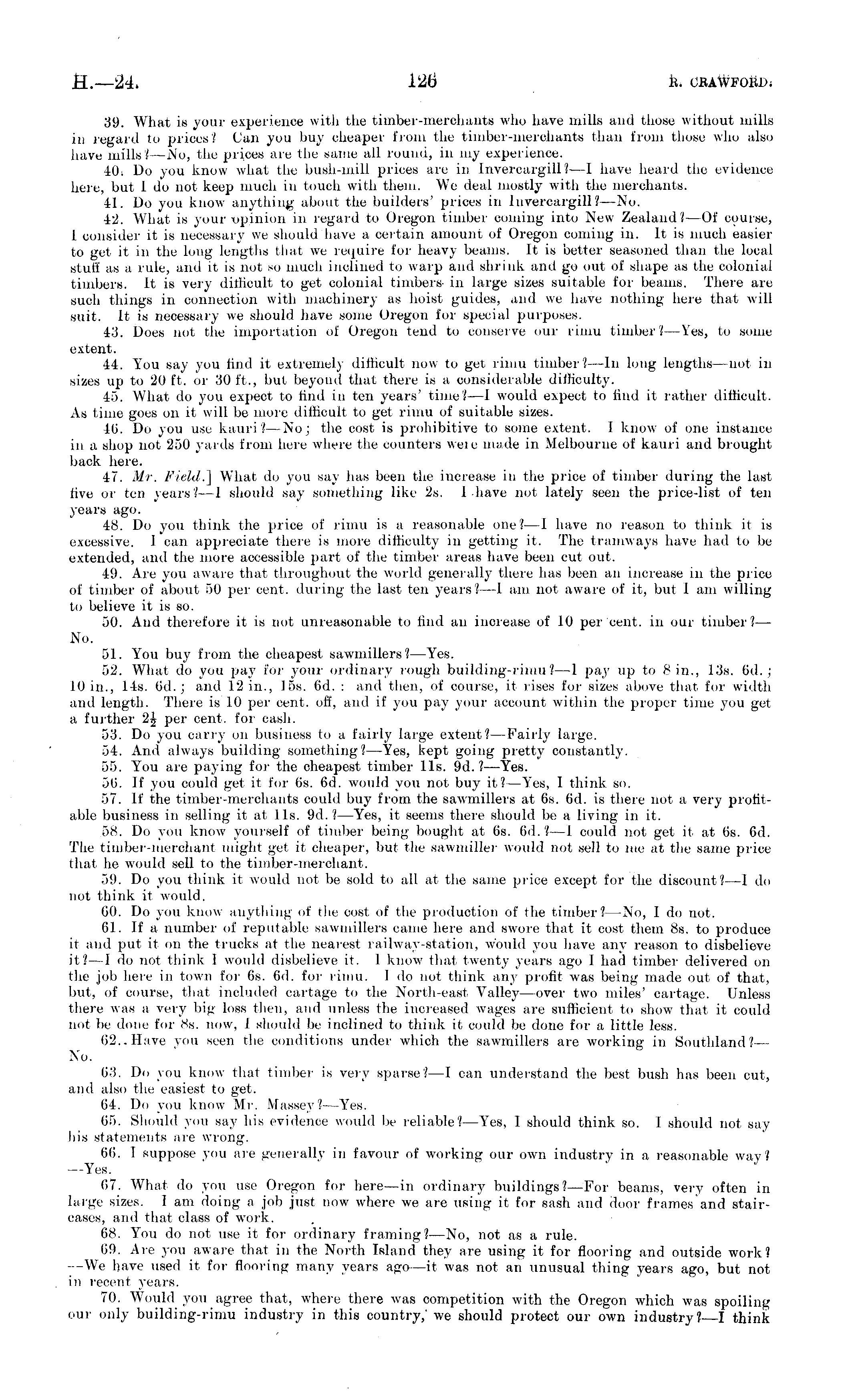39. What is your experience with the timber-merohante who have mills and those without mills in regard to prices.' Can you buy cheaper from the timber-merchants than from those who also have mills.' — No, the prices are the same all round, in my experience. 40; Do you know what the bush-mill prices are in Invercargill ? — I have heard the evidence here, but Ido not keep much in touch with them. We deal mostly with the merchants. 11. Do you know anything about the builders prices in Invercargill I—No.1 — No. 42. What is your vpinion in regard to Oregon timber coming into New Zealand/ —Of course, 1 consider it is necessary we should have a certain amount of Oregon coming in. It is much easier to get it in the long lengths that we require for heavy beams. It is better seasoned than the local stuH as a rule, and it is not so much inclined to warp and shrink and go out of shape as the colonial timbers. It is very difficult to get colonial timbers- in large sizes suitable for beams. There are such things in connection with machinery as hoist guides, and we have nothing here that will suit. It is necessary we should have some Oregon for special purposes. 43. Does not the importation of Oregon tend to conserve our riuiu timber? —Yes, to some extent. J I. You say you find it extremely difficult now to get rimu timber? —In long lengths—not in sizes up to 20 ft. or -'50 ft., but beyond that there is a considerable difficulty. 45. What do you expect to find in ten years' time , ' —I would expect to find it rather difficult. As time goes on it will be more difficult to get rimu of suitable sizes. 40. Do you use kauri?—No; the cost is prohibitive to some extent. 1 know of one instance in a shop not 250 yards from here where the counters were made in Melbourne of kauri and brought back here. 47. Mr. Field. J What do you say has been the increase in the price of timber during the last live or ten years , . should say something like 2s. 1 have not lately seen the price-list of ten years ago. 48. Do you think the price of rimu is a reasonable one? —1 have no reason to think it is excessive. I can appreciate there is more difficulty in getting it. The tramways have had to be extended, and the more accessible part of the timber areas have been cut out. 49. Are you aware that throughout the world generally there has been an increase in the price of timber of about 50 per cent, during the last ten years? —1 am not aware of it, but 1 am willing to believe it is so. 50. And therefore it is not unreasonable to find an increase of 10 per cent, in our timber ?— No. 51. You buy from the cheapest sawmillers? —Yes. 52. What do you pay for your ordinary rough building-rimu I—l1 — 1 pay up to 8 in., 13s. (id. ; loin., 14s. 6d. ; and 12 in., 15s. 6d. : and then, of course, it rises for sizes above that for width and length. There is 10 per cent, off, and if you pay your account within the proper lime you get a further per cent, for , cash. 53. Do you carry on business to a fairly large extent? —Fairly large. 54. And always building something?— Yes, kept going pretty constantly. 55. You are paying for the cheapest timber lls. 9d. ?—Yes. 50. If you could get it for Gs. (id. would you not buy it? — Yes, I think so. 57. If the timber-merchants could buy from the sawmillers at 6s. Gd. is there not a very profitable business in selling it at lls. 9d.?—Yes, it seems there should be a living in it. 58. Do you know yourself of timber being bought at Gs. (id.?—l could not get it at Gs. 6d. The timber-merchant might get it cheaper, but the sawmiller would not sell to me at the same price that he would sell to the timber-merchant. 59. Do you think it would not be sold to all at the same price except for the discount? —1 do not think it would, GO. Do you know anything of the cost of the production of t lie timber?—No, Ido not. Gl . If a number of reputable sawmillers came here and swore that it cost them <Ss. to produce it and put it on the trucks at the nearest railway-station, would you have any reason to disbelieve it? —I do not think 1 would disbelieve it. I know that twenty years ago 1 had timber delivered on the job here in town for Gs. (id. for rimu. I do not think any profit was being made out of that, but, of course, that included cartage to the North-oast Valley —over two miles' cartage. Unless there was a very big loss then, and unless the increased wages are sufficient to show that it could not he done for Bs. now, I should be inclined to think it could be done for a little less. 62..Have you seen the conditions under which the sawmillers are working in Southland? No. (i- , !. Do you know that timber is very sparse? — l can understand the best bush has been cut, and also the easiest to get. G4. Do you know Mr. Massey?—Yes. G5. Should you say his evidence would be reliable?— Yes, 1 should think so. I should not say Ins statements are wrong. GG. I suppose you are generally in favour of working our own industry in a reasonable way? Fes. G7. What do you use Oregon for here - in ordinary buildings?— For beams, very often in large sizes. lam doing a job just now where we are using it for sash and door frames and staircases, and that class of work. 68. You do not use it for ordinary framing? —No, not as a rule. G9. Are you aware that in the North Island they are using it for flooring and outside work? ---We have used it for flooring many years ago —it was not an unusual thing years ago, but not in recent years. 70. Would you agree that, where there was competition with the Oregon which was spoiling our only building-rinm industry in this country, , we should protect our own industry? I think
