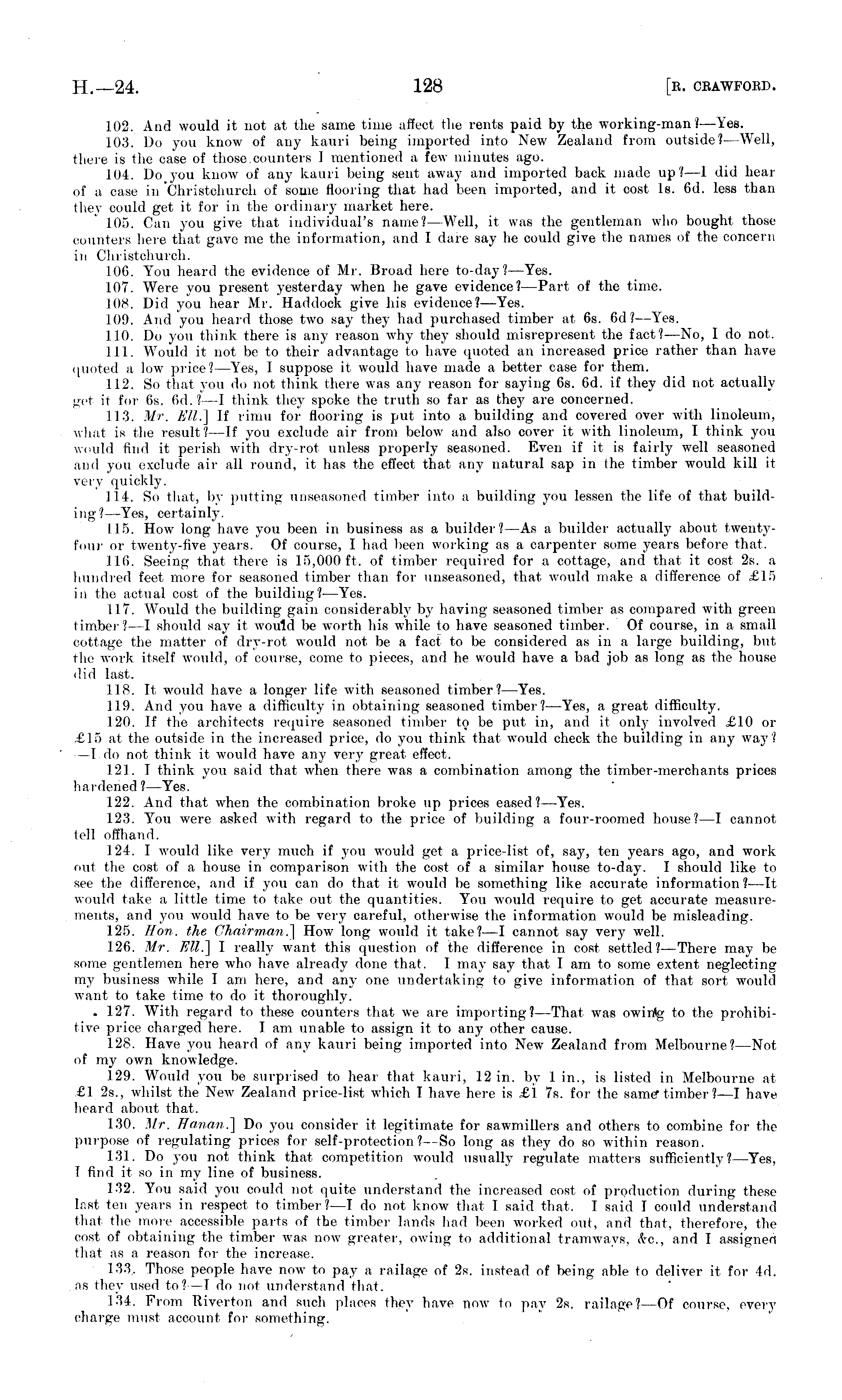 102. And would it not at the same time affect the rents paid by the working-man 'J —Yes. 103. Do you know of any kauri being imported into New Zealand from outside? — Well, there is the case of those.counters 1 mentioned a few minutes ago. 104. Do you know of any kauri being sent away and imported back made up?—l did hear of a case in Christchurch of some flooring that had been imported, and it cost Is. 6d. less than they could get it for in the ordinary market here. 105. Can you give that individual's name/—W ell, it was the gentleman who bought those counters here that gave me the information, and I dare say he could give the names of the concern in Christchurch. 106. You heard the evidence of Mr. Broad here to-day? —Yes. 107. Were you present yesterday when he gave evidence? —Part of the time, 108. Did you hear Mr. Haddock give his evidence? —Yes. 109. And you heard those two say they had purchased timber at 6s. 6d ?—Yes. 110. Do you think there is any reason why they should misrepresent the fact? —No, 1 do not. 111. Would it not be to their advantage to have quoted an increased price rather than have quoted a low price? —Yes, I suppose it would have made a better case for them. 112. So that you do not think there was any reason for saying 6s. 6d. if they did not actually get it for 6s. 6d.?—l think they spoke the truth so far as they are concerned. 11-3. Mr. Ell.] If rimu for flooring is put into a building and covered over with linoleum, what is the result? —If you exclude air from below and also cover it with linoleum, I think you would find it perish with dry-rot unless properly seasoned. Even if it is fairly well seasoned and you exclude air all round, it has the effect that any natural sap in the timber would kill it very quickly. 114. So that, by putting unseasoned timber into a building you lessen the life of that building? —Yes, certainly. 115. How long have you been in business as a builder?—As a builder actually about twentyfour or twenty-five years. Of course, I had been working as a carpenter some years before that. 116. Seeing that there is 15,000 ft. of timber required for a cottage, and that it cost 2s. a hundred feet more for seasoned timber than for unseasoned, that would make a difference of £15 in the actual cost of the building?- —Yes. 117. Would the building gain considerably by having seasoned timber as compared with green timber? —I should say it would be worth his while to have seasoned timber. Of course, in a small cottage the matter of dry-rot would not be a fact to be considered as in a large building, but the work itself would, of course, come to pieces, and he would have a bad job as long as the house did last. 118. It would have a longer life with seasoned timber?— Yes. 119. And you have a difficulty in obtaining seasoned timber?— Yes, a great difficulty. 120. If the architects require seasoned timber to be put in, and it only involved £10 or £15 at the outside in the increased price, do you think that would check the building in any way? —I. do not think it would have any very great effect. 121. I think you said that when there was a combination among the timber-merchants prices ha rderied ?—Yes. 122. And that when the combination broke up prices eased?— Yes. 123. You were asked with regard to the price of building a four-roomed house? —I cannot 101 l offhand. 124. I would like very much if you would get a price-list of, say, ten years ago, and work out the cost of a house in comparison with the cost of a similar house to-day. I should like to see the difference, and if you can do that it would be something like accurate information?—lt would take a little time to take out the quantities. You would require to get accurate measurements, and you would have to be very careful, otherwise the information would be misleading. 125. Hon. the Chairman.] How long would it take?—l cannot say very well. 126. Mr. Ell.] I really want this question of the difference in cost settled? —There may be some gentlemen here who have already done that. I may say that lam to some extent neglecting my business while I am here, and any one undertaking to give information of that sort would want to take time to do it thoroughly. . 127. With regard to these counters that we are importing?— That was owintg to the prohibitive price charged here. lam unable to assign it to any other cause. 128. Have you heard of any kauri being imported into New Zealand from Melbourne?— Not of my own knowledge. 129. Would you be surprised to hear that kauri, 12 in. by 1 in., is listed in Melbourne at £1 25., whilst the New Zealand price-list which I have here is £1 7s. for <he same* timber ?—I have heard about that. 130. Mr. finnan.] Do you consider it legitimate for sawmillers and others to combine for the purpose of regulating prices for self-protection?—So long as they do so within reason. 131. Do you not think that competition would usually regulate matters sufficiently? —Yes, I find it so in my line of business. 132. You said you could not quite understand the increased cost of production during these Inst ten years in respect to timber? —I do not know that T said that. I said I could understand that the more accessible parts of the timber lands had been worked out, and that, therefore, the cost of obtaining the timber was now greater, owing to additional tramways, itc, and I assigned that as a reason for the increase. 133. Those people have now to pay a railage of 2s. instead of being able to deliver it for 4d. as they used to? —T do not understand that. 134. From lliverton and such places they have now to pay 2s, railage?—Of course, every charge must account for something.
