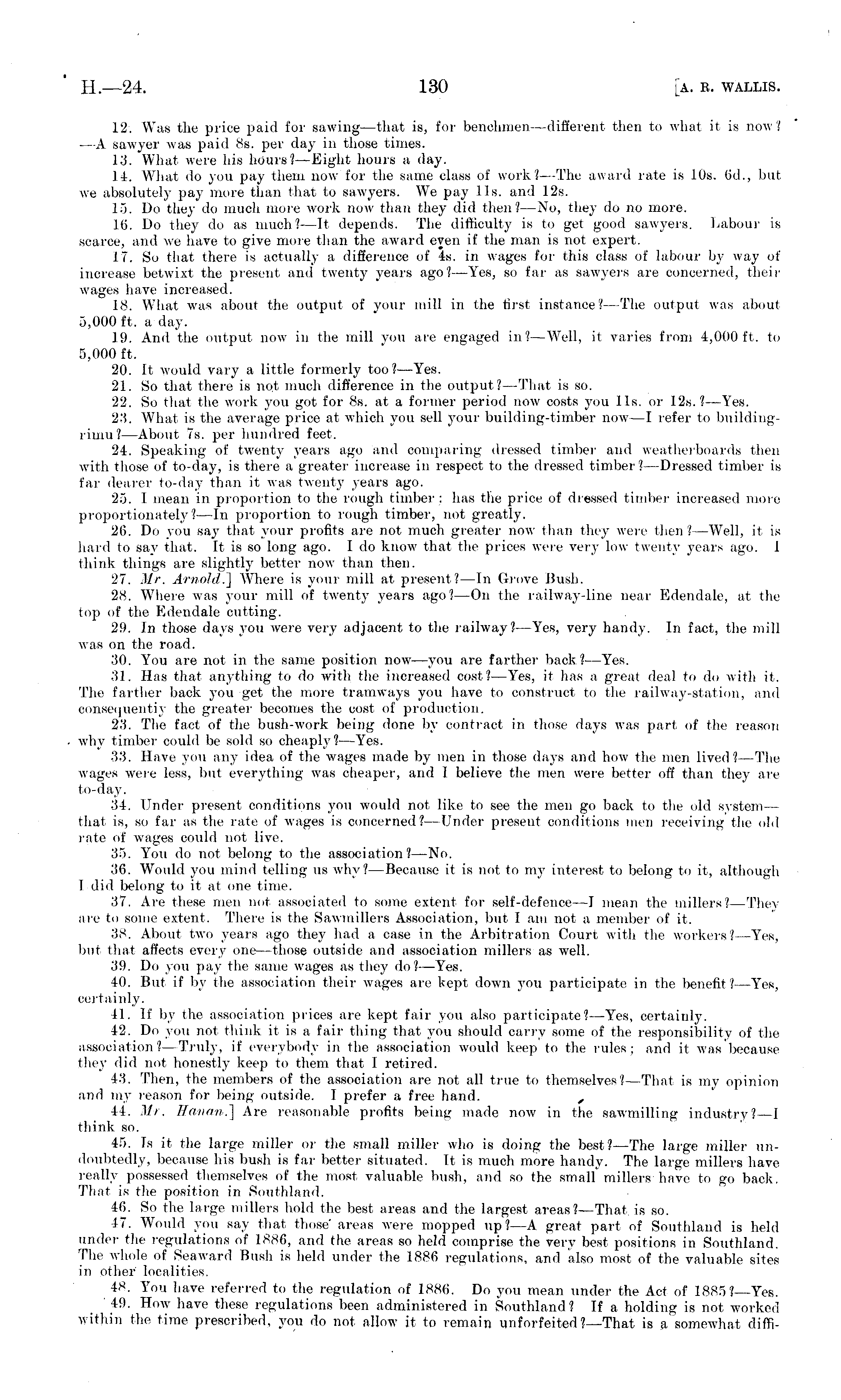 12. Was the price paid for sawing— that is, for benohmen —different then to what it is now .' —A sawyer was paid Bs. per day in those times. 13. What were his hours? —Eight hours a day. 11. What do you pay them now for the same class of work I —The award rate is JOs. (id., but we absolutely pay more than that to sawyers. We pay Us. and 12s. 15. Do they do much more work now than they did then? —No, they do no more. JO. Do they do as much!—lt depends. The difficulty is to get good sawyers. Labour is scarce, and we have to give more than the award even if the man is not expert. 17. So that there is actually a difference of 4s. in wages for this class of labour by way of increase betwixt the present and twenty years ago?— Yes, so far as sawyers are concerned, their wages have increased. 18. What was about the output of your mill in the first instance?— The output was about 5,000 ft. a day. 19. And the output now in the mill you are engaged in? —Well, it varies from 4,000 ft. to 5,000 ft. 20. It would vary a little formerly too?— Yes. 21. So that there is not much difference in the output 2 — That is so. 22. So that the work you got for Bs. at a former period now costs you lls. or 12s. ! —Yes. 2-' i. What is the average price at which you sell your building-timber now — I refer to building riuiu I —About 7s. per hundred feet. 24. Speaking of twenty years ago and comparing dressed timber and weatherboards thru with those of to-day, is there a greater increase in respect to the dressed timber.—Dressed timber is far dearer to-day than it was twenty years ago. 25. I mean in proportion to the rough timber : has the price of dressed timber increased more proportionately? — ln proportion to rough timber, not greatly. 20. Di> you say that your profits are not much greater now than they were then I—Well,1 —Well, it is hard to say that. It is so long ago. Ido know that the prices were very low twenty years ago. 1 think things are slightly better now than then. 27. Mr. Arnold.] Where is your mill at present? —In drove Bush. 2(S. Where was your mill of twenty years ago?—On the railway-line near Edendale, at the top of the Edendale cutting. 29. In those days you were very adjacent to the railway?- Yes, very handy. In fact, the mill was on the road. 30. You are not in the same position now — you are farther back ?—Yes. 31. Has that anything to do with the increased cost?— Yes, it has a great deal to do with it. The farther back you get the more tramways you have to construct to the railway-station, and oonsequentiy the greater becomes the cost of production. 23. The fact of the bush-work being done by contract in those days was part of the reason why timber could be sold so cheaply?— Yes. 33. Have you any idea of the wages made by men in those days and how the men lived? —The wages were less, but everything was cheaper, and I believe the men were better oft' than they arc to-day. 34. Under present conditions you would not like to see the men go back to the old system — that is, so far as the rate of wages is concerned?— Under present conditions men receiving the old rate of wages oould not live. 35. You do not belong to the association? —No. 36. Would you mind telling us why?— Because it is not to my interest to belong to it, although 1 did belong to it at one time. 37. Are these men not associated to some extent for self-defence—l mean the millers 1 — They are to some extent. There is the Sawmillers Association, but I am not a member of it. 3S. About two years ago they had a case in the Arbitration Court with the workers? —Yes, but that affects every one —those outside and association millers as well. 39. Do you pay the game wages as they do? —Yes. 40. But if by the association their wages are kept down you participate in the benefit I—Yes,1 — Yes, certainly. 41. If by the association prices are kept fail - you also participate?— Yes, certainly. 42. Do you not think it is a fair thing that you should carry some of the responsibility of the association?— Truly, if everybody in the association would keep to the rules; and it was because they did not honestly keep to them that I retired. 43. Then, the members of the association are not all true to themselves? —That is my opinion and my reason for being outside. I prefer a free hand. , 11. Mi. lldiidii.'] Are reasonable profits being made now in (lie sawmilling industry? — l think so. 45. Is it the large miller or the small miller who is doing the best?— The large miller undoubtedly, because his bush is far better situated. It is much more handy. The large millers have really possessed themselves of the most valuable bush, and so the small millers have to go back. That is the position in Southland. 4(5. So the large millers hold the best areas and the largest areas?— That is so. 47. Would you say that those' areas were mopped up?—A great part of Southland is hold under the regulations of 1886, and the areas so held comprise the very best positions in Southland. The whole of Seaward Bush is held under the 1886 regulations, arid also most of the valuable sites in other localities. 48. You have referred to the regulation of 1880. Do you mean under the Act of 1885?— Yes. 19. How have these regulations been administered in Southland? Tf a holding is not worked within the time prescribed, you do not allow it to remain unforfeited ?—That is a somewhat dim-