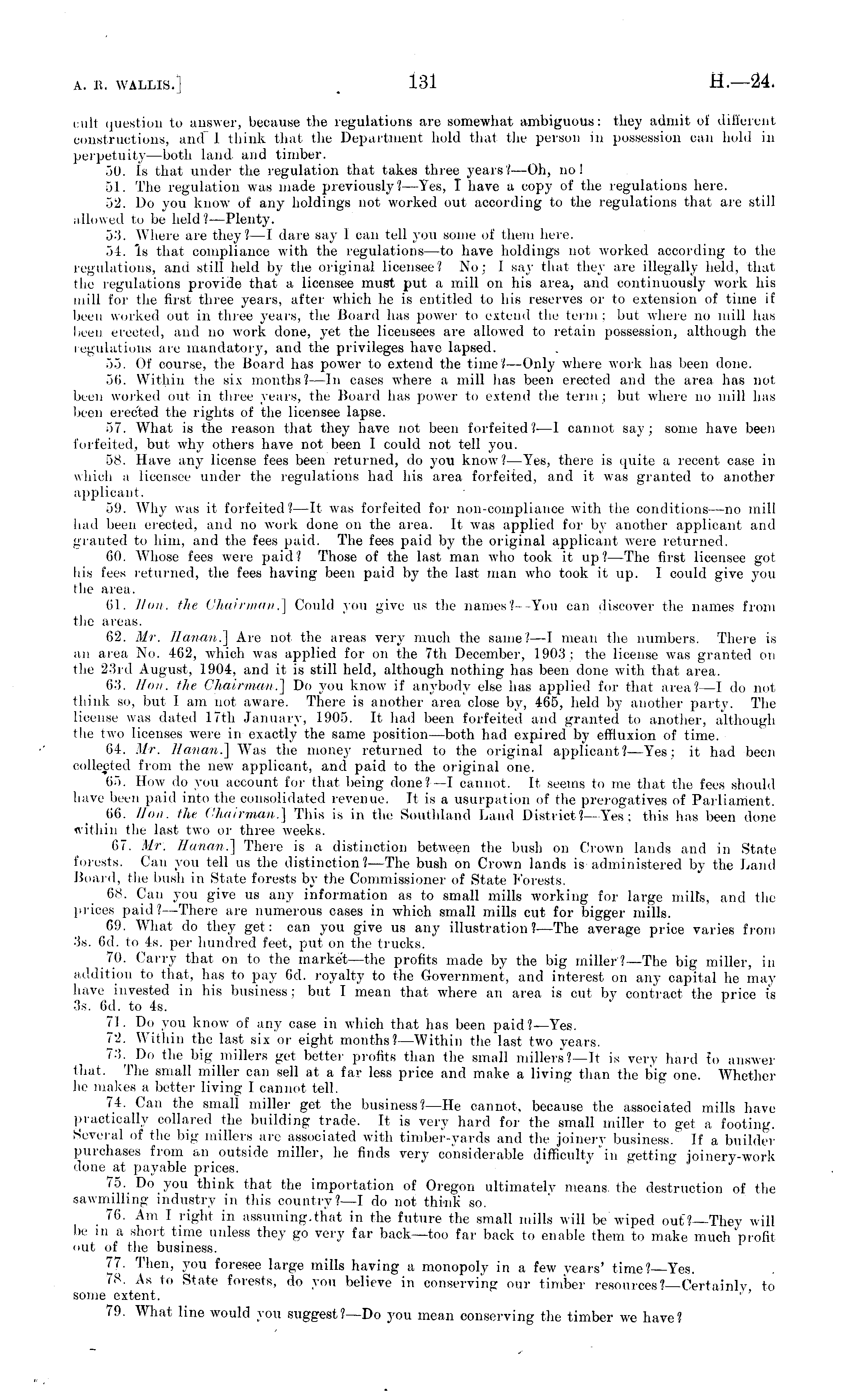 cult question to answer, because the regulations are somewhat ambiguous: they admit of different constructions, and 1 think that the Department hold that the person in possession can hold in perpetuity —both land, and timber. 50. is that under the regulation that takes three years? —Oh, no! 51. The regulation was made previously?— Yes, T have a copy of the regulations here. 52. Do you know of any holdings not worked out according to the regulations that are still allowed to be held? —Plenty. 5-i. Where are they?— J dare say 1 can tell you some of them here. 54. Is that compliance with the regulations —to have holdings not worked according to the regulations, and still held by the original licensee? No; 1 say that they are illegally held, that i lie regulations provide that a licensee must put a mill on his area, and continuously work his mill for the first three years, after which he is entitled to his reserves or to extension of time if been worked out in three years, the Hoard has power to extend the term : but where no mill has been erected, and no work done, yet the licensees are allowed to retain possession, although the regulations are mandatory, and the privileges have lapsed. 55. Of course, the Board has power to extend the time?— Only where work has been done. 56. Within the six months?—ln cases where a mill has been erected and the area has not been worked out in three years, the Hoard has power to extend the term ; but where no null has been erected the rights of the licensee lapse. 57. What is the reason that they have not been forfeited?—l cannot say; some have been forfeited, but why others have not been 1 could not tell you. 58. Have any license fees been returned, do you know?— Yes, there is quite a recent case in which a licensee under the regulations had his area forfeited, and it was granted to another applicant . 5!). Why was it forfeited ? —lt was forfeited for non-compliance with the conditions —no mill had been erected, and no work done on the area. It was applied for by another applicant and granted to him, and the fees paid. The fees paid by the original applicant were returned. GO. Whose fees were paid? Those of the last man who took it up?— The first licensee got his fees returned, the fees having been paid by the last man who took it up. I could give 3 7 0u the area. 61. //on. the Chairman.] Could you give us the names? — You can discover the names from the areas. G2. Mr. Eanan.] Are not the areas \er\ much the same? —1 mean the numbers. There is an area No. 462, which was applied for on the 7th December, 1903 ; the license was granted on the 23rd August, 1904, and it is still held, although nothing has been done with that area. 63. linn, the Chairman.] Do you know if anybody else lias applied for that area?—] do not, think so, but lam not aware. There is another area close by, 465, held by another party. The license was dated 17th January, 1905. It had been forfeited and granted to another, although ihe two licenses were in exactly the same position—both had expired by effluxion of time. 64. Mr. Hanan.] Was the money returned to the original applicant?— Yes; it had been collected from the new applicant, and paid to the original one. 65. How do you account for that being done?—l cannot. It seems to me that the fees should have been paid into the consolidated revenue. It is a usurpation of the prerogatives of Parliament. (i(i. Hon. the Chairman.] This is in the Southland Land District?— Yes: this has been done within the last two or three weeks. 67. Mr. Hunan.] There is a distinction between the bush on Crown lands and in State forests. Can you tell us the distinction?— The bush on Crown lands is administered by the Land Hoard, the bush in State forests by tile Commissioner of State Forests. 68. Can you give us any information as to small mills working for large mills, and the prices paid?— There are numerous cases in which small mills cut for bigger mills. C>'.). What do they get: can you give us any illustration?— The average price varies from •'is. (id. to 4s. per hundred feet, put on the trucks. 70. Carry that on to the market —the profits made by the big miller , ? — The big miller, in addition to that, has to pay (id. royalty to the Government, and interest on any capital he ma\ have invested in his business: but I mean that where an area is cut by contract the price is •'is. (id. to 4s. 71. Do you know of any case in which that has been paid?— Yes. 72. Within the last six or eight months?— Within the last two years. 73. Do the big millers get better profits than the small millers?—lt is very hard to answer that. The small miller can sell at a far less price and make a living than the big one. Whether he makes a better living I cannot tell. iI. Can the small miller get the business?—He cannot, because the associated mills have practically collared the building trade. It is very hard for the small miller to get a footing. Several of the big millers are associated with timber-yards and the joinery business. If a builder purchases from an outside miller, he finds very considerable difficulty'in getting joinery-work done at payable prices. 75. Do you think that the importation of Oregon ultimately means the destruction of the sawmilling industry in this country?—l do not think so. 76. Am 1 right in assuming. that in the future the small mills will be wiped out?—Thev will be in a short time unless they go very far back—too far back to enable them to make much profit out of the business. 77. Then, you foresee large mills having a monopoly in a few years' time? Yes. 78. As to State forests, d,, y,,u believe in conserving our timber resources?— Certainly to some extent. ■ ' 79. What line would you suggest?—Do you mean conserving the timber we have?