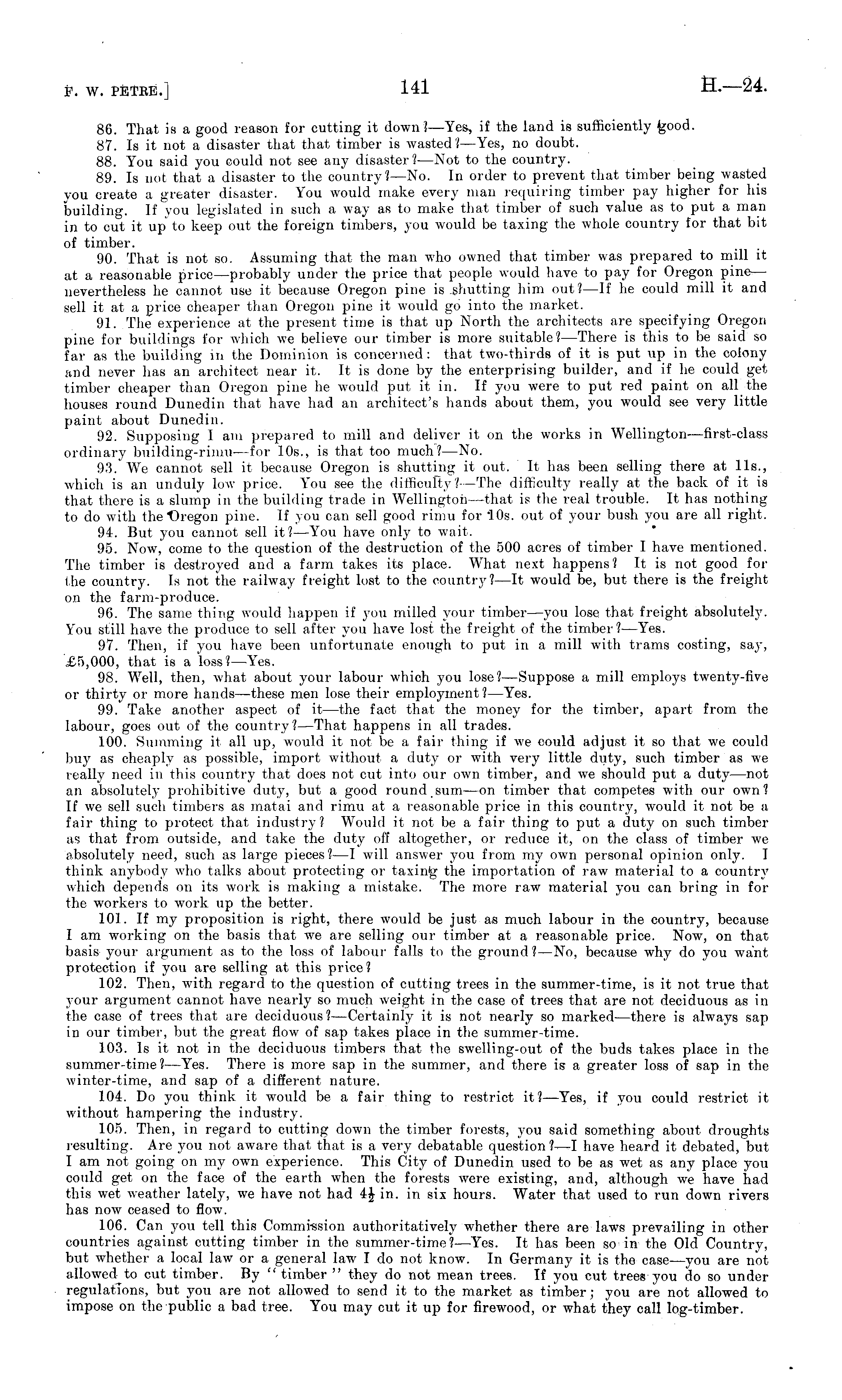 86. That is a good reason for cutting it down!— Yes, if the land is sufficiently {jood. 87. Is it not a disaster that that timber is wasted?— Yes, no doubt. 88. You said you could not see any disaster?— Not to the country. 89. Is not that a disaster to the country ?—No. In order to prevent that timber being wasted you create a greater disaster. You would make every man requiring timber pay higher for his building. If you legislated in such a way as to make that timber of such value as to put a man in to cut it up to keep out the foreign timbers, you would be taxing the whole country for that bit of timber. 90. That is not so. Assuming that the man who owned that timber was prepared to mill it at a reasonable price—probably under the price that people would have to pay for Oregon pine— nevertheless he cannot use it because Oregon pine is shutting him out?—lf he could mill it and sell it at a price cheaper than Oregon pine it would go into the market. 91. The experience at the present time is that up North the architects are specifying Oregon pine for buildings for which we believe our timber is more suitable? —There is this to be said so far as the building in the Dominion is concerned: that two-thirds of it is put up in the colony and never has an architect near it. It is done by the enterprising builder, and if he could get timber cheaper than Oregon pine he would put it in. If y O u were to put red paint on all the houses round Dunedin that have had an architect's hands about them, you would see very little paint about Dunedin. 92. Supposing I am prepared to mill and deliver it on the works in Wellington—first-class ordinary building-rimu—for 10s., is that too much? —No. 93." We cannot sell it because Oregon is shutting it out. It has been selling there at 11s., which is an unduly low price. You see the difficulty , .'—The difficulty really at the back of it is that there is a slump in the building trade in Wellington —that is the real trouble. It has nothing to do with the t)regon pine. If you can sell good rimu for "10s. out of your bush you are all right. 94. But you cannot sell it?— You have only to wait. 95. Now, come to the question of the destruction of the 500 acres of timber I have mentioned. The timber is destroyed and a farm takes its place. What next happens? It is not good for the country. Is not the railway freight lost to the country? —It would be, but there is the freight on the farm-produce. 96. The same thing would happen if you milled your timber —you lose that freight absolutely. You still have the produce to sell after you have lost the freight of the timber'? —Yes. 97. Then, if you have been unfortunate enough to put in a mill with trams costing, say, £5,000, that is a loss?— Yes. 98. Well, then, what about your labour which you lose?— Suppose a mill emploj's twenty-five or thirty or more hands —these men lose their employment ?—Yes. 99. Take another aspect of it—the fact that the money for the timber, apart from the labour, goes out of the country?— That happens in all trades. 100. Summing it all up, would it not be a fair thing if we could adjust it so that we could buy as cheaply as possible, import without a duty or with very little duty, such timber as we really need in this country that does not cut into our own timber, and we should put a duty —not an absolutely prohibitive duty, but a good round sum —on timber that competes with our own? If we sell such timbers as matai and rimu at a reasonable price in this country, would it not be a fair thing to protect that industry? Would it not be a fair thing to put a duty on such timber as that from outside, and take the duty off altogether, or reduce it, on the class of timber we absolutely need, such as large pieces?—l will answer you from my own personal opinion only. I think anybody who talks about protecting or taxing the importation of raw material to a country which depends on its work is making a mistake. The more raw material you can bring in for the workers to work up the better. 101. If my proposition is right, there would be just as much labour in the country, because I am working on the basis that we are selling our timber at a reasonable price. Now, on that basis your argument as to the loss of labour falls to the ground?—No, because why do you want protection if you are selling at this price? 102. Then, with regard to the question of cutting trees in the summer-time, is it not true that your argument cannot have nearly so much weight in the case of trees that are not deciduous as in the case of trees that are deciduous ?—Certainly it is not nearly so marked —there is always sap in our timber, but the great flow of sap takes place in the summer-time. 103. Is it not in the deciduous timbers that the swelling-out of the buds takes place in the summer-time? —Yes. There is more sap in the summer, and there is a greater loss of sap in the winter-time, and sap of a different nature. 104. Do you think it would be a fail' thing to restrict it? —Yes, if you could restrict it without hampering the industry. 105. Then, in regard to cutting down the timber forests, you said something about droughts resulting. Are you not aware that that is a very debatable question ?—I have heard it debated, but lam not going on my own experience. This City of Dunedin used to be as wet as any place you could get on the face of the earth when the forests were existing, and, although we have had this wet weather lately, we have not had 4J in. in six hours. Water that used to run down rivers has now ceased to flow. 106. Can you tell this Commi-ssion authoritatively whether there are laws prevailing in other countries against cutting timber in the summer-time?— Yes. It has been so in the Old Country, but whether a local law or a general law Ido not know. In Germany it is the case—you are not allowed to cut timber. By " timber " they do not mean trees. If you cut tre