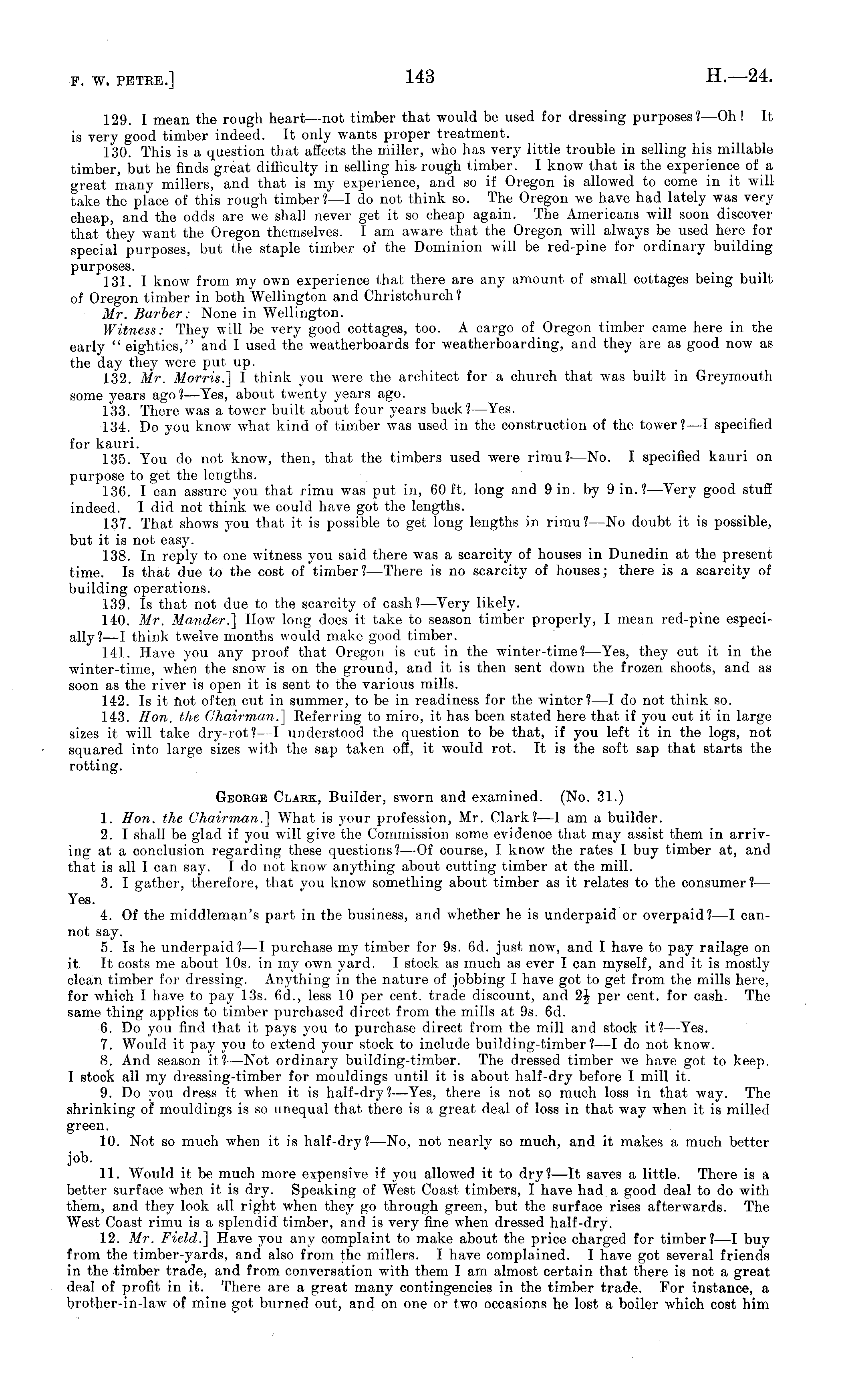 129. I mean the rough heart—not timber that would be used for dressing purposes? —Oh I It is very good timber indeed. It only wants proper treatment. 130. This is a question that affects the miller, who lias very little trouble in selling his millable timber, but he finds great difficulty in selling his- rough timber. I know that is the experience of a great many millers, and that is my experience, and so if Oregon is allowed to come in it willtake the place of this rough timber?—l do not think so. The Oregon we have had lately was very cheap, and the odds are we shall never get it so cheap again. The Americans will soon discover that they want the Oregon themselves. lam aware that the Oregon will always be used here for special purposes, but the staple timber of the Dominion will be red-pine for ordinary building purposes. 131. I know from my own experience that there are any amount of small cottages being built of Oregon timber in both Wellington and Christchurch? Mr. Barber: None in Wellington. Witness: They will be very good cottages, too. A cargo of Oregon timber came here in the early " eighties," and I used the weatherboards for weatherboarding, and they are as good now as the day they were put up. 132. Mr. Morris.'] I think you were the architect for a church that was built in Greymouth some years ago?— Yes, about twenty years ago. 133. There was a tower built about four years back?— Yes. 134. Do you know what kind of timber was used in the construction of the tower?—l specified for kauri. 135. You do not know, then, that the timbers used were rimu?—No. I specified kauri on purpose to get the lengths. 136. I can assure you that rimu was put in, 60ft, long and 9 in. by 9 in.? —Very good stuff indeed. I did not think we could have got the lengths. 137. That shows you that it is possible to get long lengths in rimu? —No doubt it is possible, but it is not easy. 138. In reply to one witness you said there was a scarcity of houses in Dunedin at the present time. Is that due to the cost of timber?— There is no scarcity of houses; there is a scarcity of building operations. 139. Is that not due to the scarcity of cash? —Very likely. 140. Mr. Mander.] How long does it take to season timber properly, I mean red-pine especially? —I think twelve months would make good timber. 141. Have you any proof that Oregon is cut in the winter-time?— Yes, they cut it in the winter-time, when the snow is on the ground, and it is then sent down the frozen shoots, and as soon as the river is open it is sent to the various mills. 142. Is it not often cut in summer, to be in readiness for the winter? —I do not think so. 143. Hon. the Chairman.'] Referring to miro, it has been stated here that if you cut it in large sizes it will take dry-rot?—l understood the question to be that, if you left it in the logs, not squared into large sizes with the sap taken off, it would rot. It is the soft sap that starts the rotting. George Clark, Builder, sworn and examined. (No. 31.) 1. Hon. the Chairman.] What is your profession, Mr. Clark? —I am a builder. 2. I shall be glad if you will give the Commission some evidence that may assist them in arriving at a conclusion regarding these questions? —Of course, I know the rates I buy timber at, and that is all I can say. Ido not know anything about cutting timber at the mill. 3. I gather, therefore, that you know something about timber as it relates to the consumer?— Yes. 4. Of the middleman's part in the business, and whether he is underpaid or overpaid?—l cannot say. 5. Is he underpaid?—l purchase my timber for 9s. 6d. just now, and I have to pay railage on it. It costs me about 10s. in my own yard. I stock as much as ever I can myself, and it is mostly clean timber for dressing. Anything in the nature of jobbing I have got to get from the mills here, for which I have to pay 13s. 6d., less 10 per cent, trade discount, and 2J per cent, for cash. The same thing applies to timber purchased direct from the mills at 9s. 6d. 6. Do you find that it pays you to purchase direct from the mill and stock it?— Yes. 7. Would it pay you to extend your stock to include building-timber?—l do not know. 8. And season it?— Not ordinary building-timber. The dressed timber we have got to keep. I stock all my dressing-timber for mouldings until it is about half-dry before I mill it. 9. Do you dress it when it is half-dry? —Yes, there is not so much loss in that way. The shrinking of mouldings is so unequal that there is a great deal of loss in that way when it is milled green. 10. Not so much when it is half-dry?—No, not nearly so much, and it makes a much better job. 11. Would it be much more expensive if you allowed it to dry?—lt saves a little. There is a better surface when it is dry. Speaking of West Coast timbers, I have had. a good deal to do with them, and they look all right when they go through green, but the surface rises afterwards. The West Coast rimu is a splendid timber, and is very fine when dressed half-dry. 12. Mr. Field.] Have you any complaint to make about the price charged for timber?—l buy from the timber-yards, and also from the millers. I have complained. I have got several friends in the timber trade, and from conversation with them I am almost certain that there is not a great deal of profit in it. There are a great many contingencies in the timber trade. For instance, a brother-in-law of mine got burned out, and on one or two occasions he lost a boiler which cost him