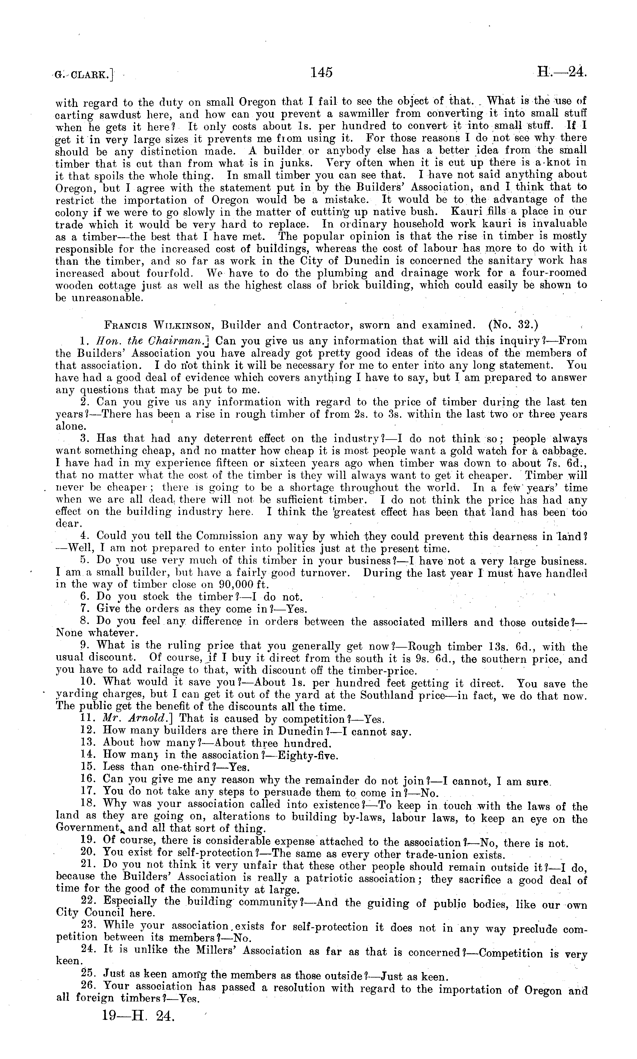 with regard to the duty on small Oregon that I fail to see the object of that. What is the use (if carting sawdust here, and how can yoti prevent a sawmiller from converting it into small stuff when he gets it here? It only costs about Is. per hundred to convert it into small stuff. If I get it in very large sizes it prevents me from using it. For those reasons I do not see why there should be any distinction made. A builder or anybody else has a better idea from the small timber that is cut than from what is in junks. Very often when it is cut up there is a knot in it that spoils the whole thing. In small timber you can see that. I have not said anything about Oregon, but I agree with the statement put in by the Builders' Association, and I think that to restrict the importation of Oregon would be a mistake. It would be to the advantage of the colony if we were to go slowly in the matter of cutting up native bush. Kauri fills a place in our trade which it would be very hard to replace. In ordinary household work kauri is invaluable as a timber—the best that I have met. The popular opinion is that the rise in timber is mostly responsible for the increased cost of buildings, whereas the cost of labour has more to do with it than the timber, and so far as work in the City of Dunedin is concerned the sanitary work has increased about fourfold. We have to do the plumbing and drainage work for a four-roomed wooden cottage just as well as the highest class of brick building, which could easily be shown to be unreasonable. Fkancis Wilkinson, Builder and Contractor, sworn and examined. (No. 32.) 1. Hon. the Can you give us any information that will aid this inquiry?— From the Builders' Association you have already got pretty good ideas of the ideas of the members of that association. Ido not think it will be necessary for me to enter into any long statement. You have had a good deal of evidence which covers anything I have to say, but I am prepared to answer any questions that may be put to me. 2. Can you give us any information with regard to the price of timber during the last ten years?— There has been a rise in rough timber of from 2s. to 3s. within the last two or three years alone. 3. Has that had any deterrent effect on the industry?—l do not think so; people always want something cheap, and no matter how cheap it is most people want a gold watch for a cabbage. I have had in my experience fifteen or sixteen years ago when timber was down to about 7s. 6d., that no matter what the cost of the timber is they will always want to get it cheaper. Timber will never be cheaper ; there is going to be a shortage throughout the world. In a few years' time when we are all dead, there will not be sufficient timber. I do not think the price has had any effect on the building industry here. I think the 'greatest effect has been that land has been too dear. 4. Could you tell the Commission any way by which they could prevent this dearness in land? —Well, I am not prepared to enter into politics just at the present time. 5. Do you use very much of this timber in your Inisiness?—l have not a very large business. lam a small builder, but have a fairly good turnover. During the last year I must have handled in the way of timber close on 90,000 ft. 6. Do you stock the timber?—l do not. 7. Give the orders as they come in?— Yes. 8. Do you feel any difference in orders between the associated millers and those outside?— None whatever. 9. What is the ruling price that you generally get now?—Eough timber 13s. 6d., with the usual discount. Of course, if I buy it direct from the south it is 9s. 6d., the southern price, and you have to add railage to that, with discount off the timber-price. 10. What would it save you?— About Is. per hundred feet getting it direct. You save the yarding charges, but I can get it out of the yard at the Southland price—in fact, we do that now. The public get the benefit of the discounts all the time. 11. Mr. Arnold.'] That is caused by competition?— Yes. 12. How many builders are there in Dunedin?—l cannot say. 13. About how many?— About three hundred. 14. How manj in the association?— Eighty-five. 15. Less than one-third?— Yes. 16. Can you give me any reason why the remainder do not join?—l cannot, lam sure. 17. You do not take any steps to persuade them to come in?— No. 18. Why was your association called into existence? —To keep in touch with the laws of the land as they are going on, alterations to building by-laws, labour laws, to keep an eye on the and all that sort of thing. 19. Of course, there is considerable expense attached to the association?—No, there is not. 20. You exist for self-protection ?—The same as every other trade-union exists. 21. Do you not think it very unfair that these other people should remain outside it? I do, because the Builders' Association is really a patriotic association; they sacrifice a good deal of time for the good of the community at large. 22. Especially the building community?— And the guiding of public bodies, like our own City Council here. _ 23. While your association.exists for self-protection it does not in any way preclude competition between its members?— No. 24. It is unlike the Millers' Association as far as that is concerned?— Competition is very keen. J 25. Just as keen among the members as those outside?— Just as keen. 26. Your association has passed a resolution with regard to the importation of Oregon and all foreign timbers?— Yes.