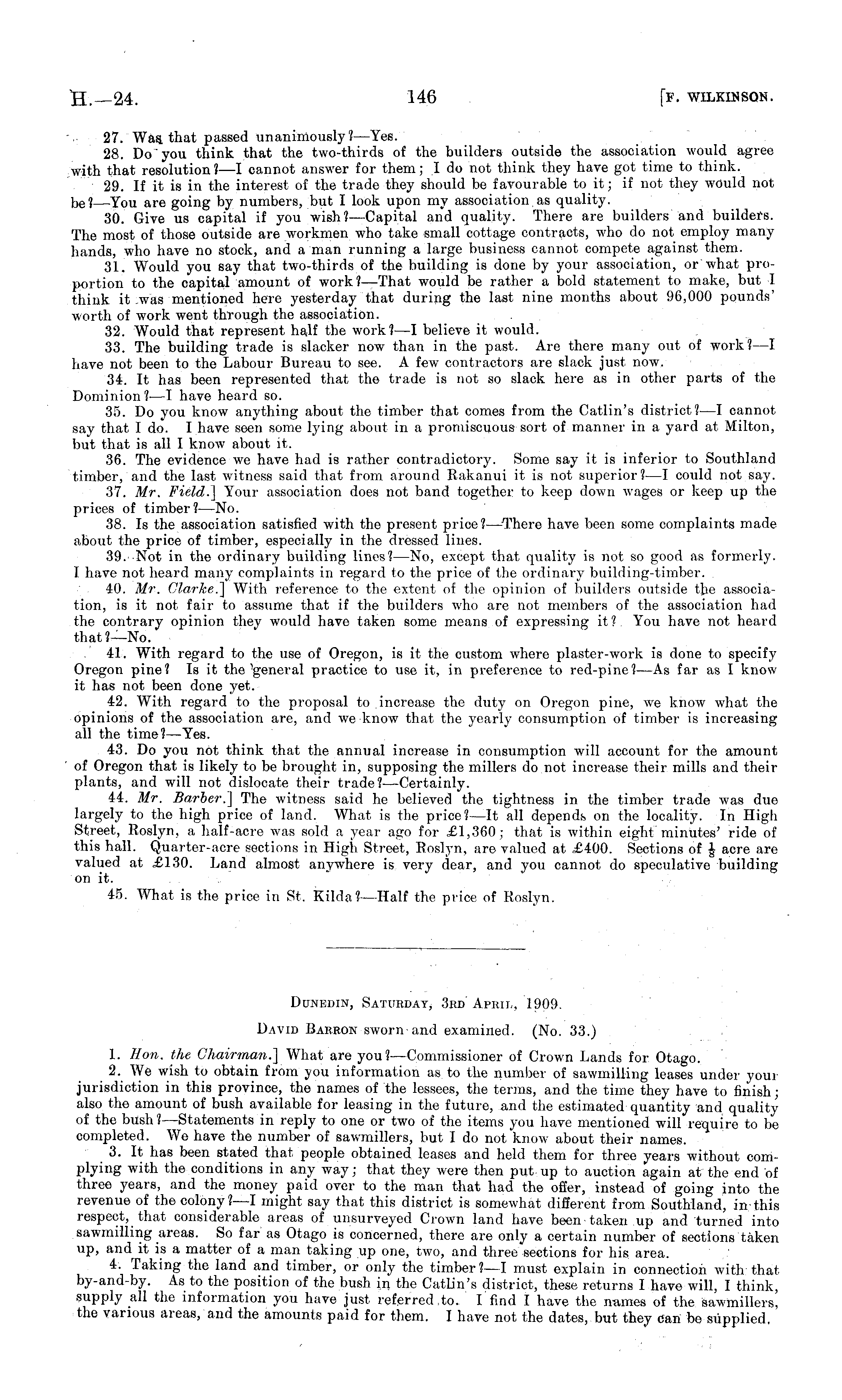 Dcnedin, Saturday, 3rd April, 1901). David Barron sworn and examined. (No. 33.) 1. Hon. the Chairman.] What are you?— Commissioner of Crown Lands for Otago. 2. We wish to obtain from you information as to the number of sawmill-ing leases under your jurisdiction in this province, the names of the lessees, the terms, and the time they have to finish; also the amount of bush available for leasing in the future, and the estimated quantity and quality of the bush? —Statements in reply to one or two of the items you have mentioned will require to be completed. We have the number of sawmillers, but Ido not know about their names. _3. It has been stated that people obtained leases and held them for three years without complying with the conditions in any way; that they were then put up to auction again at the end of three years, and the money paid over to the man that had the offer, instead of going into the revenue of the colony? —I might say that this district is somewhat different from Southland, in this respect, that considerable areas of unsurveyed Crown land have boon taken up and turned into sawmilling areas. So far as Otago is concerned, there are only a certain number of sections taken up, and it is a matter of a man taking up one, two, and three sections for his area. 4. Taking the land and timber, or only the timber?—l must explain in connection with that by-and-by. As to the position of the bush in the Catlin's district, these returns I have will, I think, supply all the information you have just referred to. I find I have the names of the sawmillers, the various areas, and the amounts paid for them. I have not the dates, but they can be supplied.