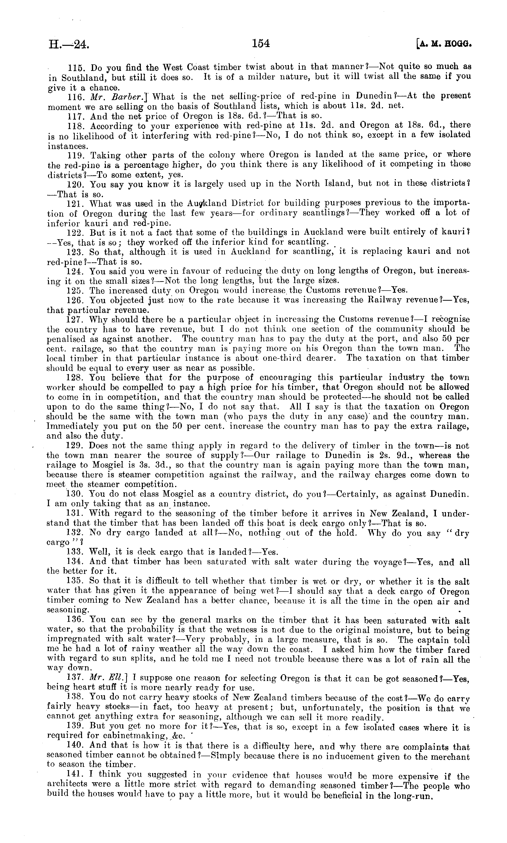115. Do you find the West Coast timber twist about in that manner? —Not quite so much as in Southland, but still it does so. It is of a milder nature, but it will twist all the same if you give it a chance. 110. Mr. Barber.] What is the net selling-price of red-pine in Dunedin?—At the present moment we are selling on the basis of Southland lists, which is about 11s. 2d. net. 117. And the net price of Oregon is 18s. 6d.?—That is so. 118. According to your experience with red-pine at 11s. 2d. and Oregon at 18s. 6d., there is no likelihood of it interfering with red-pine? —No, I do not think so, except in a few isolated instances. 119. Taking other parts of the colony where Oregon is landed at the same price, or where the red-pine is a percentage higher, do you think there is any likelihood of it competing in those districts? —To some extent, yes. 120. You say you know it is largely used up in the North Island, but not in these districts? —That is so. 121. What was used in the Auckland District for building purposes previous to the importation of Oregon during the last few years —for ordinary scantlings? —They worked off a lot of inferior kauri and red-pine. 122. But is it not a fact that some of the buildings in Auckland were built entirely of kauri? —Yes, that is so; they worked off the inferior kind for scantling. 123. So that, although it is used in Auckland for scantling,' it is replacing kauri and not red-pine?— That is so. 124. You said you were in favour of reducing the duty on long lengths of Oregon, but increasing it on the small sizes? —Not the long lengths, but the large sizes. 125. The increased duty on Oregon would increase.the Customs revenue?— Yes. 126. You objected just now to the rate because it was increasing the Railway revenue?— Yes, that particular revenue. 127. Why should there be a particular object in increasing the Customs revenue?—l recognise the country has to have revenue, but I do not think one section of the community should be penalised as against another. The country man has to pay the duty at the port, and also 50 per cent, railage, so that tho country man is paying more on his Oregon than the town man. The local timber in that particular instance is about one-third dearer. The taxation on that timber should be equal to every user as near as possible. 128. You believe that for the purpose of encouraging this particular industry the town worker should be compelled to pay a high price for his timber, that Oregon should not be allowed to come in in competition, and that the country man should be protected—he should not be called upon to do the same thing?—No, I do not say that. AH. I say is that the taxation on Oregon should be the same with the town man (who pays the dtity in any case)' and the country man. Immediately you put on the 50 per cent, increase the country man has to pay the extra railage, and also the duty. 129. Does not the same thing apply in regard to the delivery of timber in the town —is not the town man nearer the source of supply? —Our railage to Dunedin is 2s. 9d., whereas the railage to Mosgiel is 3s. 3d., so that the country man is again paying more than the town man, because there is steamer competition against the railway, and the railway charges come down to meet the steamer competition. 130. You do not class Mosgiel as a country district, do you?— Certainly, as against Dunedin. I am only taking that as an instance. 131. With regard to the seasoning of the timber before it arrives in New Zealand, I understand that the timber that has been landed off this boat is deck cargo only ?—That is so. 132. No dry cargo landed at all? —No, nothing out of the hold. Why do you say "dry cargo "? 133. Well, it is deck cargo that is landed?— Yes. 134. And that timber has been saturated with salt water during the voyage?— Yes, and all the better for it. 135. So that it is difficult to tell whether that timber is wet or dry, or whether it is the salt water that has given it the appearance of being wet?—l should say that a deck cargo of Oregon timber coming to New Zealand has a better chance, because it is all the time in the open air and seasoning. 136. You can see by the general marks on the timber that it has been saturated with salt water, so that the probability is that the wetness is not due to the original moisture, but to being impregnated with salt water?— Very probably, in a large measure, that is so. The captain told me he had a lot of rainy weather all the way down the coast. I asked him how the timber fared with regard to sun splits, and he told me I need not trouble because there was a lot of rain all the way down. 137. Mr. EH.] I suppose one reason for selecting Oregon is that it can be got seasoned?— Yes, being heart stuff it is more nearly ready for use. 138. You do not carry heavy stocks of New Zealand timbers because of the cost?—We do carry fairly heavy stocks—in fact, too heavy at present; but, unfortunately, the position is that we cannot get anything extra for seasoning, although we can sell it more readily. 139. But you get no more for it?— Yes, that is so, except in a few isolated cases where it is required for cabinetmaking, &c. 140. And that is how it is that there is a difficulty here, and why there are complaints that seasoned timber cannot be obtained? —Simply because there is no inducement given to the merchant to season the timber. 141. I think you suggested in your evidence that houses would be more expensive if the architects were a little more strict witli regard to demanding seasoned timber?— The people who build the houses would have to pay a little more, but it would be beneficial in the long-run.