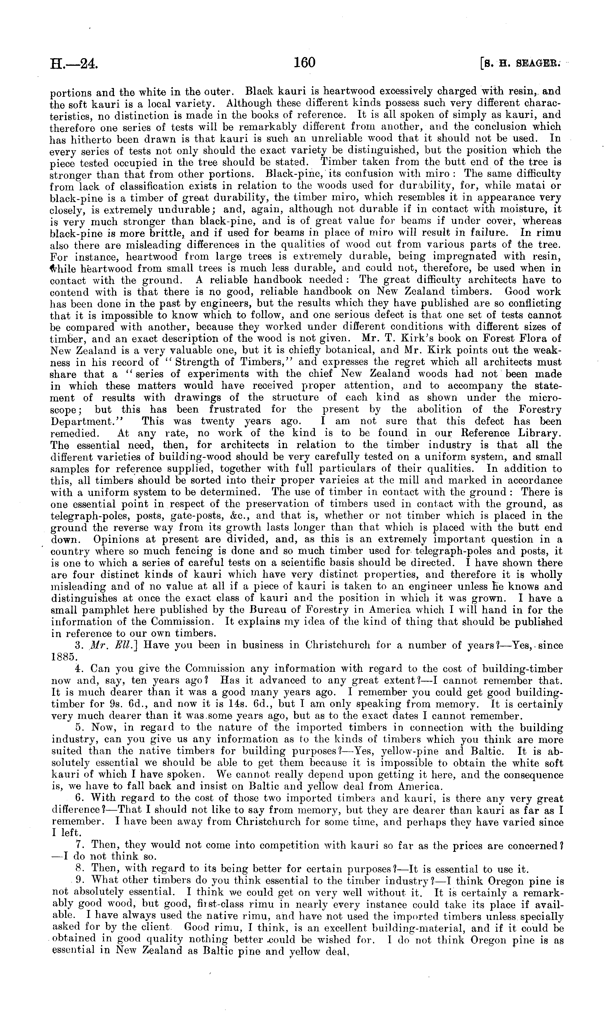 portions and the white in the outer. Black kauri is heartwood excessively charged with resin, and the soft kauri is a local variety. Although these different kinds possess such very different characteristics, no distinction is made in the books of reference. It is all spoken of simply as kauri, and therefore one series of tests will be remarkably different from another, and the conclusion which has hitherto been drawn is that kauri is such an unreliable wood that it should not be used. In every series of tests not only should the exact variety be distinguished, but the position which the piece tested occupied in the tree should be stated. Timber taken from the butt end of the tree is stronger than that from other portions. Black-pine, its confusion with miro : The same difficulty from lack of classification exists in relation to the woods used for durability, for, while matai or black-pine is a timber of great durability, the timber miro, which resembles it in appearance very closely, is extremely undurable; and, again, although not durable if in contact with moisture, it is very much stronger than black-pine, and is of great value for beams if under cover, whereas black-pine is more brittle, and if used for beams in place of miro will result in failure. In rimu also there are misleading differences in the qualities of wood cut from various parts of the tree. For instance, heartwood from large trees is extremely durable, being impregnated with resin, while heartwood from small trees is much less durable, and could not, therefore, be used when in contact with the ground. A reliable handbook needed : The great difficulty architects have to contend with is that there is no good, reliable handbook on New Zealand timbers. Good work has been done in the past by engineers, but the results which they have published are so conflicting that it is impossible to know which to follow, and one serious defect is that one set of tests cannot be compared with another, because they worked under different conditions with different sizes of timber, and an exact description of the wood is not given. Mr. T. Kirk's book on Forest Flora of New Zealand is a very valuable one, but it is chiefly botanical, and Mr. Kirk points out the weakness in his record of " Strength of Timbers," and expresses the regret which all architects must share that a " series of experiments with the chief New Zealand woods had not been made in which these matters would have received proper attention, and to accompany the statement of results with drawings of the structure of each kind as shown under the microscope ; but this has been frustrated for the present by the abolition of the Forestry Department." This was twenty years ago. I am not sure that this defect has been remedied. At any rate, no work of the kind is to be found in our Reference Library. The essential need, then, for architects in relation to the timber industry is that all the different varieties of building-wood should be very carefully tested on a uniform system, and small samples for reference supplied, together with full particulars of their qualities. In addition to this, all timbers should be sorted into their proper varieies at the mill and marked in accordance with a uniform system to be determined. The use of timber in contact with the ground : There is one essential point in respect of the preservation of timbers used in contact with the ground, as telegraph-poles, posts, gate-posts, &c, and that is, whether or not timber which is placed in the ground the reverse way from its growth lasts longer than that which is placed with the butt end down. Opinions at present are divided, and, as this is an extremely important question in a country where so much fencing is done and so much timber used for telegraph-poles and posts, it is one to which a series of careful tests on a scientific basis should be directed. I have shown there are four distinct kinds of kauri which have very distinct properties, and therefore it is wholly misleading and of no value at all if a piece of kauri is taken to an engineer unless he knows and distinguishes at once the exact class of kauri and the position in which it was grown. I have a small pamphlet here published by the Bureau of Forestry in America which I will hand in for the information of the Commission. It explains my idea of the kind of thing that should be published in reference to our own timbers. 3. Mr. Ell.] Have you been in business in Christchurch for a number of years?— Yes, since 1885. 4. Can you give the Commission any information with regard to the cost of building-timber now and, say, ten years ago? Has it advanced to any great extent?—l cannot remember that. It is much dearer than it was a good many years ago. I remember you could get good buildingtimber for 9s. 6d., and now it is 14s. 6d., but I am only speaking from memory. It is certainly very much dearer than it was.some years ago, but as to the exact dates I cannot remember. 5. Now, in regard to the nature of the imported timbers in connection with the building industry, can you give us any information as to the kinds of timbers which you think are more suited than the native timbers for building purposes?— Yes, yellow-pine and Baltic. It is absolutely essential we should be able to get them because it is impossible to obtain the white soft kauri of which I have spoken. We cannot really depend upon getting it here, and the consequence is, we have to fall back and insist on Baltic and yellow deal from America. 6. With regard to the cost of those two imported timbers and kauri, is there any very great difference?— That I should not like to say from memory, but they are dearer than kauri as far as I remember. I have been away from Christchurch for some time, and perhaps they have varied since I left. 7. Then, they would not come into competition with kauri so far as the prices are concerned? —I do not think so. 8. Then, with regard to its being better fo