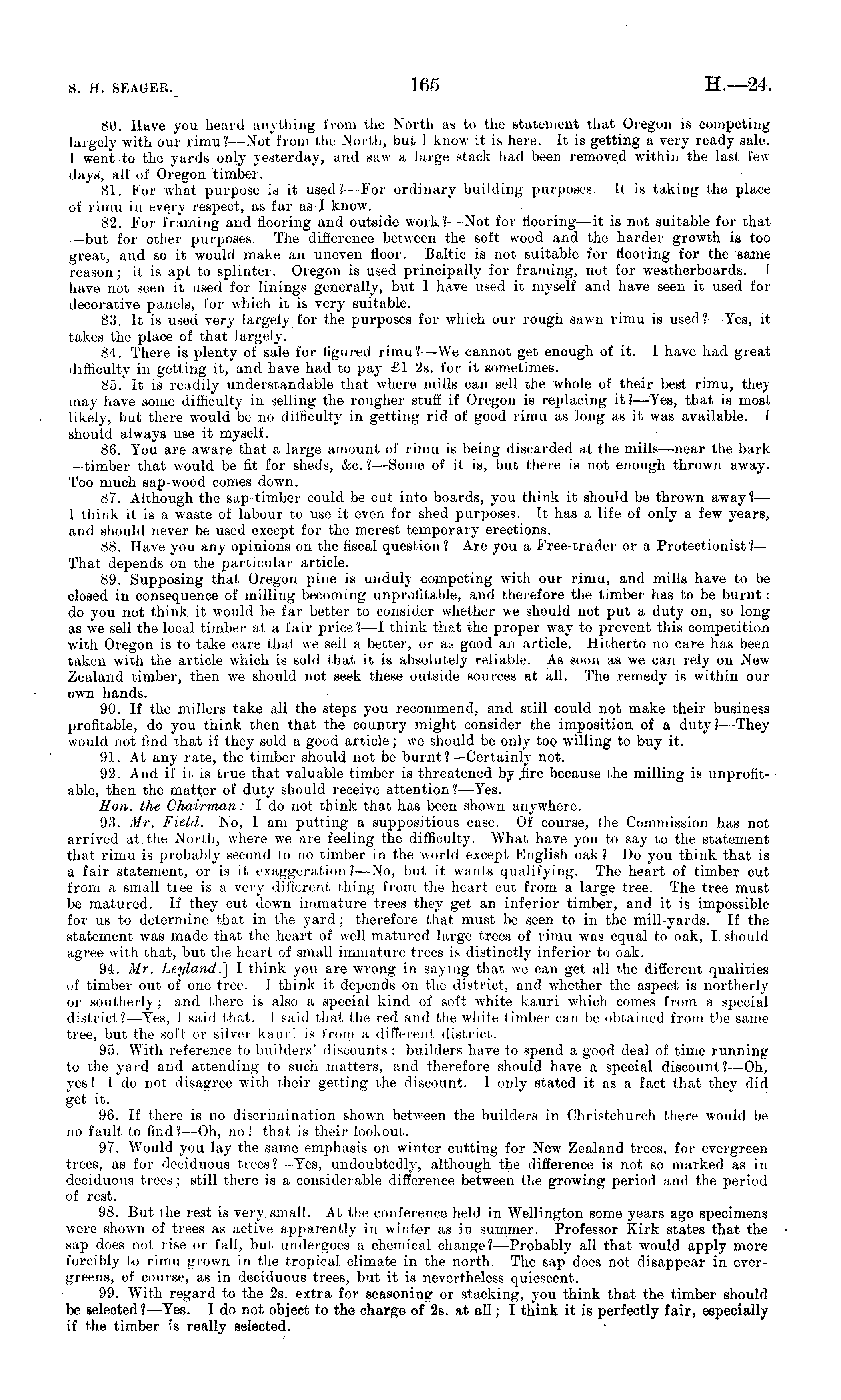 80. Have you heard anything from the North us to the statement tiiat Oregon is competing hugely with our rimu ? —Not from the North, but J know it is here. It is getting a very ready sale. 1 went to the yards only yesterday, and saw a large stack had been removed withiji the last few days, all of Oregon timber. 81. For what purpose is it used?— For ordinary building purposes. It is taking the place of rimu in every respect, as far as I know. 82. For framing and flooring and outside work? —Not for flooring—it is not suitable for that —but for other purposes. The difference between the soft wood and the harder growth is too great, and so it would make an uneven floor. Baltic is not suitable for flooring for the same reason j it is apt to splinter. Oregon is used principally for framing, not for weatherboards. 1 have not seen it used for Hningss generally, but I have used it myself and have seen it used for decorative panels, for which it ib very suitable. 83. It is used very largely for the purposes for which our rough sawn rimu is used I—Yes, it takes the place of that largely. 84. There is plenty of sale for figured rimu?—We cannot get enough of it. 1 have had great difficulty in getting it, and have had to pay .£1 2s. for it sometimes. 85. It is readily understandable that where mills can sell the whole of their best rimu, they may have some difficulty in selling the rougher stuff if Oregon is replacing it?— Yes, that is most likely, but there would be no difficulty in getting rid of good rimu as long as it was available. 1 should always use it myself. 86. You are aware that a large amount of rimu is being discarded at the mills—near the bark —timber that would be fit for sheds, &c. ? —Some of it is, but there is not enough thrown away. Too much sap-wood comes down. 87. Although the sap-timber could be cut into boards, you think it should be thrown away?— I think it is a waste of labour to use it even for shed purposes. It has a life of only a few years, and should never be used except for the merest temporary erections. 88. Have you any opinions on the fiscal question? Are you a Free-trader or a Protectionist?— That depends on the particular article. 89. Supposing that Oregon pine is unduly competing with our rimu, and mills have to be closed in consequence of milling becoming unprofitable, and therefore the timber has to be burnt : do you not think it would be far better to consider whether we should not put a duty on, so long as we sell the local timber at a fair price?—l think that the proper way to prevent this competition with Oregon is to take care that we sell a better, or as good an article. Hitherto no care has been taken with the article which is sold that it is absolutely reliable. As soon as we can rely on New Zealand timber, then we should not seek these outside sources at all. The remedy is within our own hands. 90. If the millers take all the steps you recommend, and still could not make their business profitable, do you think then that the country might consider the imposition of a duty?— They would not find that if they sold a good article; we should be only too willing to buy it. 91. At any rate, the timber should not be burnt?— Certainly not. 92. And if it is true that valuable timber is threatened by .fire because the milling is unprofitable, then the matter of duty should receive attention ?—Yes. Hon. the Chairman: Ido not think that has been shown anywhere. 93. Mr. Field. No, 1 am putting a suppo;?itious case. Of course, the Commission has not arrived at the North, where we are feeling the difficulty. What have you to say to the statement that rimu is probably second to no timber in the world except English oak ? Do you think that is a fair statement, or is it exaggeration?—No, but it wants qualifying. The heart of timber cut from a small tree is a very different thing from the heart cut from a large tree. The tree must be matured. If they cut down immature trees they get an inferior timber, and it is impossible for us to determine that in the yard ; therefore that must be seen to in the mill-yards. If the statement was made that the heart of well-matured large trees of rimu was equal to oak, I. should agree with that, but the heart of small immature trees is distinctly inferior to oak. 94. Mr. Leyland.] I think you are wrong in saying that we can get all the different qualities of timber out of one tree. I think it depends on the district, and whether the aspect is northerly <>r southerly; and there is also a special kind of soft white kauri which comes from a special district? —Yes, I said that. I said that the red and the white timber can be obtained from the same I ice, but the soft or silver kauri is from a different district. 95. With reference to builders' discounts : builders have to spend a good deal of time running to the yard and attending to such matters, and therefore should have a special discount?—Oh, yes ! I do not disagree with their getting the discount. 1 only stated it as a fact that they did get it. 96. If there is no discrimination shown between the builders in Christchurch there would be no fault to find? —Oh, no ! that is their lookout. 97. Would you lay the same emphasis on winter cutting for New Zealand trees, for evergreen trees, as for deciduous trees ?—Yes, undoubtedly, although the difference is not so marked as in deciduous trees; still there is a considerable difference between the growing period and the period of rest. 98. But the rest is very, small. At the conference held in Wellington some years ago specimens were shown of trees as active apparently in winter as in summer. Professor Kirk states that the sap does not rise or fall, but undergoes a chemical change? —Probably all that would apply more forcibly to rimu grown in the tropical climate in the north. The sap does not disappear in evergreens, of course, as in deciduous trees, but it is nevertheless quiescent. 99. With regard t