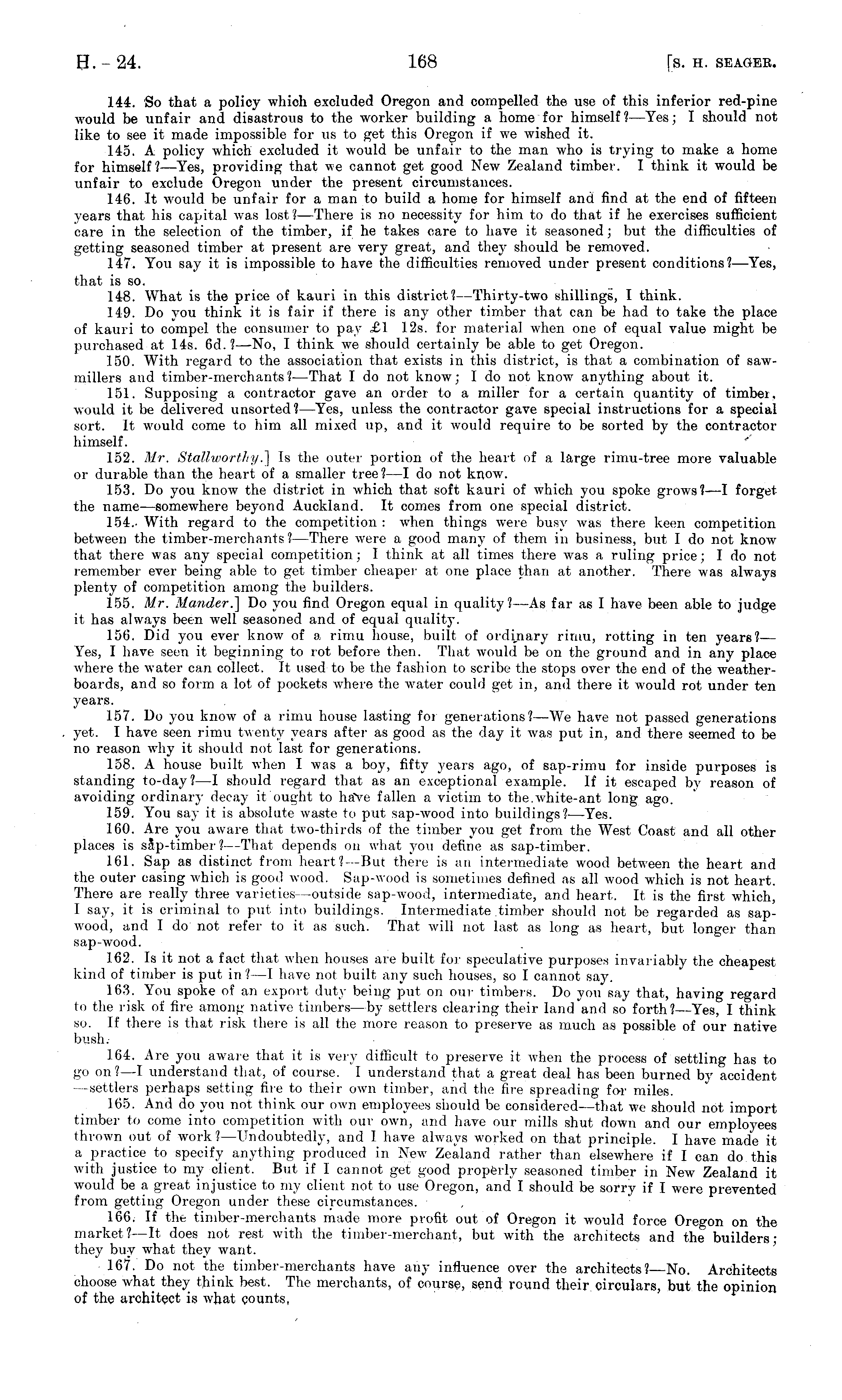 144. So that a policy which excluded Oregon and compelled the use of this inferior red-pine would be unfair and disastrous to the worker building a home for himself ?—Yes; I should not like to see it made impossible for us to get this Oregon if we wished it. 145. A policy which excluded it would be unfair to the man who is trying to make a home for himself? —Yes, providing that we cannot get good New Zealand timber. I think it would be unfair to exclude Oregon under the present circumstances. 146. It would be unfair for a man to build a home for himself and find at the end of fifteen years that his capital was lost?— There is no necessity for him to do that if he exercises sufficient care in the selection of the timber, if he takes care to have it seasoned; but the difficulties of getting seasoned timber at present are very great, and they should be removed. 147. You say it is impossible to have the difficulties removed under present conditions? —Yes, that is so. 148. What is the price of kauri in this district? —Thirty-two shillings, I think. 149. Do you think it is fair if there is any other timber that can be had to take the place of kauri to compel the consumer to pay £1 12s. for material when one of equal value might be purchased at 14s. 6d. I—No,1 —No, I think we should certainly be able to get Oregon. 150. With regard to the association that exists in this district, is that a combination of sawmillers and timber -merchants I—That1 —That I do not know; I do not know anything about it. 151. Supposing a contractor gave an order to a miller for a certain quantity of timber, would it be delivered unsorted?—Yes, unless the contractor gave special instructions for a special sort. It would come to him all mixed up, and it would require to be sorted by the contractor himself. 152. Mr. Stattworthy.] Is the outer portion of the heart of a large rimu-tree more valuable or durable than the heart of a smaller tree?—l do not know. 153. Do you know the district in which that soft kauri of which you spoke grows?—l forget the name —somewhere beyond Auckland. It comes from one special district. 154.- With regard to the competition : when things were busy was there keen competition between the timber-merchants? —There were a good many of them in business, but I do not know that there was any special competition; I think at all times there was a ruling price; I do not remember ever being able to get timber cheaper at one place than at another. There was always plenty of competition among the builders. 155. Mr. Mander.] Do you find Oregon equal in quality?—As far as I have been able to judge it has always been well seasoned and of equal quality. 156. Did you ever know of a rimu house, built of ordinary rirmi, rotting in ten years?— Yes, I have seen it beginning to rot before then. That would be on the ground and in any place where the water can collect. It used to be the fashion to scribe the stops over the end of the weatherboards, and so form a lot of pockets where the water could get in, and there it would rot under ten years. 157. Do you know of a rimu house lasting for generations?—We have not passed generations yet. I have seen rimu twenty years after as good as the day it was put in, and there seemed to be no reason why it should not last for generations. 158. A house built when I was a boy, fifty years ago, of sap-rimu for inside purposes is standing to-day I —l should regard that as an exceptional example. If it escaped by reason of avoiding ordinary decay it ought to haVe fallen a victim to the.white-ant long ago. 159. You say it is absolute waste to put sap-wood into buildings?— Yes. 160. Are you aware that two-thirds of the timber you get from the West Coast and all other places is sap-timber?— That depends on what you define as sap-timber. 161. Sap as distinct from heart?— But there is an intermediate wood between the heart and the outer casing which is good wood. Sap-wood is sometimes defined as all wood which is not heart. There are really three varieties—outside sap-wood, intermediate, and heart. It is the first which, I say, it is criminal to put into buildings. Intermediate .timber should not be regarded as sapwood, and I do not refer to it as such. That will mil last as long m heart, but longer than sap-wood. 162. Is it not a fact that when houses are built for speculative purposes invariably the cheapest kind of timber is put in ?—I have not built any such houses, so I cannot say. 163. You spoke of an export duty being put on our timbers. Do you say that, having regard to the risk of fire among native timbers—by settlers clearing their land and so forth?— Yes, I think so. If there is that risk there is all the more reason to preserve as much as possible of our native bush. 164. Are you aware that it is very difficult to preserve it when the process of settling has to go on?—I understand that, of course. I understand that a great deal has been burned by accident —settlers perhaps setting fire to their own timber, ami the fire spreading for miles. 165. And do you not think our own employees should be considered— that we should not import timber to come into competition with our own, and have our mills shut down and our employees thrown out of work/—Undoubtedly, and I have always worked on that principle. I have made it a practice to specify anything produced in New Zealand rather than elsewhere if I can do this with justice to my client. But if I cannot get good properly seasoned timber in New Zealand it would be a great injustice to my client not to use Oregon, and I should be sorry if I were prevented from getting Oregon under these circumstances. 166. If the timber-merchants made more profit out of Oregon it would force Oregon on the market? —It does not rest with the timber-merchant, but with the architects and the builders; they buy what they want. 167. Do not the timber-merchants have any influence over the architects?