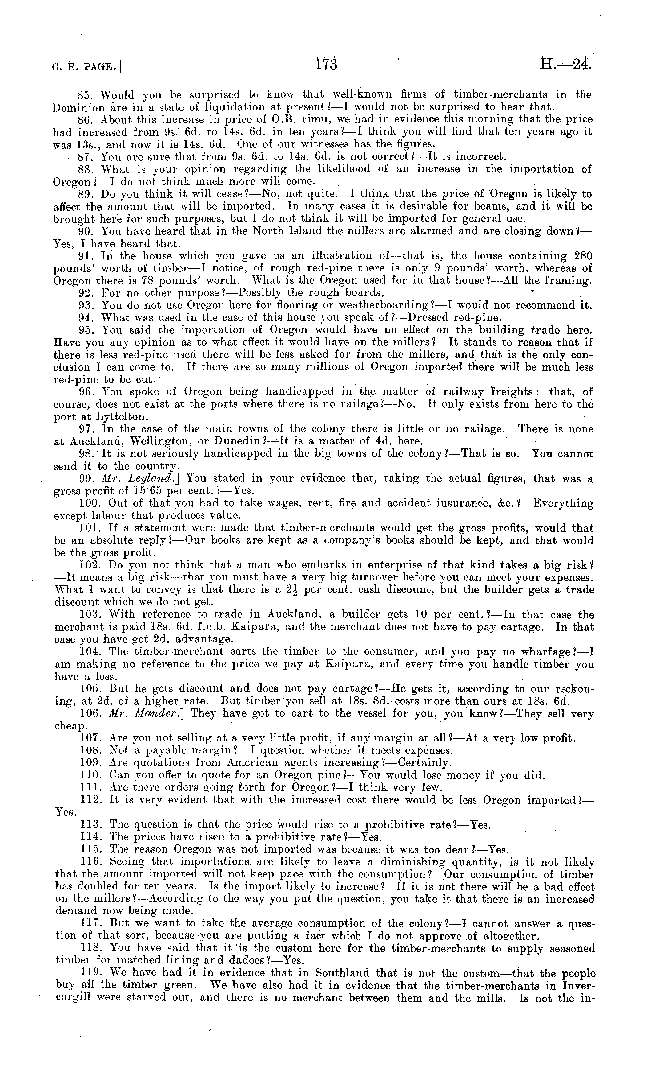 85. Would you be surprised to know that well-known firms of timber-merchants in the Dominion are in a state of liquidation at present?—l would not be surprised to hear that. 86. About this increase in price of 0.8. rimu, we had in evidence this morning that the price had increased from 9s. 6d. to 14s. 6d. in ten years?—l think you will find that ten years ago it was 135., and now it is 14s. 6d. One of our witnesses has the figures, 87. You are sure that from 9s. 6d. to 14s. 6d. is not correct? —It is incorrect. 88. What is your opinion regarding the likelihood of an increase in the importation of Oregon?—l do not think much more will come. 89. Do you think it will cease?—No, not quite. I think that the price of Oregon is likely to affect the amount that will be imported. In many cases it is desirable for beams, and it will be brought here for such purposes, but I do not think it will be imported for general use. 90. You have heard that in the North Island the millers are alarmed and are closing down?— Yes, I have heard that. 91. In the house which you gave us an illustration of—that is, the house containing 280 pounds' worth of timber —I notice, of rough red-pine there is only 9 pounds' worth, whereas of Oregon there is 78 pounds' worth. What is the Oregon used for in that house? —All the framing. 92. For no other purpose?— Possibly the rough boards. 93. You do not use Oregon here for flooring or weatherboarding?—l would not recommend it. 94. What was used in the case of this house you speak of?— Dressed red-pine. 95. You said the importation of Oregon would have no effect on the building trade here. Have you any opinion as to what effect it would have on the millers I —lt stands to reason that if there is less red-pine used there will be less asked for from the millers, and that is the only conclusion I can come to. If there are so many millions of Oregon imported there will be much less red-pine to be cut. 96. You spoke of Oregon being handicapped in the matter of railway freights : that, of course, does not exist at the ports where there is no railage?— No. It only exists from here to the port at Lyttelton. 97. In the case of the main towns of the colony there is little or no railage. There is none at Auckland, Wellington, or Dunedin? —It is a matter of 4d. here. 98. It is not seriously handicapped in the big towns of the colony?— That is so. You cannot send it to the country. 99. Mr. Leyland.] You stated in your evidence that, taking the actual figures, that was a gross profit of 15"65 per cent. ?—Yes. 100. Out of that you had to take wages, rent, fire and accident insurance, &c. ?—Everything except labour that produces value. 101. If a statement were made that timber-merchants would get the gross profits, would that be an absolute reply?— Our books are kept as a (.ompany's books should be kept, and that would be the gross profit. 102. Do you not think that a man who embarks in enterprise of that kind takes a big risk? —It means a big risk —that you must have a very big turnover before you can meet your expenses. What I want to convey is that there is a 2| per cent, cash discount, but the builder gets a trade discount which we do not get. 103. With reference to trade in Auckland, a builder gets 10 per cent. ?—ln that case the merchant is paid 18s. 6d. f.o.b. Kaipara, and the merchant does not have to pay cartage. In that case you have got 2d. advantage. 104. The timber-merchant carts the timber to the consumer, and you pay no wharfage?—l am making no reference to the price we pay at Kaipara, and every time you handle timber you have a loss. 105. But he gets discount and does not pay cartage?—He gets it, according to our reckoning, at 2d. of a higher rate. But timber you sell at 18s. Bd. costs more than ours at 18s. 6d. 106. Mr. Mander.] They have got to cart to the vessel for you, you know? —They sell very cheap. 107. Are you not selling at a very little profit, if any margin at all?—At a very low profit. 108. Not a payable margin?—l question whether it meets expenses. 109. Are quotations from American agents increasing?— Certainly. 110. Can you offer to quote for an Oregon pine?— You would lose money if you did. 111. Are there orders going forth for Oregon?—l think very few. 112. It is very evident that with the increased cost there would be less Oregon imported?— Yes. 113. The question is that the price would rise to a prohibitive rate?— Yes. 114. The prices have risen to a prohibitive rate?— Yes. 115. The reason Oregon was not imported was because it was too dear?— Yes. 116. Seeing that importations, are likely to leave a diminishing quantity, is it not likely that the amount imported will not keep pace with the consumption? Our consumption of timbei has doubled for ten years. Is the import likely to increase? If it is not there will be a bad effect on the millers? —According to the way you put the question, you take it that there is an increased demand now being made. 117. But we want to take the average consumption of the colony?—I cannot answer a question of that sort, because you are putting a fact which I do not approve of altogether. 118. You have said that it'is the custom here for the timber-merchants to supply seasoned timber for matched lining and dadoes? —Yes. 119. We have had it in evidence that in Southland that is not the custom—that the people buy all the timber green. We have also had it in evidence that the timber-merchants in Invercargill were starved out, and there is no merchant between them and the mills. Is not the in-