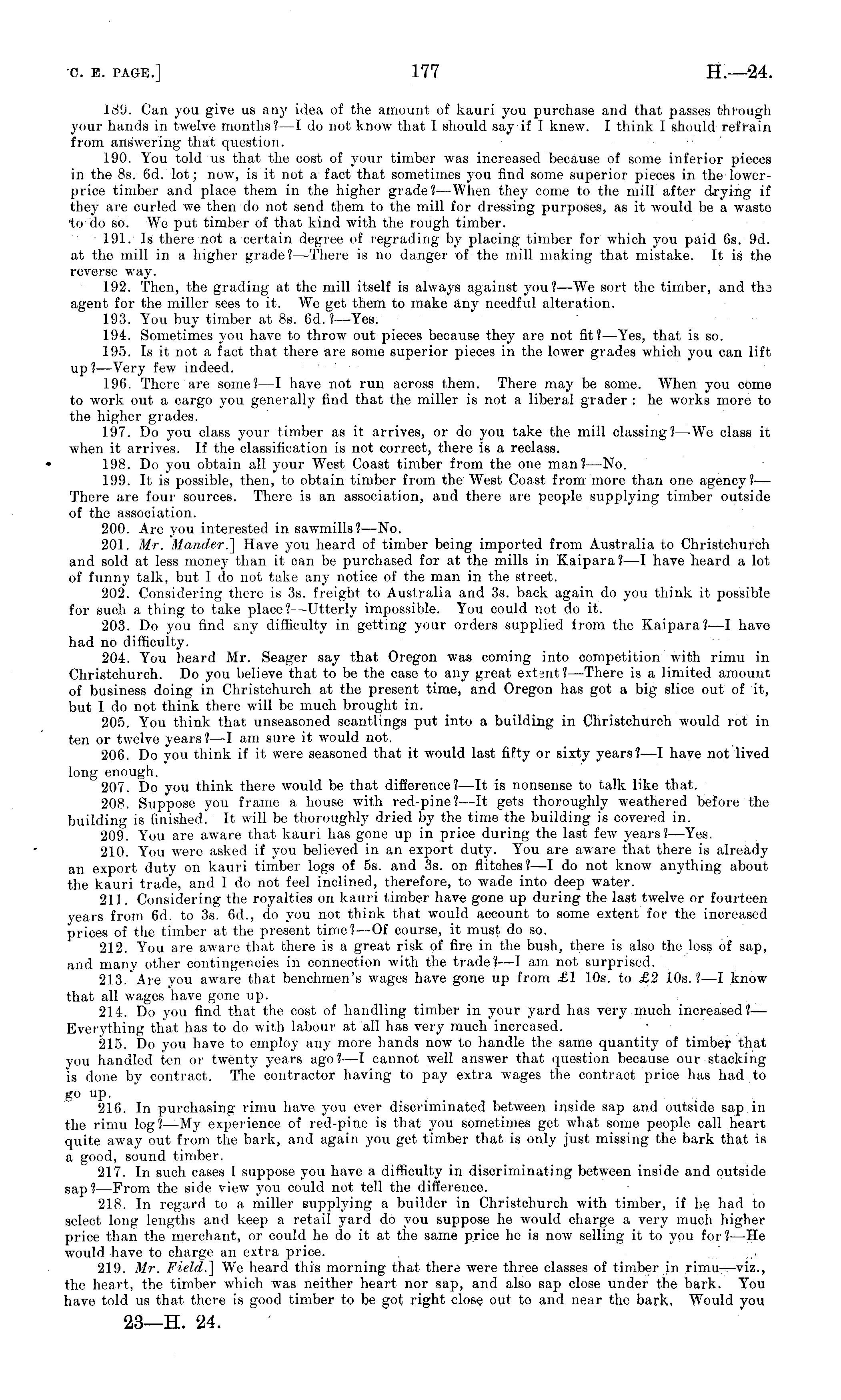 18'j. Can you give us any idea of the amount of kauri you purchase and that passes through your hands in twelve months?—l do not know that I should say if I knew. I think I should refrain from answering that question. 190. You told us that the cost of your timber was increased because of some inferior pieces in the Bs. 6d. lot; now, is it not a fact that sometimes you find some superior pieces in thelower- ,- price timber and place them in the higher grade?— When they come to the mill after d.rying if they are curled we then do not send them to the mill for dressing purposes, as it would be a waste 'to do so. We put timber of that kind with the rough timber. 191. Is there not a certain degree of regrading by placing timber for which you paid 6s. 9d. at the mill in a higher grade ?—There is no danger of the mill making that mistake. It is the reverse way. 192. Then, the grading at the mill itself is always against you?—We sort the timber, and tha agent for the miller sees to it. We get them to make any needful alteration. 193. You buy timber at Bs. 6d. ?—Yes. 194. Sometimes you have to throw out pieces because they are not fit?— Yes, that is so. 195. Is it not a fact that there are some superior pieces in the lower grades which you can lift up?— Very few indeed. 196. There are some?—l have not run across them. There may be some. When you come to work out a cargo you generally find that the miller is not a liberal grader : he works more to the higher grades. 197. Do you class your timber as it arrives, or do you take the mill classing?—We class it when it arrives. If the classification is not correct, there is a reclass. 198. Do you obtain all your West Coast timber from the one man?— No. 199. It is possible, then, to obtain timber from the West Coast from more than one agency?— There are four sources. There is an association, and there are people supplying timber outside of the association. 200. Are you interested in sawmills? —No. 201. Mr. Mander.] Have you heard of timber being imported from Australia to Christchurch and sold at less money than it can be purchased for at the mills in Kaipara ? —I have heard a lot of funny talk, but I do not take any notice of the man in the street. 202. Considering there is 3s. freight to Australia and 3s. back again do you think it possible for such a thing to take place?— Utterly impossible. You could not do it. 203. Do you find any difficulty in getting your orders supplied from the Kaipara?—l have had no difficulty. 204. You heard Mr. Seager say that Oregon was coming into competition with rimu in Christchurch. Do you believe that to be the case to any great extent? —There is a limited amount of business doing in Christchurch at the present time, and Oregon has got a big slice out of it, but I do not think there will be much brought in. 205. You think that unseasoned scantlings put into a building in Christchurch would rot in ten or twelve years? —I am sure it would not. 206. Do you think if it were seasoned that it would last fifty or sixty years?—l have not lived long enough. 207. Do you think there would be that difference? —It is nonsense to talk like that. 208. Suppose you frame a house with red-pine?—lt gets thoroughly weathered before the building is finished. It will be thoroughly dried by the time the building is covered in. 209. You are aware that kauri has gone up in price during the last few years?— Yes. 210. You were asked if you believed in an export duty. You are aware that there is already an export duty on kauri timber logs of ss. and 3s. on flitches?—l do not know anything about the kauri trade, and I do not feel inclined, therefore, to wade into deep water. 211. Considering the royalties on kauri timber have gone up during the last twelve or fourteen years from 6d. to 3s. 6d., do you not think that would account to some extent for the increased prices of the timber at the present time?—Of course, it must do so. 212. You are aware that there is a great risk of fire in the bush, there is also the loss of sap, and many other contingencies; in connection with the trade?—l am not surprised. 213. Are you aware that henchmen's wages have gone up from ,£1 10s. to £2 10s.?—I know that all wages have gone up. 214. Do you find that the cost of handling timber in your yard has very much increased?— Everything that has to do with labour at all has very much increased. 215. Do you have to employ any more hands now to handle the same quantity of timber that you handled ten or twenty years ago?—l cannot well answer that question because our stacking is done by contract. The contractor having to pay extra wages the contract price has had to 8° U P--216. In purchasing rimu have you ever discriminated between inside sap and outside sap in the rimu log?—My experience of red-pine is that you sometimes get what some people call heart quite away out from the bark, and again you get timber that is only just missing the bark that is a good, sound timber. 217. In such cases I suppose you have a difficulty in discriminating between inside and outside sa p I —From the side view you could not tell the difference. 218. In regard to a miller supplying a builder in Christchurch with timber, if he had to select long lengths and keep a retail yard do you suppose he would charge a very much higher price than the merchant, or could he do it at the same price he is now selling it to you for? —He would have to charge an extra price. 219. Mr. Field.'] We heard this morning that there were three classes of timber in rimu—viz., the heart, the timber which was neither heart nor sap, and also sap close under the bark. You have told us that there is good timber to be got right close out to and near the bark. Would you