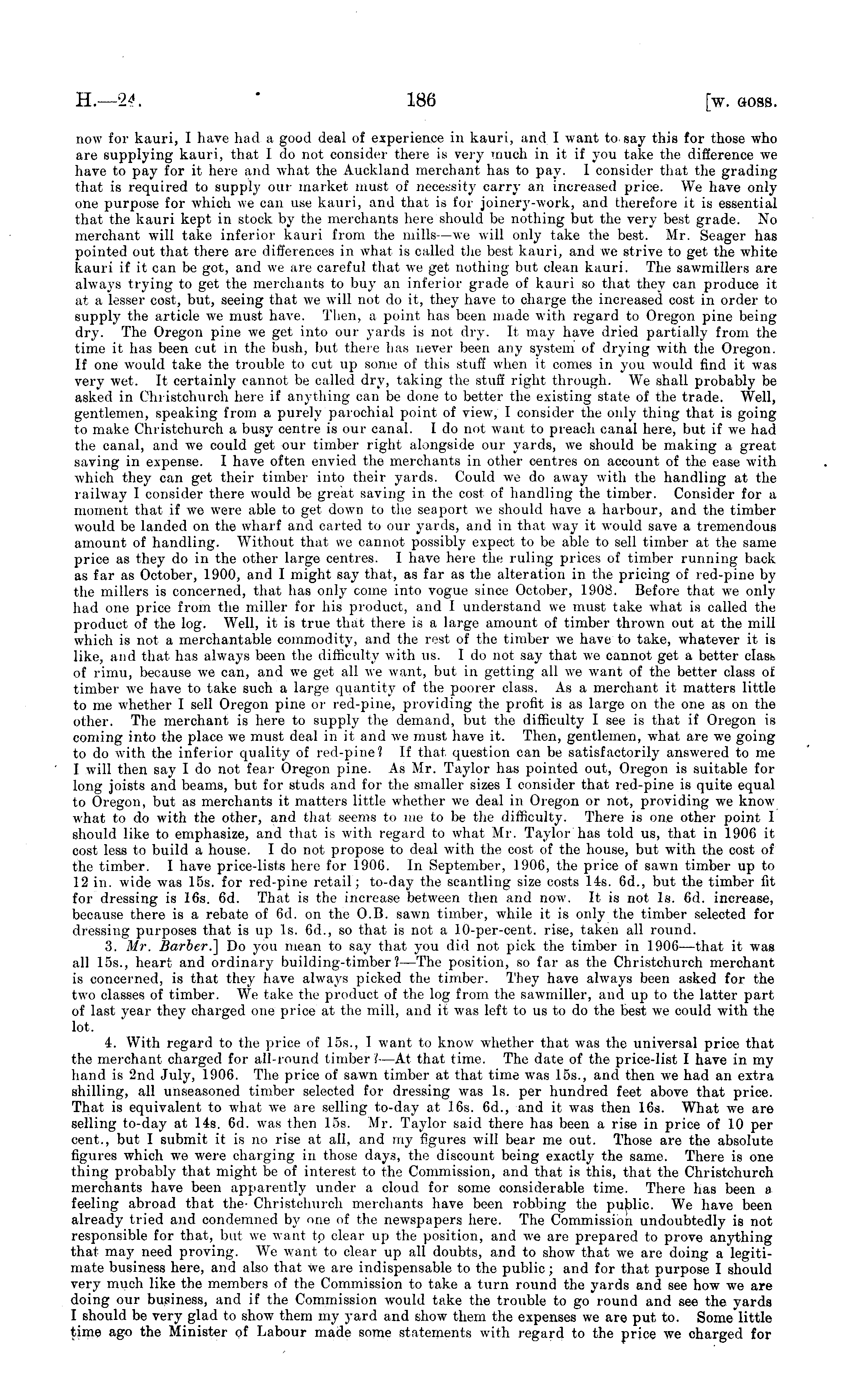 now for kauri, I have had a good deal of experience in kauri, and I want to say this for those who are supplying kauri, that I do not consider there is very much in it if you take the difference we have to pay for it here and what the Auckland merchant has to pay. 1 consider that the grading that is required to supply our market must of necessity carry an increased price. We have only one purpose for which we can use kauri, and that is for joinery-work, and therefore it is essential that the kauri kept in stock by the merchants here should be nothing but the very best grade. No merchant will take inferior kauri from the mills—we will only take the best. Mr. Seager has pointed out that there are differences in what is called the best kauri, and we strive to get the white kauri if it can be got, and we are careful that we get nothing but clean kauri. The sawmillers are always trying to get the merchants to buy an inferior grade of kauri so that they can produce it at a lesser cost, but, seeing that we will not do it, they have to charge the increased cost in order to supply the article we must have. Then, a point has been made with regard to Oregon pine being dry. The Oregon pine we get into our yards is not dry. It may have dried partially from the time it has been cut in the bush, but there has never been any system of drying with the Oregon. If one would take the trouble to cut up some of this stuff when it comes in you would find it was very wet. It certainly cannot be called dry, taking the stuff right through. We shall probably be asked in Christchurch here if anything can be done to better the existing state of the trade. Well, gentlemen, speaking from a purely parochial point of view, I consider the only thing that is going to make Christchurch a busy centre is our canal. Ido not want to preach canal here, but if we had the canal, and we could get our timber right alongside our yards, we should be making a great saving in expense. I have often envied the merchants in other centres on account of the ease with which they can get their timber into their yards. Could we do away with the handling at the railway I consider there would be great saving in the cost of handling the timber. Consider for a moment that if we were able to get down to the seaport we should have a harbour, and the timber would be landed on the wharf and carted to our yards, and in that way it would save a tremendous amount of handling. Without that we cannot possibly expect to be able to sell timber at the same price as they do in the other large centres. I have here the ruling prices of timber running back as far as October, 1900, and I might say that, as far as the alteration in the pricing of red-pine by the millers is concerned, that has only come into vogue since October, 1908. Before that we only had one price from the miller for his product, and I understand we must take what is called the product of the log. Well, it is true that there is a large amount of timber thrown out at the mill which is not a merchantable commodity, and the rest of the timber we have to take, whatever it is like, and that has always been the difficulty with us. Ido not say that we cannot get a better class of rimu, because we can, and we get all we want, but in getting all we want of the better class of timber we have to take such a large quantity of the poorer class. As a merchant it matters little to me whether I sell Oregon pine or red-pine, providing the profit is as large on the one as on the other. The merchant is here to supply the demand, but the difficulty I see is that if Oregon is coming into the place we must deal in it and we must have it. Then, gentlemen, what are we going to do with the inferior quality of red-pine? If that question can be satisfactorily answered to me I will then say Ido not fear Oregon pine. As Mr. Taylor has pointed out, Oregon is suitable for long joists and beams, but for studs and for the smaller sizes I consider that red-pine is quite equal to Oregon, but as merchants it matters little whether we deal in Oregon or not, providing we know what to do with the other, and that seems to me to be the difficulty. There is one other point I should like to emphasize, and that is with regard to what Mr. Taylor has told us, that in 1906 it cost less to build a house. Ido not propose to deal with the cost of the house, but with the cost of the timber. I have price-lists here for 190 G. In September, 1906, the price of sawn timber up to 12 in. wide was 15s. for red-pine retail; to-day the scantling size costs 14s. 6d., but the timber fit for dressing is 16s. 6d. That is the increase between then and now. It is not Is. 6d. increase, because there is a rebate of 6d. on the 0.8. sawn timber, while it is only the timber selected for dressing purposes that is up Is. 6d., so that is not a 10-per-cent. rise, taken all round. 3. Mr. Barber.] Do you mean to say that you did not pick the timber in 1906—that it was all 155., heart and ordinary building-timber?— The position, so far as the Christchurch merchant is concerned, is that they have always picked the timber. They have always been asked for the two classes of timber. We take the product of the log from the sawmiller, and up to the latter part of last year they charged one price at the mill, and it was left to us to do the best we could with the lot, 4. With regard to the price of 155., I want to know whether that was the universal price that the merchant charged for all-round timber? —At that time. The date of the price-list I have in my hand is 2nd July, 1906. The price of sawn timber at that time was 155., and then we had an extra shilling, all unseasoned timber selected for dressing was Is. per hundred feet above that price. That is equivalent to what we are selling to-day at 16s. 6d., and it was then 16s. What we are selling to-day at 14s. 6d. was then 15s. Mr. Taylor said there has been a rise in price of 10 per cent., but I submit it is no rise a