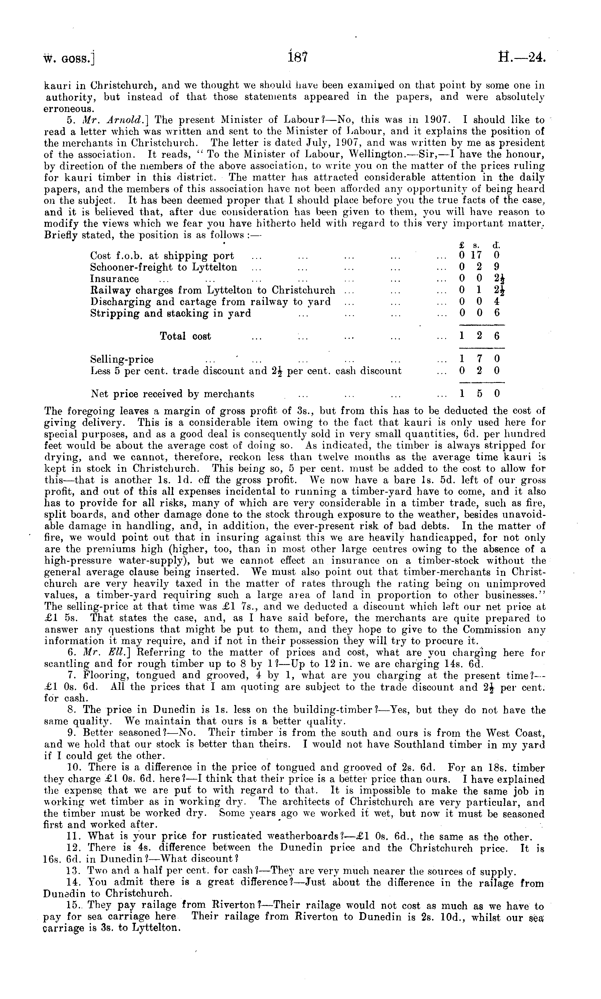 kauri in (Jhristchurch, and we thought we should have been examined on that point by some one in authority, but instead of that those statements appeared in the papers, and -were absolutely erroneous. 5. Mr. Arnold.] The present Minister of Labour?—No, this was in 1907. I should like to read a letter which was written and sent to the Minister of Labour, and it explains the position of the merchants in Christchurch. The letter is dated July, 1907, and was written by me as president of the association. It reads, "To the Minister of Labour, Wellington. —Sir, —I have the honour, by direction of the members of the above association, to write you on the matter of the prices ruling for kauri timber in this district. The matter has attracted considerable attention in the daily papers, and the members of this association have not been afforded any opportunity of being heard on the subject. It has been deemed proper that 1 should place before you the true facts of the case, and it is believed that, after due consideration has been given to them, you will have reason to modify the views which we fear you have hitherto held with regard to this very important matter. Briefly stated, the position is as follows : — £ s. d. Cost f.o.b. at shipping port ... ... ... ... ... 0170 Schooner-freight to Lyttelton ... ... ... ... ...029 Insurance ... ... ... ... ... ... ... 0 0 2J Railway charges from Lyttelton to Christchurch ... ... ... 0 1 2J Discharging and cartage from railway to yard ... ... ... 004 Stripping and stacking in yard ... ... ... ... 006 Total cost ... ... ... ... ... 1 2 6 Selling-price ... ... ... ... ... ...170 Less 5 per cent, trade discount and 2J per cent, cash discount ... 0 2 0 Net price received by merchants ... ■■• ... ...150 The foregoing leaves a margin of gross profit of 35., but from this has to be deducted the cost of giving delivery. This is a considerable item owing to the fact that kauri is only used here for special purposes, and as a good deal is consequently sold in very small quantities, 6d. per hundred feet would be about the average cost of doing so. As indicated, the timber is always stripped for drying, and we cannot, therefore, reckon less than twelve months as the average time kauri is kept in stock in Christchurch. This being so, 5 per cent, must be added to the cost to allow for this —that is another Is. Id. off the gross profit. We now have a bare Is. sd. left of our gross profit, and out of this all expenses incidental to running a timber-yard have to come, and it also has to provide for all risks, many of which are very considerable in a timber trade, such as fire, split boards, and other damage done to the stock through exposure to the weather, besides unavoidable damage in handling, and, in addition, the ever-present risk of bad debts. In the matter of fire, we would point out that in insuring against this we are heavily handicapped, for not onlyare the premiums high (higher, too, than in most other large centres owing to the absence of a high-pressure water-supply), but we cannot effect an insurance on a timber-stock without the general average clause being inserted. We must also point out that timber-merchants in Christchurch are very heavily taxed in the matter of rates through the rating being on unimproved values, a timber-yard requiring such a large area of land in proportion to other businesses." The selling-price at that time was £1 75., and we deducted a discount which left our net price at £1 ss. That states the case, and, as I have said before, the merchants are quite prepared to answer any questions that might be put to them, and they hope to give to the Commission any information it may require, and if not in their possession they will try to procure it. 6. Mr. Ell.] Referring to the matter of prices and cost, what are you charging here for scantling and for rough timber up to 8 by 1? —Up to 12 in. we are charging 14s. 6d. 7. Flooring, tongued and grooved, 4 by 1, what are you charging at the present time?- - £1 os. 6d. All the prices that I am quoting are subject to the trade discount and 1\ per cent. for cash. 8. The price in Dunedin is Is. less on the building-timber?— Yes, but they do not have the same qualit}'. We maintain that ours is a better quality. 9. Better seasoned?— No. Their timber is from the south and ours is from the West Coast, and we hold that our stock is better than theirs. I would not have Southland timber in my yard if I could get the other. 10. There is a difference in the price of tongued and grooved of 2s. 6d. For an 18s. timber they charge £1 os. 6d. here? —I think that their price is a better price than ours. I have explained the expense, that we are put to with regard to that. It is impossible to make the same job in working wet timber as in working dry. The architects of Christchurch are very particular, and the timber must be worked dry. Some years ago we worked it wet, but now it must be seasoned first and worked after. 11. What is your price for rusticated weatherboards?—£l os. 6d., the same as the other. 12. There is 4s. difference between the Dunedin price and the Christchurch price. It is 16s. 6d. in Dunedin?—What discount? 13. Two and a half per cent, for cash?— They are very much nearer the sources of supply. 14. You admit there is a great difference?— Just about the difference in the railage from Dunedin to Christchurch. 15. They pay railage from Riverton ?—Their railage would not cost as much as we have to pay for sea carriage here Their railage from Riverton to Dunedin is 2s. 10d., whilst our sea carriage is 3s. to Lyttelton.