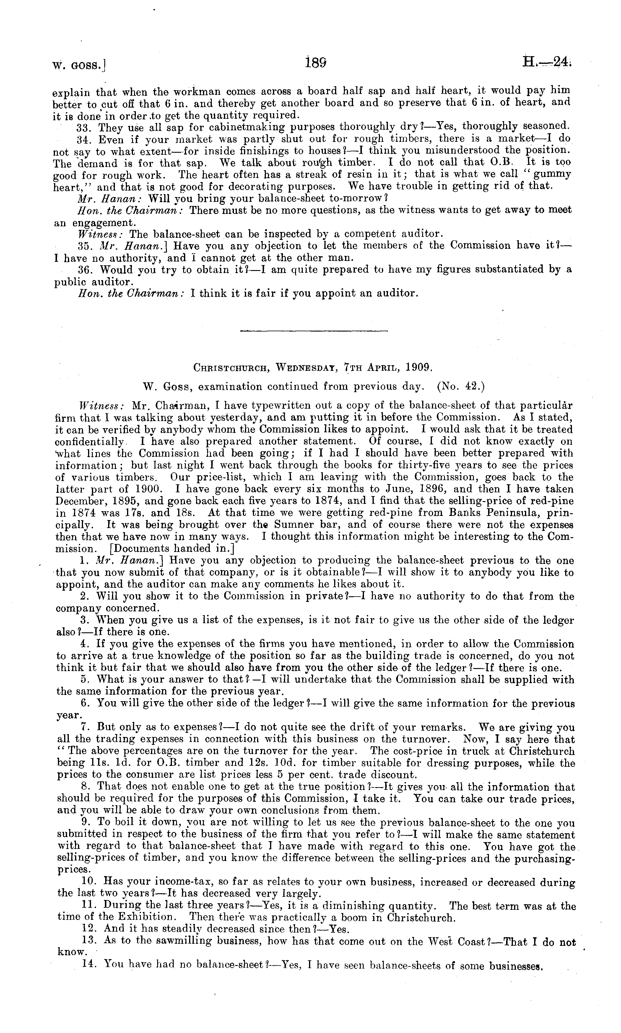 Christchurch, Wednesday, 7th April, 1909. W. Goss, examination continued from previous day. (No. 42.) Witness: Mr. Chairman, I have typewritten out a copy of the balance-sheet of that particular firm that I was talking about yesterday, and am putting it in before the Commission. As I stated, it can be verified by anybody whom the Commission likes to appoint. I would ask that it be treated confidentially I have also prepared another statement. Of course, I did not know exactly on "what lines the Commission had been going; if I had I should have been better prepared with information; but last night I went back through the books for thirty-five years to see the prices of various timbers. Our price-list, which I am leaving with the Commission, goes back to the latter part of 1900. I have gone back every six months to June, 1896, and then I have taken December, 1895, and gone back each five years to 1874, and I find that the selling-price of red-pine in 1874 was 17s. and 18s. At that time we were getting red-pine from Banks Peninsula, principally. It was being brought over the Sumner bar, and of course there were not the expenses then that we have now in many ways. I thought this information might be interesting to the Commission. [Documents handed in.] 1. Mr. Hanan.] Have you any objection to producing the balance-sheet previous to the one that you now submit of that company, or is it obtainable? —I will show it to anybody you like to appoint, and the auditor can make any comments he likes about it. 2. Will you show it to the Commission in private?—l have no authority to do that from the company concerned. 3. When you give us a list of the expenses, is it not fair to give us the other side of the ledger also ? —lf there is one. 4. If you give the expenses of the firms you have mentioned, in order to allow the Commission to arrive at a true knowledge of the position so far as the building trade is concerned, do you not think it but fair that we should also have from you the other side of the ledger ?—lf there is one. 5. What is your answer to that? —I will undertake that the Commission shall be supplied with the same information for the previous year. 6. You will give the other side of the ledger?—l will give the same information for the previous year. 7. But only as to expenses?—l do not quite see the drift of your remarks. We are giving you all the trading expenses in connection with this business on the turnover. Now, I say here that " The above percentages are on the turnover for the year. The cost-price in truck at Christchurch being 11s. Id. for 0.8. timber and 12s. 10d. for timber suitable for dressing purposes, while the prices to the consumer are list prices less 5 per cent, trade discount. 8. That does not enable one to get at the true position?—lt gives you all the information that should be required for the purposes of this Commission, I take it. You can take our trade prices, and you will be able to draw your own conclusions from them. 9. To boil it down, you are not willing to let us see the previous balance-sheet to the one you submitted in respect to the business of the firm that you refer to ?—I will make the same statement with regard to that balance-sheet that I have made with regard to this one. You have got the selling-prices of timber, and you know the difference between the selling-prices and the purchasingprices. 10. Has your income-tax, so far as relates to your own business, increased or decreased during the last two years ?—lt has decreased very largely. 11. During the last three years?-—Yes, it is a diminishing quantity. The best term was at the time of the Exhibition. Then there was practically a boom in Christchurch. 12. And it has steadily decreased since then?— Yes. 13. As to the sawmilling business, how has that come out on the West Coast?— That I do not know. 14. You have had no balance-sheet?— Yes, I have seen balance-sheets of some businesses.