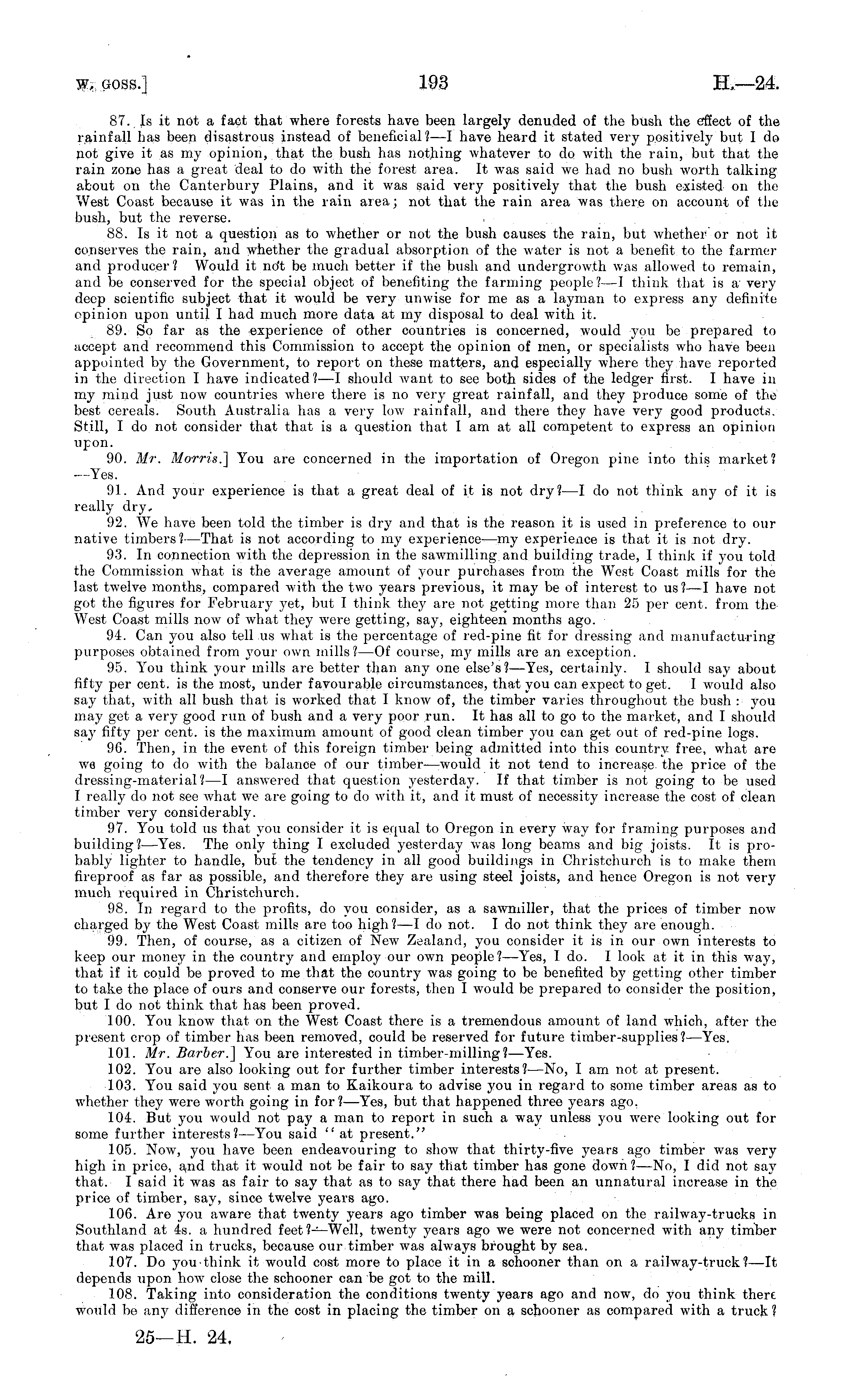 87. Is it not a fact that where forests have been largely denuded of the bush the effect of the rainfall has been disastrous instead of beneficial? —I have heard it stated very positively but Ido not give it as my opinion, that the bush has nothing whatever to do with the rain, but that the rain zone has a great deal to do with the forest area. It was said we had no bush worth talking about on the Canterbury Plains, and it was said very positively that the bush existed on the West Coast because it was in the rain area; not that the rain area was there on account of the bush, but the reverse. 88. Is it not a question as to whether or not the bush causes the rain, but whether or not it conserves the rain, and whether the gradual absorption of the water is not a benefit to the farmer ami producer? Would it not be much better if the bush and undergrowth was allowed t<> remain, and be conserved for the special object of benefiting the farming people?—l think that is a very deep scientific subject that it would be very unwise for me as a layman to express any definite opinion upon until I had much more data at my disposal to deal with it. 89. So far as the experience of other countries is concerned, would you be prepared to accept and recommend this Commission to accept the opinion of men, or specialists who have been appointed by the Government, to report on these matters, and especially where they have reported in the direction I have indicated?—l should want to see both sides of the ledger first. I have in my mind just now countries where there is no very great rainfall, and they produce some of the best cereals. South Australia has a very low rainfall, and there they have very good products. Still, I do not consider that that is a question that I am at all competent to express an opinion upon. 90. Mr. Morris.'] You are concerned in the importation of Oregon pine into this market? —Yes. 91. And your experience is that a great deal of it is not dry? —I do not think any of it is really dry. 92. We have been told the timber is dry and that is the reason it is used in preference to our native timbers ?—That is not according to my experience—my experience is that it is not dry. 93. In connection with the depression in the sawmilling and building trade, I think if you told the Commission what is the average amount of your purchases from the W T cst Coast mills for the last twelve months, compared with the two years previous, it may be of interest to us?—l have not got the figures for February yet, but I think they are not getting more than 25 per cent, from the West Coast mills now of what they were getting, say, eighteen months ago. 94. Can you also tell us what is the percentage of red-pine fit for dressing and manufacturing purposes obtained from your own mills? —Of course, my mills are an exception. 95. You think your mills are better than any one else's?—Yes, certainly. I should say about fifty per cent, is the most, under favourable circumstances, that you can expect to get. I would also say that, with all bush that is worked that I know of, the timber varies throughout the bush : you may get a very good run of bush and a very poor run. It has all to go to the market, and I should say fifty per cent, is the maximum amount of good clean timber you can get out of red-pine logs. 96. Then, in the event of this foreign timber being admitted into this country free, what are wa going to do with the balance of our timber —would it not tend to increase the price of the dressing-material?—l answered that question yesterday. If that timber is not going to be used I really do not see what we are going to do with it, and it must of necessity increase the cost of clean timber very considerably. 97. You told us that you consider it is equal to Oregon in every way for framing purposes and building?— Yes. The only thing I excluded yesterday was long beams and big joists. It is probably lighter to handle, but the tendency in all good buildings in Christchurch is to make them fireproof as far as possible, and therefore they are using steel joists, and hence Oregon is not very much required in Christchurch. 98. In regard to the profits, do you consider, as a sawmiller, that the prices of timber now charged by the West Coast mills are too high?—l do not. Ido not think they are enough. 99. Then, of course, as a citizen of New Zealand, you consider it is in our own interests to keep our money in the country and employ our own people?— Yes, I do. I look at it in this way, that if it could be proved to me that the country was going to be benefited by getting other timber to take the place of ours and conserve our forests, then I would be prepared to consider the position, but I do not think that has been proved. 100. You know that on the West Coast there is a tremendous amount of land which, after the present crop of timber has been removed, could be reserved for future timber-supplies?— Yes. 101. Mr. Barber.] You are interested in timber-milling?— Yes. 102. You are also looking out for further timber interests? —No, I am not at present. 103. You said you sent a man to Kaikoura to advise you in regard to some timber areas as to whether they were worth going in for?— Yes, but that happened three years ago. 104. But you would not pay a man to report in such a way unless you were looking out for some further interests? —You said "at present." 105. Now, you have been endeavouring to show that thirty-five years ago timber was very high in price, and that it would not be fair to say that timber has gone down ?—No, I did not say that. I said it was as fair to say that as to say that there had been an unnatural increase in the price of timber, say, since twelve years ago. 106. Are you aware that twenty years ago timber was being placed on the railway-trucks in Southland at 4s. a hundred feet?— Well, twenty years ago we were not concerned with any timber that was placed in trucks,