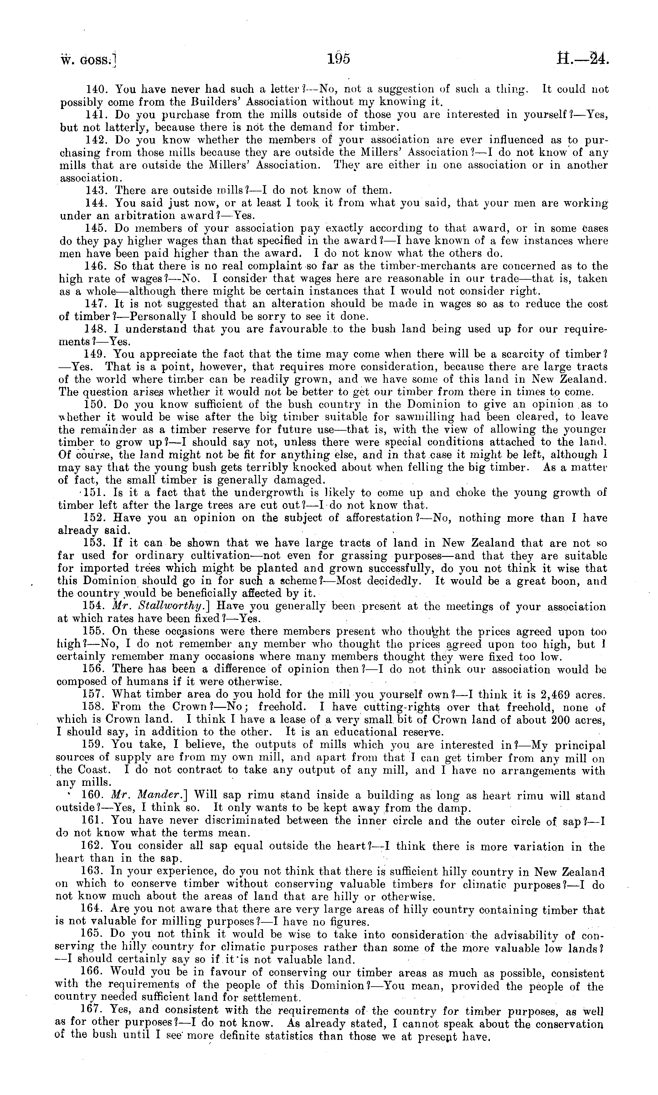140. You have never had such a letter? —No, not a suggestion of such a thing. It could not possibly come from the Builders' Association without my knowing it. 141. Do you purchase from the mills outside of those you are interested in yourself?— Yes, but not latterly, because there is not the demand for timber. 142. Do you know whether the members of your association are ever influenced as to purchasing from those mills because they are outside the Millers' Association?—l do not know of any mills that are outside the Millers' Association. They are either in one association or in another association. 143. There are outside mills? —I do not know of them. 144. You said just now, or at least I took it from what you said, that your men are working under an arbitration award?— Yes. 145. Do members of your association pay exactly according to that award, or in some cases do they pay higher wages than that specified in the award I—l1 —I have known of a few instances where men have been paid higher than the award. Ido not know what the others do. 146. So that there is no real complaint so far as the timber-merchants are concerned as to the high rate of wages?— No. I consider that wages here are reasonable in our trade—that is, taken as a whole —although there might be certain instances that I would not consider right. 147. It is not suggested that an alteration should be made in wages so as to reduce the cost of timber? —Personally I should be sorry to see it done. 148. I understand that you are favourable to the bush land being used up for our requirements? —Yes. 149. You appreciate the fact that the time may come when there will be a scarcity of timber? —Yes. That is a point, however, that requires more consideration, because there are large tracts of the world where timber can be readily grown, and we have some of this land in New Zealand. The question arises whether it would not be better to get our timber from there in times to come. 150. Do you know sufficient of the bush country in the Dominion to give an opinion as to whether it would be wise after the big timber suitable for sawmilling had been cleared, to leave the remainder as a timber reserve for future use —that is, with the view of allowing the youngei timber to grow up?—l should say not, unless there were special conditions attached to the land. Of course, the land might not be fit for anything else, and in that case it might be left, although I may say that the young bush gets terribly knocked about when felling the big timber. As a matter of fact, the small timber is generally damaged. •151. Is it a fact that the undergrowth is likely to come up and choke the young growth of timber left after the large trees are cut out?—l do not know that. 152. Have you an opinion on the subject of afforestation?—No, nothing more than I have already said. 153. If it can be shown that we have large tracts of land in New Zealand that are not so far used for ordinary cultivation —not even for grassing purposes—and that they are suitable for imported trees which might be planted and grown successfully, do you not think it wise that this Dominion should go in for such a scheme? —Most decidedly. It would be a great boon, and the country would be beneficially affected by it. 154. Mr. Stallworthy .] Have you generally been present at the meetings of your association at which rates have been fixed ?—Yes. 155. On these occasions were there members present who thought the prices agreed upon too high?—No, I do not remember any member who thought the prices agreed upon too high, but I certainly remember many occasions where many members thought they were fixed too low. 156. There has been a difference of opinion then?—l do not think our association would be composed of humans if it were otherwise. 157. What timber area do you hold for the mill you yourself own?—l think it is 2,469 acres. 158. From the Crown? —No; freehold. I have cutting-rights over that freehold, none of which is Crown land. I think I have a lease of a verj' small bit of Crown land of about 200 acres, I should say, in addition to the other. It is an educational reserve. 159. You take, I believe, the outputs of mills which you are interested in? —My principal sources of supply are from my own mill, and apart from that I can get timber from any mill on the Coast. I do not contract to take any output of any mill, and I have no arrangements with any mills. • 160. Mr. Mander.] Will sap rimu stand inside a building as long as heart rimu will stand outside? —Yes, I think so. It only wants to be kept away from the damp. 161. You have never discriminated between the inner circle and the outer circle of sap?—l do not know what the terms mean. 162. You consider all sap equal outside the heart?—l think there is more variation in the heart than in the sap. 163. In your experience, do you not think that there is sufficient hilly country in New Zealand on which to conserve timber without conserving valuable timbers for climatic purposes?—l do not know much about the areas of land that are hilly or otherwise. 164. Are you not aware that there are very large areas of hilly country containing timber that is not valuable for milling purposes?—l have no figures. 165. Do you not think it would be wise to take into consideration the advisability of conserving the hilly country for climatic purposes rather than some of the more valuable low lands? —I should certainly say so if ifis not valuable land. 166. Would you be in favour of conserving our timber areas as much as possible, consistent with the requirements of the people of this Dominion?— You mean, provided the people of the country needed sufficient land for settlement. 167. Yes, and consistent with the requirements of the country for timber purposes, as well as for other purposes ?—I do not know. As already stated, I cannot speak about the conservation of the bush until I see' more defi