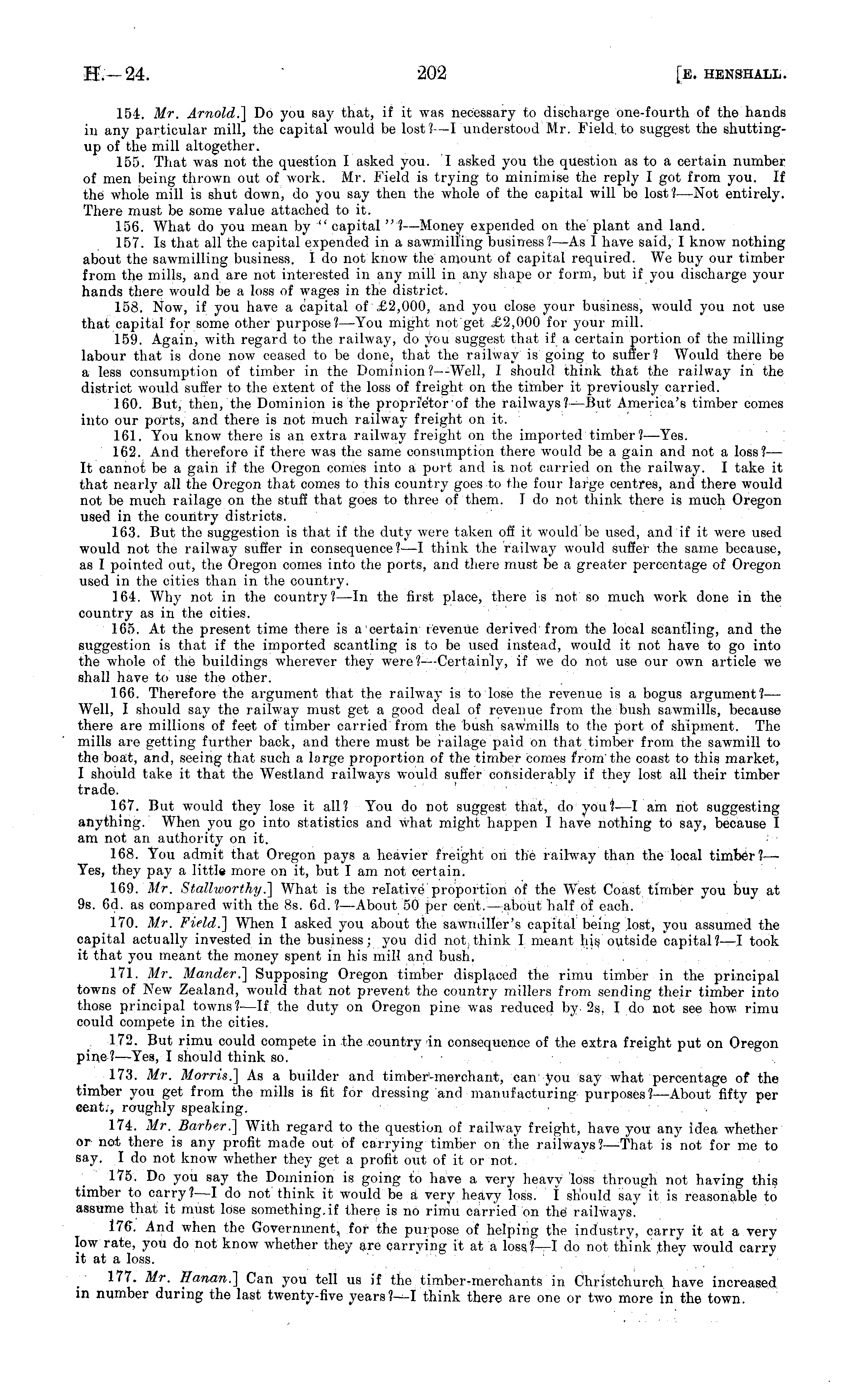 151. Mr. Arnold.] Do you say that, if it was necessary to discharge one-fourth of the hands in any particular mill, the capital would be lost?—I understood Mr. Field, to suggest the shuttingup of the mill altogether. 155. That was not the question I asked you. I asked you the question as to a certain number of men being thrown out of work. Mr. is trying to minimise the reply I got from you. If the whoie mill is shut down, do you say then the whole of the capital will be lost?— Not entirely. There must be some value attached to it. 156. What do you mean by " capital "I —Money expended on the plant and land. 157. Is that all the capital expended in a sawmilling business? —As I have said, I know nothing about the sawmilling business. Ido not know the amount of capital required. We buy our timber from the mills, and are not interested in any mill in any shape or form, but if you discharge your hands there would be a loss of wages in the district. 158. Now, if you have a capital of £2,000, and you close your business, would you not use that capital for some other purpose?— You might not'get £2,000 for your mill. 159. Again, with regard to the railway, do you suggest that if a certain portion of the milling labour that is done now ceased to be done, that the railway is going to suffer? Would there be a less consumption of timber in the Dominion?—-Well, I should think that the railway in the district would suffer to the extent of the loss of freight on the timber it previously carried. 160. But, then, the Dominion is the proprietor of the railways?— But America's timber comes into our ports, and there is not much railway freight on it. 161. You know there is an extra railway freight on the imported timber?— Yes. 162. And therefore if there was the same consumption there would be a gain and not a loss?— It cannot be a gain if the Oregon comes into a port and is not carried on the railway. I take it that nearly all the Oregon that comes to this country goes to the four large centres, and there would not be much railage on the stuff that goes to three of them. Ido not think there is much Oregon used in the country districts. 163. But the suggestion is that if the duty were taken off it would be used, and if it were used would not the railway suffer in consequence?—l think the railway would suffer the same because, as I pointed out, the Oregon comes into the ports, and there must be a greater percentage of Oregon used in the cities than in the country. 164. Why not in the country? —In the first place, there is not so much work done in the country as in the cities. 165. At the present time there is a certain revenue derived from the local scantling, and the suggestion is that if the imported scantling is to be used instead, would it not have to go into the whole of the buildings wherever they were?— Certainly, if we do not use our own article we shall have to use the other. 166. Therefore the argument that the railway is to lose the revenue is a bogus argument?— Well, I should say the railway must get a good deal of revenue from the bush sawmills, because there are millions of feet of timber carried from the bush sawmills to the port of shipment. The mills are getting further back, and there must be railage paid on that timber from the sawmill to the boat, and, seeing that such a large proportion of the timber comes from'the coast to this market, I should take it that the Westland railways would suffer considerably if they lost all their timber trade. 167. But would they lose it all? You do not suggest that, do you? —I am not suggesting anything. When you go into statistics and what might happen I have nothing to say, because I am not an authority on it. 168. You admit that Oregon pays a heavier freight on the railway than the local timber?—■ Yes, they pay a little more on it, but I am not certain. 169. Mr. Stallworthy .] What is the relative proportion of the West Coast timber you buy at 9s. 6d. as compared with the Bs. 6d. ?—About 50 per cent. — : about half of each. 170. Mr. Field.'] When I asked you about the sawmiller's capital being lost, you assumed the capital actually invested in the business; you did not, think I meant his outside capital?—l took it that you meant the money spent in his mill and bush, 171. Mr. Mander.] Supposing Oregon timber displaced the rimu timber in the principal towns of New Zealand, would that not prevent the country millers from sending their timber into those principal towns?—lf the duty on Oregon pine was reduced by. 2s. I do not see how. rimu could compete in the cities. 172. But rimu could compete in the country in consequence of the extra freight put on Oregon pine?— Yes, I should think so. 173. Mr. Morris.] As a builder and timber-merchant, can you say what percentage of the timber you get from the mills is fit for dressing and manufacturing purposes?— About fifty per cent., roughly speaking. 174. Mr. Barber.] With regard to the question of railway freight, have you any idea whether or not there is any profit made out of carrying timber on the railways?—that is not for me to say. I do not know whether they get a profit out of it or not. 175. Do you say the Dominion is going to have a very heavy loss through not having this timber to carry?—l do not think it would be a very heavy loss. I should say it is reasonable to assume that it must lose something, if there is no rimu carried on the railways. 176. And when the Government, for the purpose of helping the industry, carry it at a very low rate, you do not know whether they are carrying it at a loss?—I do not think they would carry it at a loss. 177. Mr. Hanan.] Can you tell us if the timber-merchants in Christchurch have increased in number during the last twenty-five years?—-I think there are one or two more in the town.