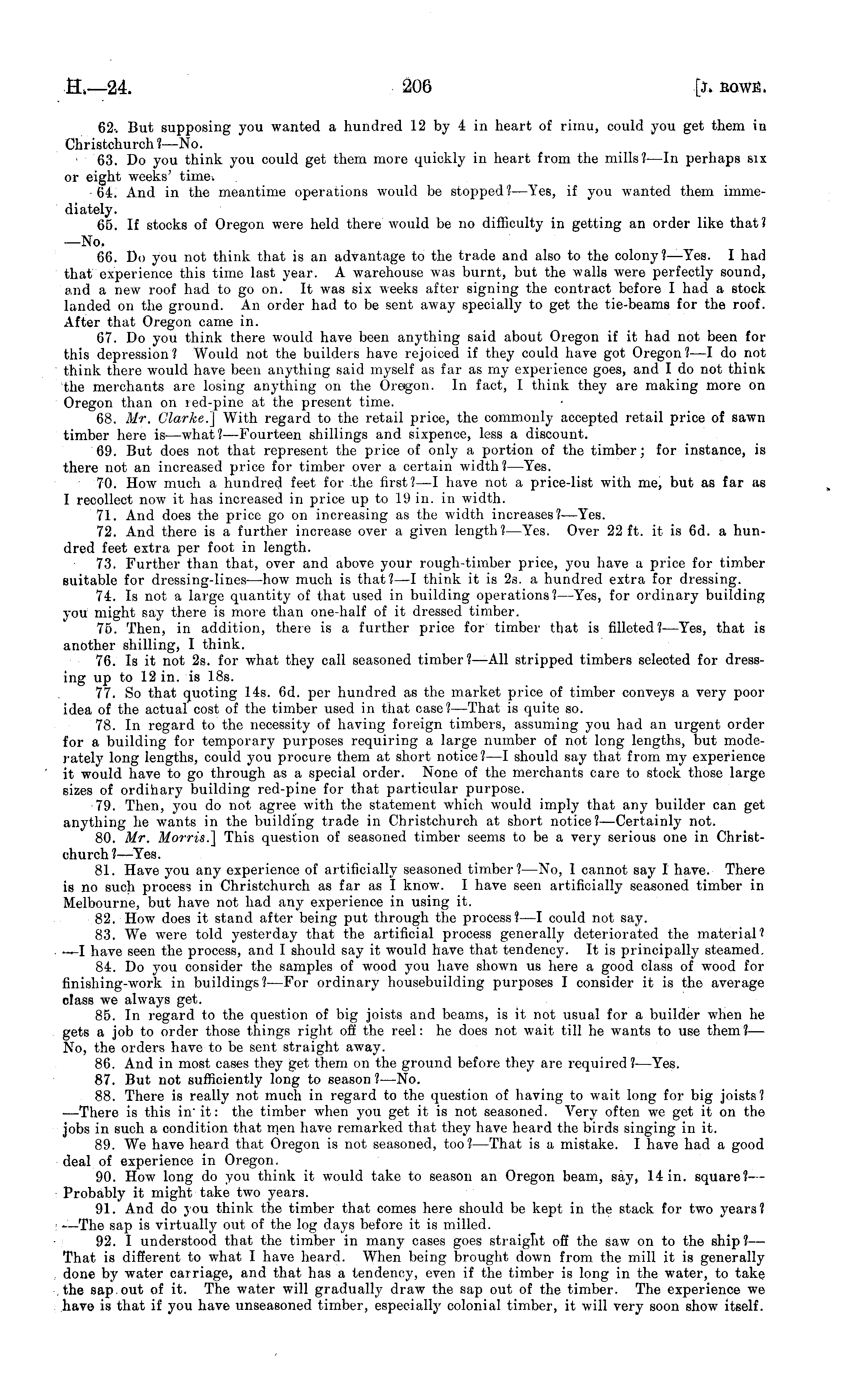 62-. But supposing you wanted a hundred 12 by 4 in heart of rimu, could you get them in Christchurch I —No. 63. Do you think you could get them more quickly in heart from the mills? —In perhaps six or eight weeks' time. 64. And in the meantime operations would be stopped?— Yes, if you wanted them immediately. 65. If stocks of Oregon were held there would be no difficulty in getting an order like that? —No. 66. Do you not think that is an advantage to the trade and also to the colony?— Yes. I had that experience this time last year. A warehouse was burnt, but the walls were perfectly sound, and a new roof had to go on. It was six weeks after signing the contract before I had a stock landed on the ground. An order had to be sent away specially to get the tie-beams for the roof. After that Oregon came in. 67. Do you think there would have been anything said about Oregon if it had not been for this depression? Would not the builders have rejoiced if they could have got Oregon?—l do not think there would have been anything said myself as far as my experience goes, and I do not think the merchants are losing anything on the Oregon. In fact, I think they are making more on Oregon than on red-pine at the present time. 68. Mr. Clarke.] With regard to the retail price, the commonly accepted retail price of sawn timber here is—what? — Fourteen shillings and sixpence, less a discount. 69. But does not that represent the price of only a portion of the timber; for instance, is there not an increased price for timber over a certain width? —Yes. 70. How much a hundred feet for the first? —I have not a price-list with me, but as far as I recollect now it has increased in price up to 19 in. in width. 71. And does the price go on increasing as the width increases? —Yes. 72. And there is a further increase over a given length?— Yes. Over 22 ft. it is 6d. a hundred feet extra per foot in length. 73. Further than that, over and above your rough-timber price, you have a price for timber suitable for dressing-lines—how much is that?—l think it is 2s. a hundred extra for dressing. 74. Is not a large quantity of that used in building operations?— Yes, for ordinary building you might say there is more than one-half of it dressed timber. 75. Then, in addition, there is a further price for timber that is filleted? —Yes, that is another shilling, I think. 76. Is it not 2s. for what they call seasoned timber? —All stripped timbers selected for dressing up to 12 in. is 18s. 77. So that quoting 14s. 6d. per hundred as the market price of timber conveys a very poor idea of the actual cost of the timber used in that case?— That is quite so. 78. In regard to the necessity of having foreign timbers, assuming you had an urgent order for a building for temporary purposes requiring a large number of not long lengths, but moderately long lengths, could you procure them at short notice? —I should say that from my experience it would have to go through as a special order. None of the merchants care to stock those large sizes of ordinary building red-pine for that particular purpose. 79. Then, you do not agree with the statement which would imply that any builder can get anything he wants in the building trade in Christchurch at short notice?— Certainly not. 80. Mr. Morris.] This question of seasoned timber seems to be a very serious one in Christchurch? —Yes. 81. Have you any experience of artificially seasoned timber?—No, 1 cannot say I have. There is no such process in Christchurch as far as I know. I have seen artificially seasoned timber in Melbourne, but have not had any experience in using it. 82. How does it stand after being put through the process?—l could not say. 83. We were told yesterday that the artificial process generally deteriorated the material? —I have seen the process, and I should say it would have that tendency. It is principally steamed. 84. Do you consider the samples of wood you have shown us here a good class of wood for finishing-work in buildings?— For ordinary housebuilding purposes I consider it is the average class we always get. 85. In regard to the question of big joists and beams, is it not usual for a builder when he gets a job to order those things right off the reel: he does not wait till he wants to use them ? — No, the orders have to be sent straight away. 86. And in most cases they get them on the ground before they are required?— Yes. 87. But not sufficiently long to season?— No. 88. There is really not much in regard to the question of having to wait long for big joists? —There is this in' it: the timber when you get it is not seasoned. Very often we get it on the jobs in such a condition that men have remarked that they have heard the birds singing in it. 89. We have heard that Oregon is not seasoned, too?— That is a mistake. I have had a good deal of experience in Oregon. 90. How long do you think it would take to season an Oregon beam, say, 14 in. square? — Probably it might take two years. 91. And do you think the timber that comes here should be kept in the stack for two years? —The sap is virtually out of the log days before it is milled. 92. I understood that the timber in many cases goes straight off the saw on to the ship?— That is different to what I have heard. When being brought down from the mill it is generally done by water carriage, and that has a tendency, even if the timber is long in the water, to take the sap out of it. The water will gradually draw the sap out of the timber. The experience we have is that if you have unseasoned timber, especially colonial timber, it will very soon show itself.