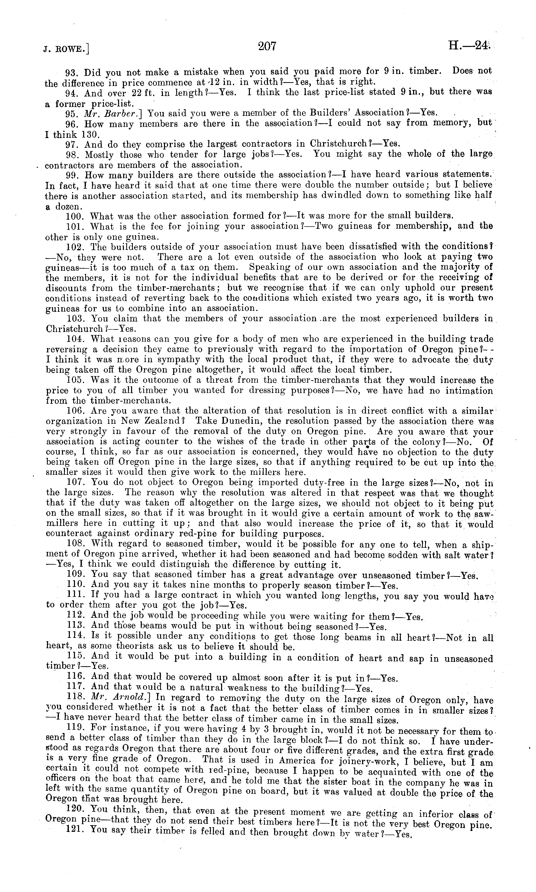 93. Did you not make a mistake when you said you paid more for 9 in. timber. Does not the difference in price commence at'l2 in. in width? —Yes, that is right. 94. And over 22 ft. in length? —Yes. I think the last price-list stated 9 in., but there was a former price-list. 95. Mr, Barber.'] You said you were a member of the Builders' Association? —Yes. 96. How many members are there in the association ?—I could not say from memory, but I think 130. 97. And do they comprise the largest contractors in Christchurch? —Yes. 98. Mostly those who tender for large jobs? —Yes. You might say the whole of the large contractors are members of the association. 99. How many builders are there outside the association? —I have heard various statements. In fact, I have heard it said that at one time there were double the number outside; but I believe there is another association started, and its membership has dwindled down to something like half a dozen. 100. What was the other association formed for?—lt was more for the small builders. 101. What is the fee for joining your association? —Two guineas for membership, and the other is only one guinea. 102. The builders outside of your association must have been dissatisfied with the conditions? —No, they were not. There are a lot even outside of the association who look at paying two guineas—it is too much of a tax on them. Speaking of our own association and the majority of the members, it is not for the individual benefits that are to be derived or for the receiving of discounts from the timber-merchants; but we recognise that if we can only uphold our present conditions instead of reverting back to the conditions which existed two years ago, it is worth two guineas for us to combine into an association. 103. You claim that the members of your association .are the most experienced builders in Christchurch I —Yes. 104. What leasons can you give for a body of men who are experienced in the building trade reversing a decision they came to previously with regard to the importation of Oregon pine?--I think it was more in sympathy with the local product that, if they were to advocate the duty being taken off the Oregon pine altogether, it would affect the local timber. 105. Was it the outcome of a threat from the timber-merchants that they would increase the price to yon of all timber you wanted for dressing purposes ?—No, we have had no intimation from the timber-merchants. 106. Are you aware that the alteration of that resolution is in direct conflict with a similar organization in New Zealand? Take Dunedin, the resolution passed by the association there was very strongly in favour of the removal of the duty on Oregon pine. Are you aware that your association is acting counter to the wishes of the trade in other parts of the colony?— No. Of course, I think, so far as our association is concerned, they would have no objection to the duty being taken off Oregon pine in the large sizes, so that if anything required to be cut up into the smaller sizes it would then give work to the millers here. 107. You do not object to Oregon being imported duty-free in the large sizes?—No, not in the large sizes. The reason why the resolution was altered in that respect was that we thought that if the duty was taken off altogether on the large sizes, we should not object to it being put on the small sizes, so that if it was brought in it would give a certain amount of work to the sawmillers here in cutting it up; and that also would increase the price of it, so that it would counteract against ordinary red-pine for building purposes. 108. With regard to seasoned timber, would it be possible for any one to tell, when a shipment of Oregon pine arrived, whether it had been seasoned and had become sodden with salt water? —Yes, I think we could distinguish the difference by cutting it. 109. You say that seasoned timber has a great advantage over unseasoned timber?— Yes. 110. And you say it takes nine months to properly season timber?— Yes. 111. If you had a large contract in which you wanted long lengths, you say you would have to order them after you got the job?— Yes. 112. And the job would be proceeding while you were waiting for them?— Yes. 113. And those beams would be put in without being seasoned? —Yes. 114. Is it possible under any conditions to get those long beams in all heart?— Not in all heart, as some theorists ask us to believe it should be. 115. And it would be put into a building in a condition of heart and sap in unseasoned timber ?—Yes. 116. And that would be covered up almost soon after it is put in?— Yes. 117. And that would be a natural weakness to the building?— Yes. 118. Mr. Arnold.] In regard to removing the duty on the large sizes of Oregon only, have you considered whether it is not a fact that the better class of timber comes in in smaller sizes? —I have never heard that the better class of timber came in in the small sizes. 119. For instance, if you were having 4 by 3 brought in, would it not be necessary for them to send a better class of timber than they do in the large block ?—I do not think so. I have understood as regards Oregon that there are about four or five different grades, and the extra first grade is a very fine grade of Oregon. That is used in America for joinery-work, I believe, but I am certain it could not compete with red-pine, because I happen to be acquainted with one of the orhcers on the boat that came here-, and he told me that the sister boat in the company he was in left with the same quantity of Oregon pine on board, but it was valued at double the price of the Oregon that was brought here. 120. You think then, that even at the present moment we are getting an inferior class of Oregon pine-that they do not send their best timbers here?-It is not the very best Oregon pine till. You say their timber is felled and then brought down by water ?—Yes.
