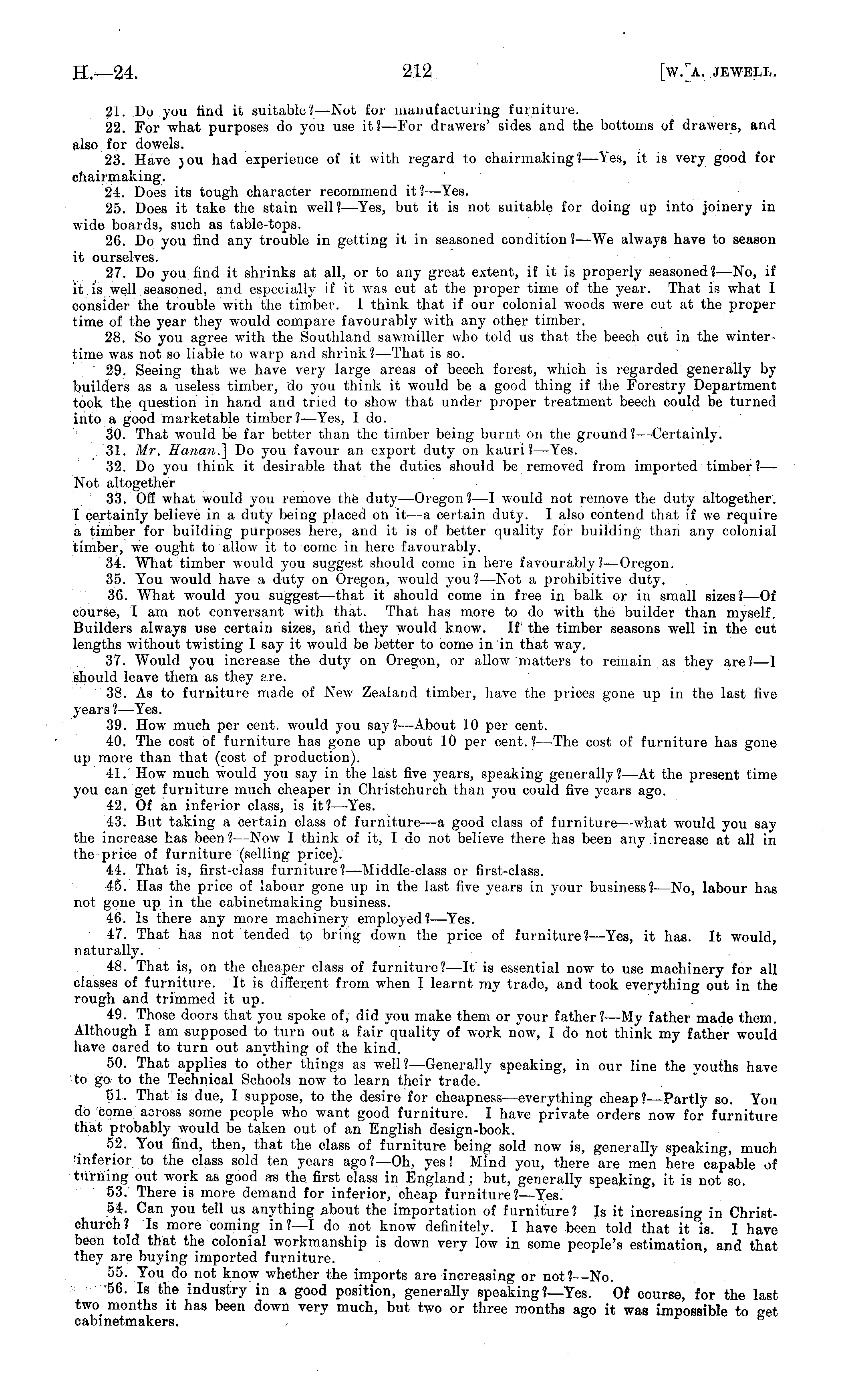 21. Do you lind it suitable if —Not for manufacturing furniture. 22. For what purposes do you use it? —For drawers' sides and the bottoms of drawers, and also for dowels. 23. Have you had experience of it with regard to chairmaking?—Yes, it is very good for chairmaking. 24. Does its tough character recommend it < —Yes. 25. Does it take the stain well?— Yes, but it is not suitable for doing up into joinery in wide boards, such as table-tops. 26. Do you find any trouble in getting it in seasoned condition? —We always have to season it ourselves. 27. Do you find it shrinks at all, or to any great extent, if it is properly seasoned? —No, if it is well seasoned, and especially if it was cut at the proper time of the year. That is what I consider the trouble with the timber. I think that if our colonial woods were cut at the proper time of the year they would compare favourably with any other timber. 28. So you agree with the Southland sawmiller who told us that the beech cut in the wintertime was not so liable to warp and shrink? —That is so. 29. Seeing that we have very large areas of beech forest, which is regarded generally bybuilders as a useless timber, do you think it would be a good thing if the Forestry Department took the question in hand and tried to show that under proper treatment beech could be turned into a good marketable timber? —Yes, I do. 30. That would be far better than the timber being burnt on the ground?—-Certainly. 31. Mr. Hanan.~\ Do you favour an export duty on kauri?— Yes. 32. Do you think it desirable that the duties should be removed from imported timber?— Not altogether ' 33. Off what would you remove the duty—Oregon?—l would not remove the duty altogether. I certainly believe in a duty being placed on it—a certain duty. I also contend that if we require a timber for building purposes here, and it is of better quality for building than any colonial timber, we ought to allow it to come in here favourably. 34. What timber would you suggest should come in here favourably?— Oregon. 35. You would have a duty on Oregon, would you?— Not a prohibitive duty. 36. What would you suggest —that it should come in free in balk or in small sizes?—Of course, I am not conversant with that. That has more to do with the builder than myself. Builders always use certain sizes, and they would know. If the timber seasons well in the cut lengths without twisting I say it would be better to come in in that way. 37. Would you increase the duty on Oregon, or allow matters to remain as they are?—l should leave them as they ere. 38. As to furniture made of New Zealand timber, have the prices gone up in the last five years?— Yes. 39. How much per cent, would you say?— About 10 per cent. 40. The cost of furniture has gone up about 10 per cent.?— The cost of furniture has gone up more than that (cost of production). 41. How much would you say in the last five years, speaking generally ?—At the present time you can get furniture much cheaper in Christchurch than you could five years ago. 42. Of an inferior class, is it?— Yes. 43. But taking a certain class of furniture—a good class of furniture —what would you say the increase has been ?—Now I think of it, I do not believe there has been any increase at all in the price of furniture (selling price). 44. That is, first-class furniture? —Middle-class or first-class. 45. Has the price of labour gone up in the last five years in your business?—No, labour has not gone up in the cabinetmaking business. 46. Is there any more machinery employed?— Yes. 47. That has not tended to bring down the price of furniture?— Yes, it has. It would, naturally. 48. That is, on the cheaper class of furniture?—lt is essential now to use machinery for all classes of furniture. It is different from when I learnt my trade, and took everything out in the rough and trimmed it up. 49. Those doors that you spoke of, did you make them or your father? —My father made them. Although I am supposed to turn out a fair quality of work now, I do not think my father would have cared to turn out anything of the kind. 50. That applies to other things as well? —Generally speaking, in our line the youths have to go to the Technical Schools now to learn their trade. 51. That is due, I suppose, to the desire for cheapness—everything cheap?— Partly so. You do come across some people who want good furniture. I have private orders now for furniture that probably would be taken out of an English design-book. 52. You find, then, that the class of furniture being sold now is, generally speaking, much 'inferior to the class sold ten years ago?—Oh, yes! Mind you, there are men here capable of turning out work as good as the first class in England; but, generally speaking, it is not so. 53. There is more demand for inferior, cheap furniture?— Yes. 54. Can you tell us anything about the importation of furniture ? Is it increasing in Christchurch? Is more coming in?—l do not know definitely. I have been told that it is. I have been told that the colonial workmanship is down very low in some people's estimation, and that they are buying imported furniture. 55. You do not know whether the imports are increasing or not?— No. 56. Is the industry in a good position, generally speaking?— Yes. Of course, for the last two_ months it has been down very much, but two or three months ago it was impossible to get cabinetmakers. -