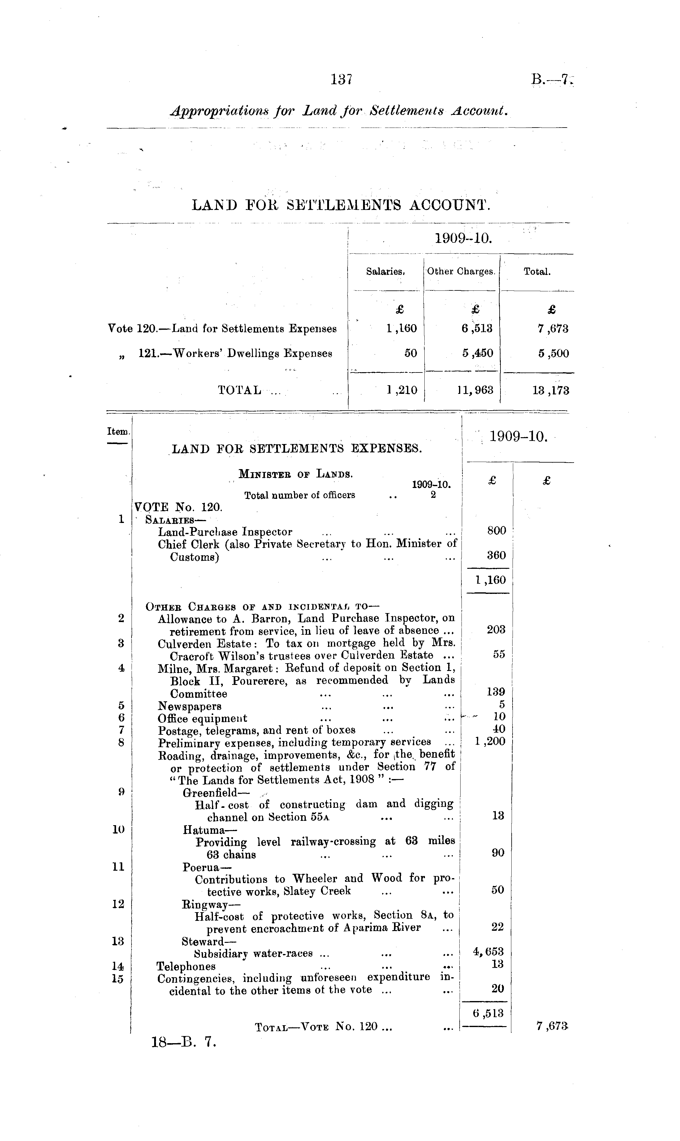 1909-10. Salaries, Other Charges. Total. £ £ £ ote 120.—Land for Settlements Expenses 1,160 6,513 7,673 „ 121.—Workers' Dwellings Expenses 50 5,450 5 ,500 TOTAL ... 1 ,210 11,963 13 ,173 [tern. 1909-10. LAND FOR SETTLEMENTS EXPENSES. 2 3 4 Ministee of Lands. „ ,, 1909-10. * * Total number of officers .. 2 VOTE No. 120. Salabies — Land-Purchase Inspector ... ... ... j 800 Chief Clerk (also Private Secretary to Hon. Minister of Customs) ... ... ... 360 1,160 Othee Chaeges of and incidental to — Allowance to A. Barron, Land Purchase Inspector, on retirement from service, in lieu of leave of absence ... > 203 Culverden Estate: To tax on mortgage held by Mrs. Cracroft Wilson's trustees over Culverden Estate ... 55 Milne, Mrs. Margaret: Refund of deposit on Section 1, Block II, Pourerere, as recommended by Lands Committee ... ... ••• 139 Newspapers ... ... ••• 5 Office equipment ... ... ••• 10 Postage, telegrams, and rent of boxes ... ... 40 Preliminary expenses, including temporary services ... 1 ,200 Roading, drainage, improvements, &c, for ,the. benefit | or protection of settlements under Section 77 of " The Lands for Settlements Act, 1908 " :— Greenfield — Half-cost of constructing dam and digging channel on Section 55a ... ... 13 Hatuma — Providing level railway-crossing at 63 miles 63 chains ... ... ••• 90 5 6 7 8 9 10 11 Poerua — Contributions to Wheeler and Wood for protective works, Slatey Creek ... ... | 50 12 13 Ringway — Half-cost of protective works, Section 8a, to prevent encroachment of Aparima River ... 22 Steward —- Subsidiary water-races ... ... ... 4,653 Telephones ... ••• ••■ j 13 Contingencies, including unforeseen expenditure incidental to the other items of the vote ... ... 20 14 15 6,513 Total—Vote No. 120 ... ... — 7 ,( 7,673