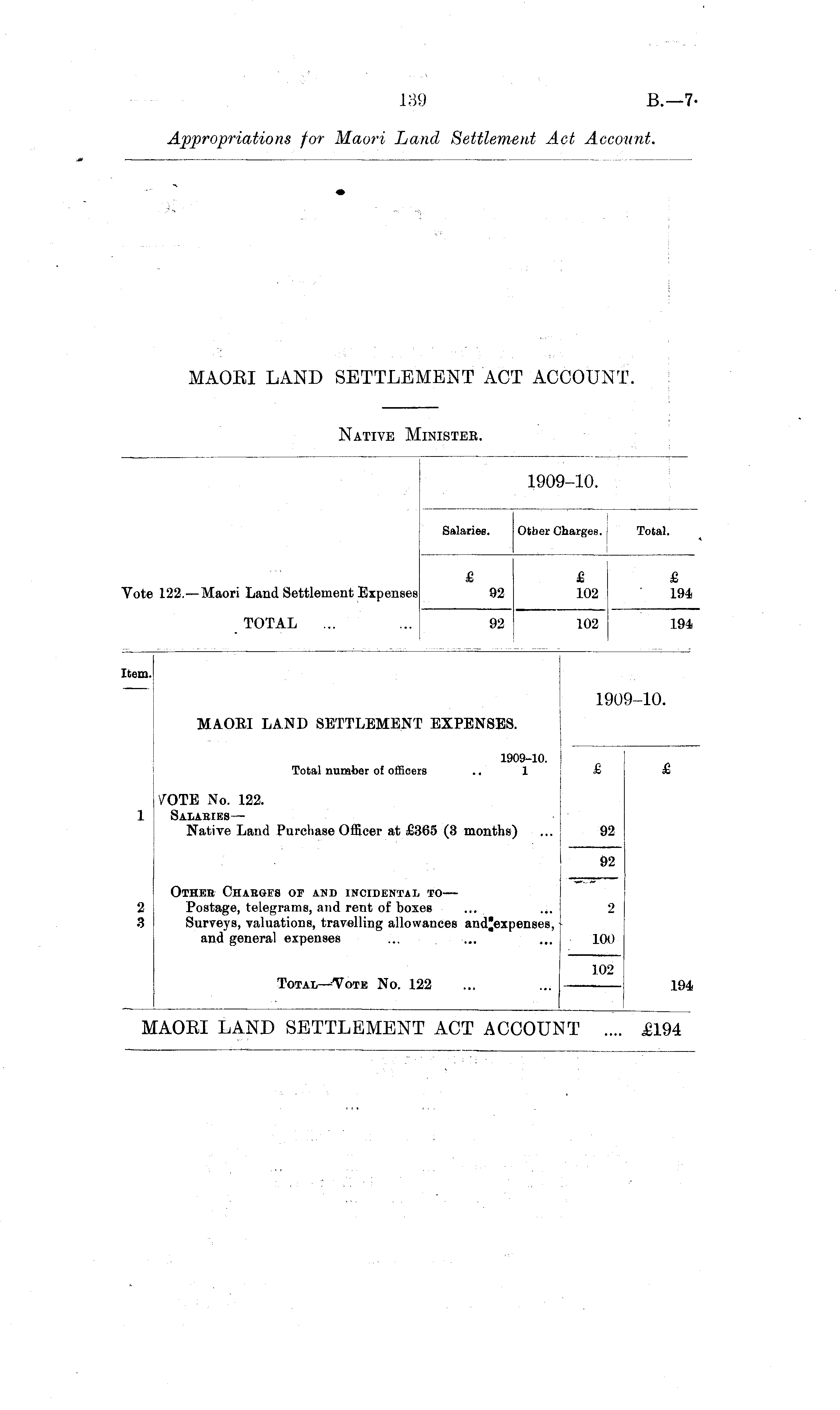 Native INISTEE. 1909-10. Salaries. Other Charges. Total. A ote 122.—Maori Land Settlement Expenses £ £ 102 £ 194 92 TOTAL 92 102 194 Item. 1909-10. MAORI LAND SETTLEMENT EXPENSES. 1909-10. Total number of officers .. 1 £ VOTE No. 122. Salabies— Native Land Purchase Officer at £365 (3 months) 92 92 2 3 Otheb Chaeges of and incidental to — Postage, telegrams, and rent of boxes Surveys, valuations, travelling allowances and'expenses, and general expenses 2 100 Total—Vote No. 122 102 194 AORI LAND SETTLEMENT ACT ACCOUNT 194