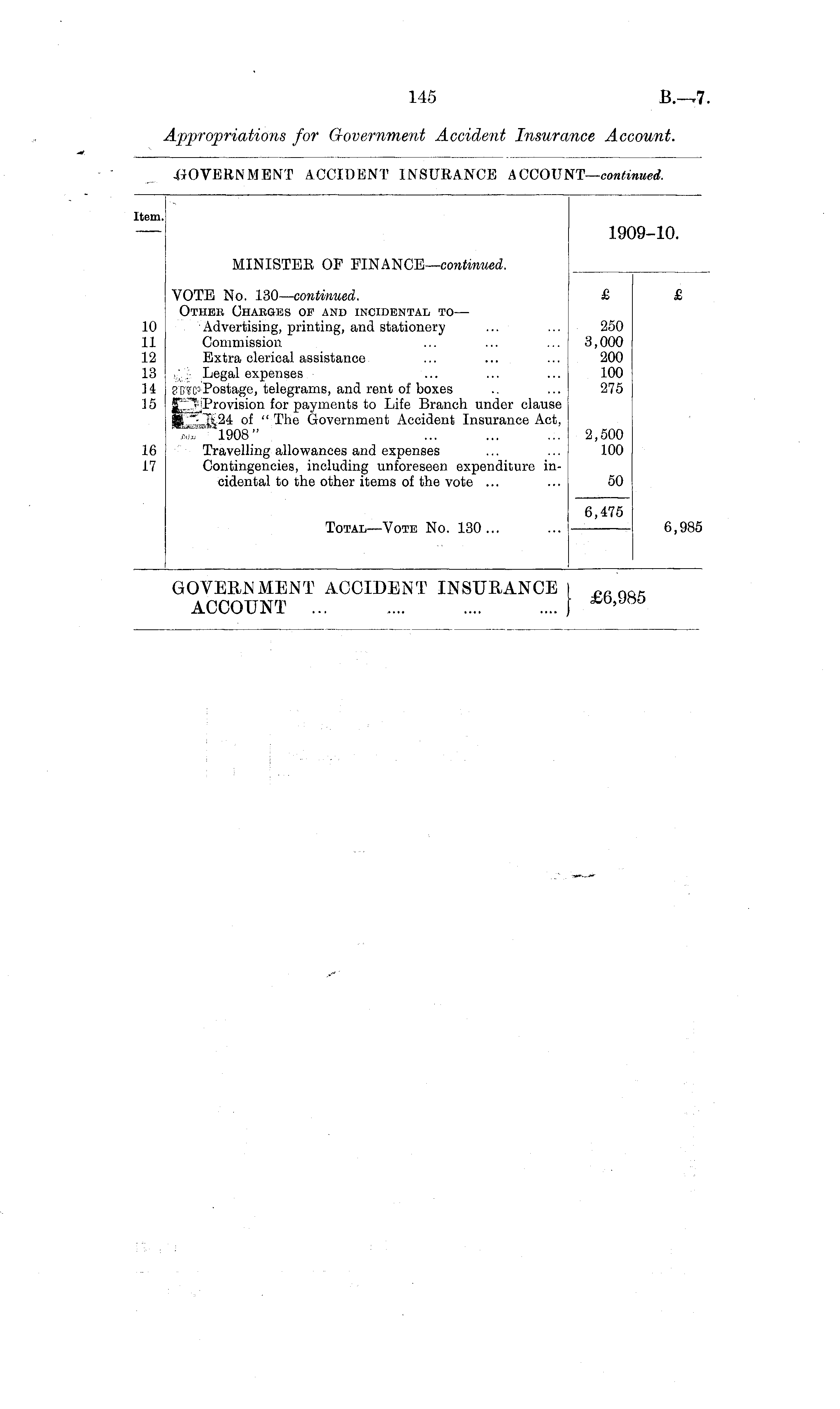 -GOVERNMENT ACCIDENT INSURANCE ACCOU T— continued. Item. 19 19-10. MINISTER OF FINANCE— continued. 10 11 12 13 14 15 VOTE No. 130— continued. Other Chaeges of and incidental to — Advertising, printing, and stationery Commission Extra clerical assistance I,;.]- Legal expenses 2GTC 3 Postage, telegrams, and rent of boxes jj£2JProvision for payments to Life Branch under clause !||"*-Ti,24 of "The Government Accident Insurance Act, .o. 1908" Travelling allowances and expenses Contingencies, including unforeseen expenditure incidental to the other items of the vote ... £ 250 3,000 200 100 275 2,500 100 16 17 50 Total—Vote No. 130... 6,475 6,98; GOVERNMENT ACCIDENT INSURANCE ACCOUNT ... £6,9