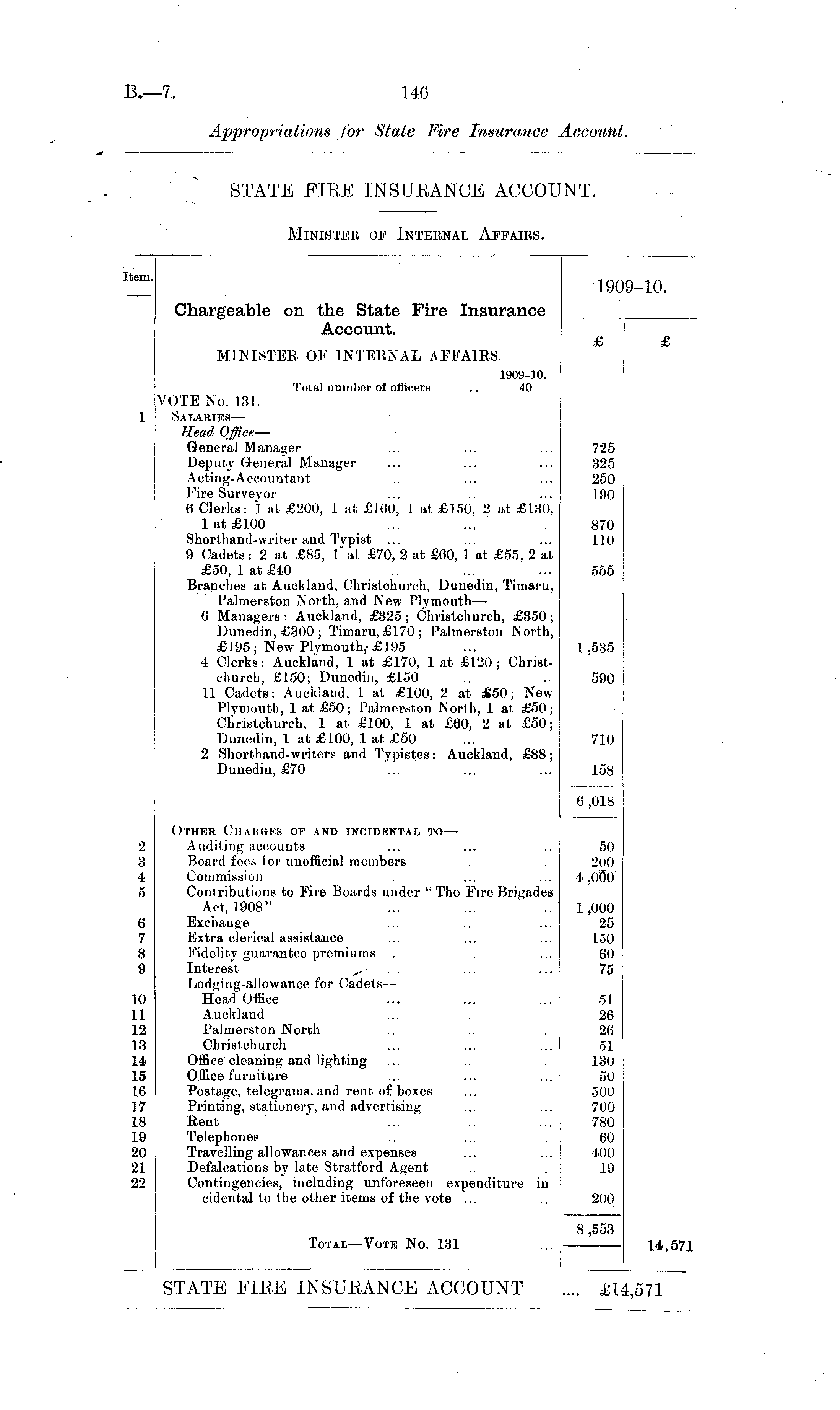 INISTER OP NTBENAL .FFAIRS. Item. 1909-10. Chargeable on the State Fire Insurance Account. MINISTER OF INTERNAL AFFAIRS. 1909-10. Total number of officers .. 40 VOTE No. 131. Salabies— Head Office — General Manager ... ... ... 725 Deputy General Manager ... ... ... 325 Acting-Accountant ... ... ... 250 Fire Survevor ... ... ... 190 6 Clerks: 1 at £200, 1 at £160, 1 at £150, 2 at £130, 1 at £100 ... ... ... 870 Shorthand-writer and Typist ... ... ... Ho 9 Cadets: 2 at £85, 1 at £70, 2 at £60, 1 at £55, 2 at £50, 1 at £40 ... ... ... 555 Branches at Auckland, Christchureh, Dunedin, Timaru, Palmerston North, and New Plymouth—• 6 Managers: Auckland, £325; Christchureh, £350; Dunedin, £300 ; Timaru, £170 ; Palmerston North, £195; New Plvmouth,-£195 ... L ,535 4 Clerks: Auckland, 1 at £170, 1 at £120; Christchurch, £150; Dunedin, £150 ... 590 11 Cadets: Auckland, 1 at £100, 2 at £50; New Plymouth, 1 at £50; Palmerston North, 1 at £50; Christchureh, 1 at £100, 1 at £60, 2 at £50; Dunedin, 1 at £100, 1 at £50 ... 710 2 Shorthand-writers and Typistes: Auckland, £88; Dunedin, £70 "... ... ... 158 725 325 250 190 870 110 555 6,018 2 3 4 5 6 7 8 9 10 11 12 13 14 15 16 17 18 19 20 21 22 Othee Charges op and incidental to — Auditing accounts ... ... ... 50 Board fee.s for unofficial members ... ... 200 Commission ... ... 4,000 Contributions to Fire Boards under " The Fire Brigades Act, 1908" ... ... ... 1,000 Exchange .. ... ... 25 Extra clerical assistance ... ... ... 150 Fidelity guarantee premiums . .. ... 60 Interest - ... ... ... 75 Lodging-allowance for Cadets — Head Office ... ... ... 51 Auckland ... .. 26 Palmerston North ... ... . 26 Christchureh ... ... ... 51 Office cleaning and lighting .. ... 130 Office furniture ... ... ... 50 Postage, telegrams, and rent of boxes ... 500 Printing, stationery, and advertising ... ... 700 Rent ... ... ... 780 Telephones ... ... 60 Travelling allowances and expenses ... ... 400 Defalcations by late Stratford Agent ., .. 19 Contingencies, including unforeseen expenditure incidental to the other items of the vote ... .. 200 8,553 Total—Vote No. 131 ... 14,57 STATE FIRE INSURANCE ACCOUNT £1 ,571