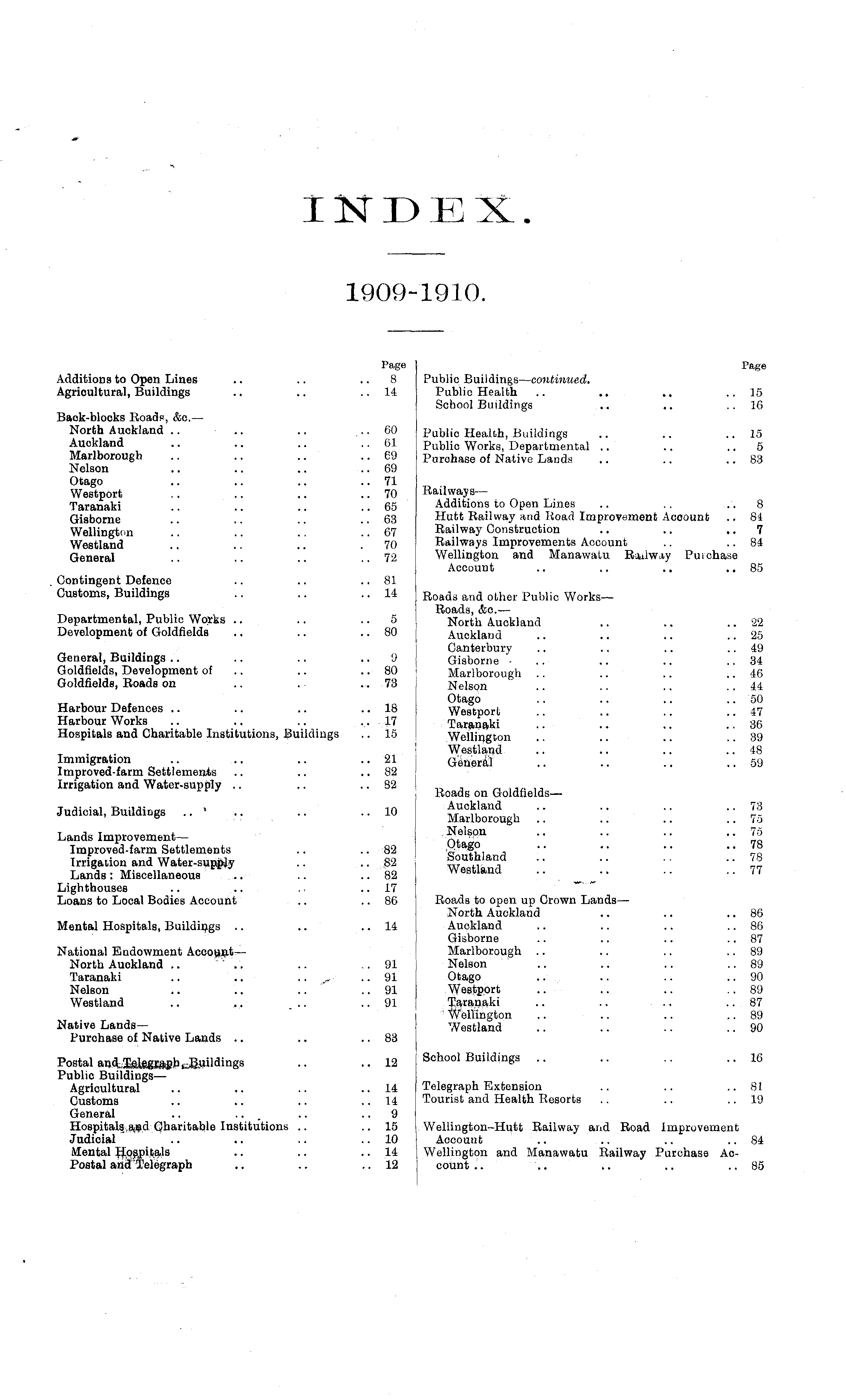 Page Public Buildings— continued. Public Health .. .. .. ..15 School Buildings .. .. 16 Publio Health, Buildings .. .. ..15 Public Works, Departmental .. .. .. 5 Purchase of Native Lands .. .. .. 83 Railways— Additions to Open Lines .. .. .. 8 Hutt Railway and Road Improvement Acoount .. 84 Railway Construction .. .. ..7 Railways Improvements Account .. .. 84 Wellington and Manawalu Railway Purchase Account .. .. .. .. 85 Roads and other Public Works — Roads, &c. — North Auckland .. .. .. 22 Auckland .. .. .. .. 25 Canterbury .. .. .. .. 49 Gisborne ... .. .. .. 34 Marlborough .. .. .. 46 Nelson .. .. .. .. 44 Otago .. .. .. .. '50 Westport .. .. .. .. 47 Taranaki .. .. .. 36 Wellington .. .. .. .. 39 Westland .. .. .. ..48 General .. .. .. .. 59 Roads on Goldfields— Auckland .. .. .. .. 73 Marlborough .. .. .. .. 75 Nelson .. .. .. .. 75 Otago .. .. .. .. 78 Southland .. .. .. .. 78 Westland .. .. .. .. 77 Roads to open up Crown Lands — North Auckland .. .. .. 86 Auckland .. .. .. .. 86 Gisborne .. .. .. .. 87 Marlborough .. .. .. .. 89 Nelson .. .. .. ..89 Otago .. .. .. ..90 Westport .. .. .. ..89 Taranaki .. .. .. .. 87 Wellington .. .. .. .. 89 Westland .. .. .. .. 90 School Buildings .. .. .. .. 16 Telegraph Extension .. .. ..81 Tourist and Health Resorts .. .. .. 19 Wellington-Hutt Railway and Road Improvement Account .. .. .. .. 84 Wellington and Manawatu Railway Purchase Account .. .. .. .. .. 85