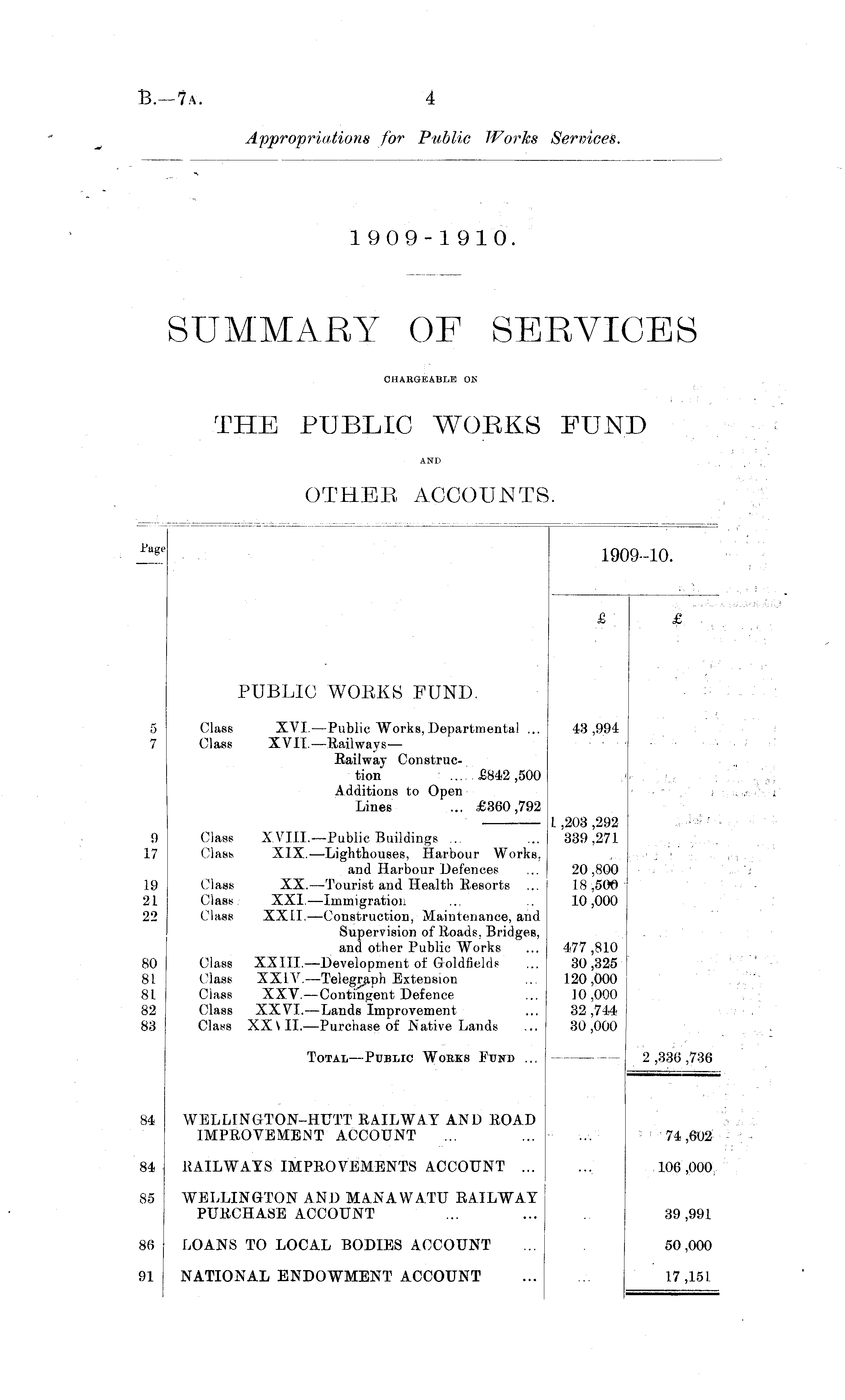 Page 19i '9-10. £ PUBLIC WORKS FUND. 5 7 Class XVI.—Public Works,Departmental ... Class XVII.—Railways— Railway Construction ... £842,500 Additions to Open Lines ... £360,792 43,994 9 17 Class X.VIIL—Public Buildings ... Class XIX.—Lighthouses, Harbour Works, and Harbour Defences Class XX. —Tourist and Health Resorts Class XXI.—Immigration Class XXII. —Construction, Maintenance, and. Supervision of Roads, Bridges, and other Public Works Class XXIII.—Development of Goldfields (.'lass XXIV. —Telegraph Extension Class XXV. —Contingent Defence Class XXVI. —Lands Improvement Class XXVII.—Purchase of Native Lands 1 ,203 ,292 339,271 19 21 22 20 ,800 18,500 10 ,000 80 81 81 82 83 477,810 30 ,325 120 ,000 10,000 32 ,744 30 ,000 Total —Public Wobks Fund ... 2 ,336 ,736 84 WELLINGTON-HUTT RAILWAY AND ROAD IMPROVEMENT ACCOUNT -- 74,602 84 RAILWAYS IMPROVEMENTS ACCOUNT ... 106 ,000 ; 85 WELLINGTON AND MANAWATU RAILWAY PURCHASE ACCOUNT 39 ,991 80 LOANS TO LOCAL BODIES ACCOUNT 50 ,000 91 NATIONAL ENDOWMENT ACCOUNT 17,151