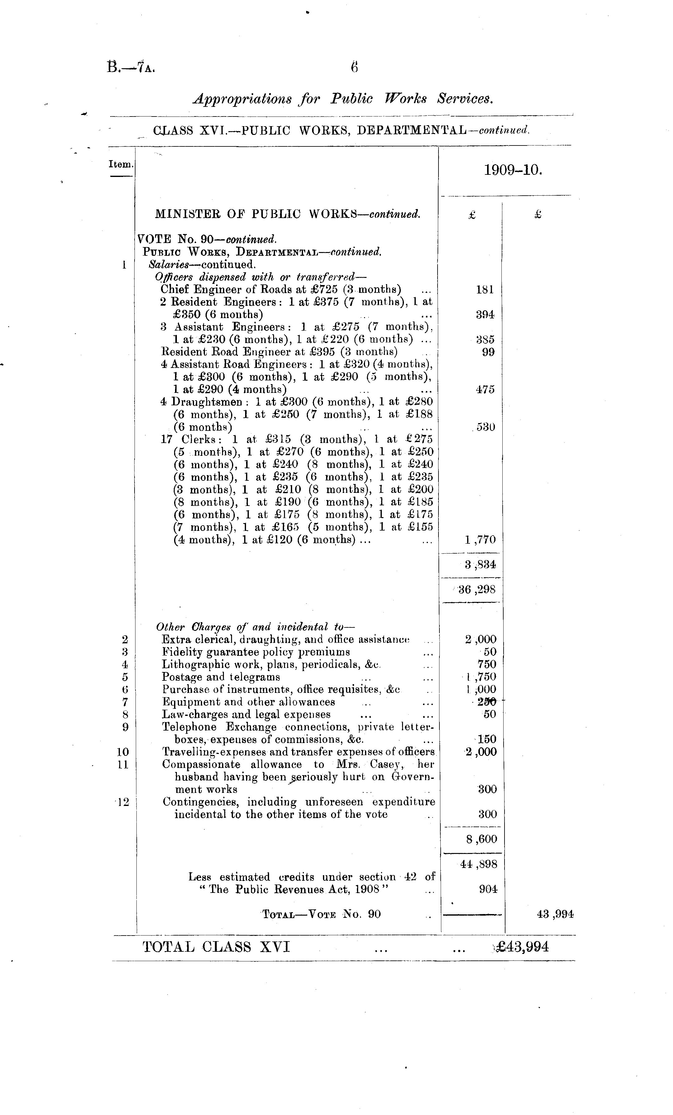 Item. 1909-10. MINISTER OF PUBLIC WORKS— continued. £ £ VOTE No. 90— continued. Public Works, Departmental— continued. Salaries —continued. Officers dispensed with or transferred — Chief Engineer of Roads at £725 (3 months) 2 Resident Engineers: 1 at £375 (7 months), 1 at £350 (6 months) 3 Assistant Engineers: 1 at £275 (7 months), 1 at £230 (6 months), 1 at £220 (6 months) ... Resident Road Engineer at £395 (3 months) 4 Assistant Road Engineers : 1 at £320 (4 mouths), 1 at £300 (6 months), 1 at £290 (5 months), 1 at £290 (4 months) 4 Draughtsmen : 1 at £300 (6 months), 1 at £280 (6 months), 1 at £250 (7 months), 1 at £188 (6 months) 17 Clerks: 1 at £315 (3 months), 1 at £275 (5 months), 1 at £270 (6 months), 1 at £250 (6 months), 1 at £240 (8 months), 1 at £240 (6 months), 1 at £235 (6 months), 1 at £235 (3 months), 1 at £210 (8 months), 1 at £200 (8 months), 1 at £190 (6 months), 1 at £185 (6 months), 1 at £175 (8 months), 1 at £175 (7 months), 1 at £165 (5 months), 1 at £155 (4 mouths), 1 at £120 (6 months) ... 181 394 385 99 475 530 1 ,770 3 ,834 36 ,298 2 3 4 5 6 7 8 9 Other Charges of and incidental to — Extra clerical, draughting, and office assistance Fidelity guarantee policy premiums Lithographic work, plans, periodicals, &c. Postage and telegrams Purchase of instruments, office requisites, &c. Equipment and other allowances Law-charges and legal expenses Telephone Exchange connections, private letterboxes, expenses of commissions, &c. Travelling-expenses and transfer expenses of officers Compassionate allowance to Mrs. Casey, her husband having been hurt on Government works Contingencies, including unforeseen expenditure incidental to the other items of the vote 2,000 50 750 1 ,750 1 ,000 250 50 150 2,000 10 il 300 12 300 8,600 Less estimated credits under section 42 of " The Public Revenues Act, 1908 " 44 ,898 904 Total —Vote No. 90 43 ,994 TOTAL CLASS XVI 143,994