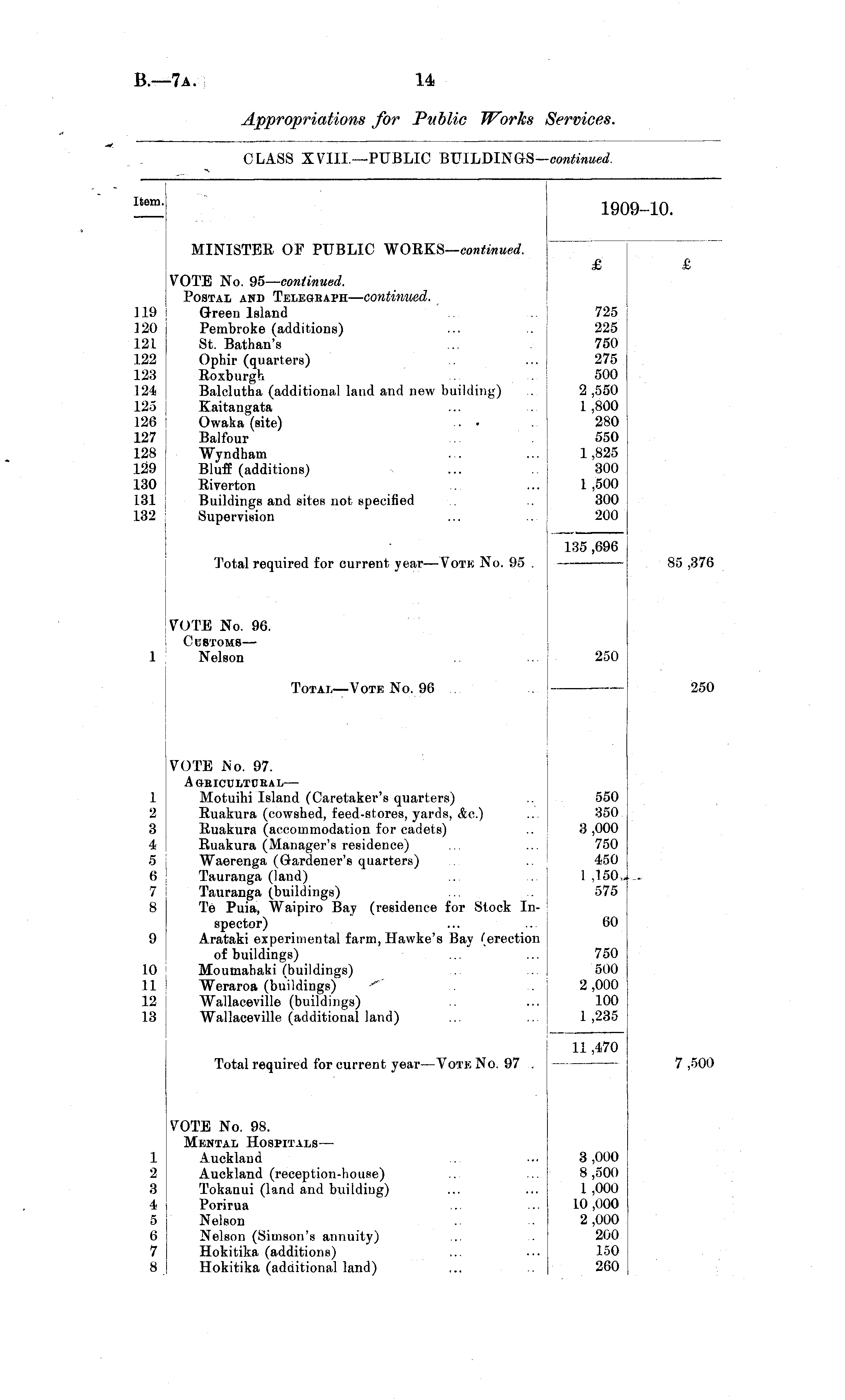 Item. 190 19-10. MINISTER OF PUBLIC WORKS— continued. 119 120 121 122 123 124 125 126 127 128 129 130 131 132 VOTE No. 95— continued. Postal and Telegbaph— continued. Green Island Pembroke (additions) St. Bathan's Ophir (quarters) Roxburgh Balclutha (additional land and new building) Kaitangata Owaka (site) . • Balfour Wyndham Bluff (additions) Riverton Buildings and sites not specified Supervision £ 725 225 750 275 500 2 ,550 1,800 280 550 1,825 300 1,500 300 200 £ 85 ,376 135 ,696 Total required for current year—Vote No. 95 . VOTE No. 96. Customs— Nelson 250 250 Total—Vote No. 96 1 2 3 4 5 6 7 8 VOTE No. 97. A geicultubal— Motuihi Island (Caretaker's quarters) Ruakura (cowshed, feed-stores, yards, Ac.) Ruakura (accommodation for cadets) Ruakura (Manager's residence) Waerenga (Gardener's quarters) Tauranga (land) Tauranga (buildings) Te Puia, Waipiro Bay (residence for Stock Inspector) Arataki experimental farm, Hawke's Bay (erection of buildings) Moumahaki (buildings) Weraroa (buildings) Wallaceville (buildings) Wallaceville (additional land) 550 350 3,000 750 450 1 ,150.. 575 60 9 750 500 2,000 100 1 ,235 10 11 12 13 7 ,500 Total required for current year —Vote No. 97 . 11,470 1 2 3 4 5 6 7 8 VOTE No. 98. Mental Hospitals— Auckland Auckland (reception-house) ... Tokanui (land and building) Porirua Nelson Nelson (Simson's annuity) Hokitika (additions) Hokitika (additional land) 3,000 8 ,500 1,000 10 ,000 2,000 200 150 260