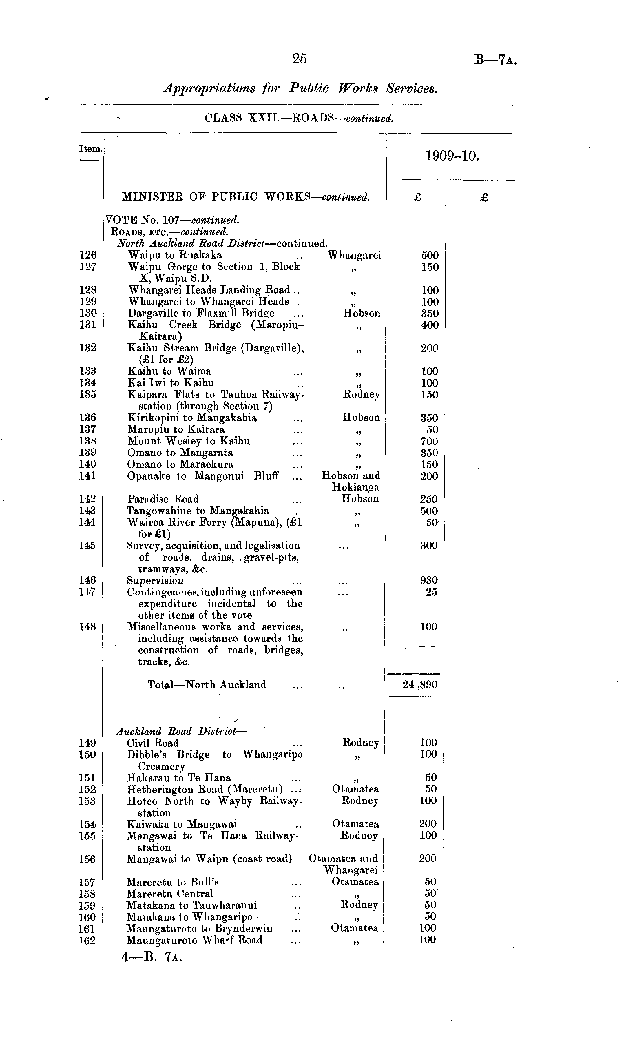 Item. 19 '9-10. MINISTER OF PUBLIC WORKS— continued. VOTE No. 107— continued. Roads, etc. — continued. North Auckland Road District —continued. Waipu to Ruakaka ... Whangarei Waipu Gorge to Section 1, Block „ X, Waipu S.D. Whangarei Heads Landing Road ... „ Whangarei to Whangarei Heads ... „ Dargaville to Flaxmill Bridge ... Hobson Kaihu Creek Bridge (Maropiu- „ Kairara) Kaihu Stream Bridge (Dargaville), „ (£1 for £2) Kaihu to Waima ... „ Kai Iwi to Kaihu ... „ Kaipara Flats to Tauhoa Railway- Rodney station (through Section 7) Kirikopini to Mangakahia ... Hobson Maropiu to Kairara ... „ Mount Wesley to Kaihu ... „ Omano to Mangarata ... „ Omano to Maraekura ... „ Opanake to Mangonui Bluff ... Hobson and Hokianga Paradise Road ... Hobson Tangowahine to Mangakahia .. ,, Wairoa River Ferry (Mapuna), (£1 „ for £1) Survey, acquisition, and legalisation of roads, drains, gravel-pits, tramways, Ac. Supervision Contingencies, including unforeseen expenditure incidental to the other items of the vote Miscellaneous works and services, including assistance towards the construction of roads, bridges, tracks, Ac. £ 126 127 500 150 128 129 130 131 100 100 350 400 132 200 133 134 135 100 100 150 136 137 138 139 140 141 350 50 700 350 150 200 142 143 144 250 500 50 145 300 146 147 930 25 148 100 Total —North Auckland 24 ,890 149 150 151 152 153 154 155 Auckland Road District — Civil Road ... Rodney Dibble's Bridge to Whangaripo „ Creamery Hakarau to Te Hana ... „ Hetherington Road (Mareretu) ... Otamatea Hoteo North to Wayby Railway- Rodney station Kaiwaka to Mangawai .. Otamatea Mangawai to Te Hana Railway- Rodney station Mangawai to Waipu (coast road) Otamatea and Whangarei Mareretu to Bull's ... Otamatea Mareretu Central ... „ Matakana to Tauwharanui ... Rodney Matakana to Whangaripo ... „ Maungaturoto to Brynderwin ... Otamatea Maungaturoto Wharf Road ... ,, 100 100 50 50 100 200 100 156 200 157 158 159 160 161 162 50 50 50 50 100 100