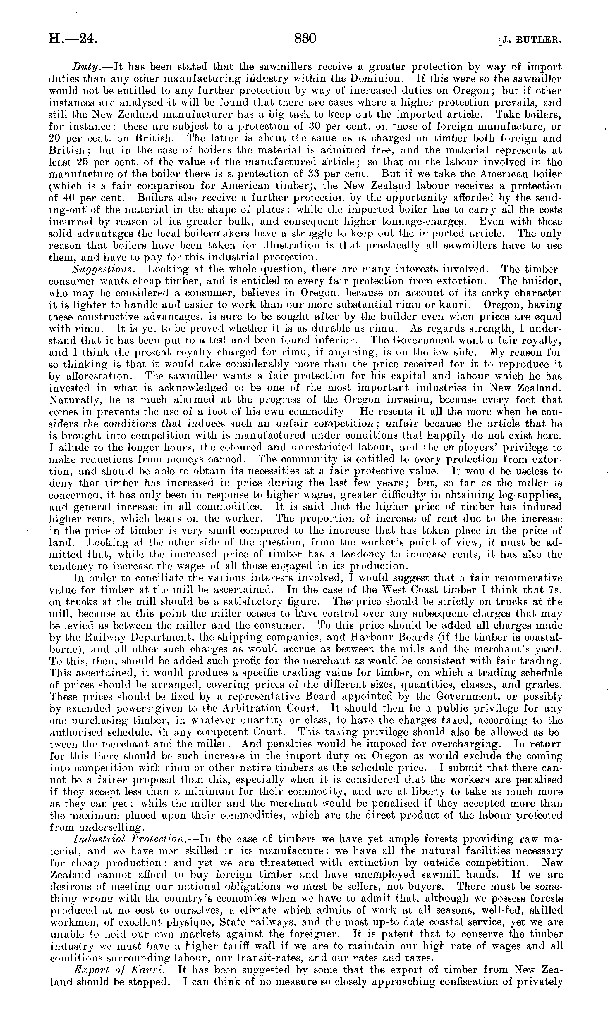 Duty. —lt has been stated that the sawinillers receive a greater protection by way of import duties than any other manufacturing industry within the Dominion. If this were so the sawmiller would not be entitled to any further protection by way of increased duties on Oregon; but if other instances are analysed it will bo found that there are cases where a higher protection prevails, and still the New Zealand manufacturer has a big task to keep out the imported article. Take boilers, for instance : these are subject to a protection of 30 per cent, on those of foreign manufacture, or 20 per cent, on British. The latter is about the same as is charged on timber both foreign and British; but in the case of boilers the material is admitted free, and the material represents at least 25 per cent, of the value of the manufactured article; so that on the labour involved in the manufacture of the boiler there is a protection of 33 per cent. But if we take the American boiler (which is a fair comparison for American timber), the New Zealand labour receives a protection of 40 per cent. Boilers also receive a further protection by the opportunity afforded by the send-ing-out of the material in the shape of plates; while the imported boiler has to carry all the costs incurred by reason of its greater bulk, and consequent higher tonnage-charges. Even with these solid advantages the local boilermakers have a struggle to keep out the imported article. The only reason that boilers have been taken for illustration is that practically all sawmillers have to use them, and have to pay for this industrial protection. Suggestions. —Looking at the whole question, there are many interests involved. The timberconsumer wants cheap timber, and is entitled to every fair protection from extortion. The builder, who may be considered a consumer, believes in Oregon, because on account of its corky character it is lighter to handle and easier to work than our more substantial rimu or kauri. Oregon, having these constructive advantages, is sure to be sought after by the builder even when prices are equal with rimu. It is yet to be proved whether it is as durable as rimu. As regards strength, I understand that it has been put to a test and been found inferior. The Government want a fair royalty, and I think the present royalty charged for rimu, if anything, is on the low side. My reason for so thinking is that it would take considerably more than the price received for it to reproduce it by afforestation. The sawmiller wants a fair protection for his capital and labour which he has invested in what is acknowledged to be one of the most important industries in New Zealand. Naturally, he is much alarmed at the progress of the Oregon invasion, because every foot that comes in prevents the use of a foot of his own commodity. He resents it all the more when he considers the conditions that induces such an unfair competition; unfair because the article that he is brought into competition with is manufactured under conditions that happily do not exist here. 1 allude to the longer hours, the coloured and unrestricted labour, and the employers' privilege to make reductions from moneys earned. The community is entitled to every protection from extortion, and should be able to obtain its necessities at a fair protective value. It would be useless to deny that timber has increased in price during the last few years; but, so far as the miller is concerned, it has only been in response to higher wages, greater difficulty in obtaining log-supplies, and general increase in all commodities. It is said that the higher price of timber has induced higher rents, which bears on the worker; The proportion of increase of rent due to the increaso in the price of timber is very small compared to the increase that lias taken place in the price of land. Looking at the other side of the question, from the worker's point of view, it must be admitted that, while the increased price of timber has a tendency to increase rents, it has also the tendency to increase the wages of all those engaged in its production. In order to conciliate the various interests involved, I would suggest that a fair remunerative value for timber at the mill be ascertained. In the case of the West Coast timber I think that 7s. on trucks at the mill should be a satisfactory figure. The price should be strictly on trucks at the mill, because at this point the miller ceases to have control over any subsequent charges that may be levied as between the miller and the consumer. To this price should be added all charges made by the Railway Department, the shipping companies, and Harbour Boards (if the timber is coastalborne), and all other such charges as would accrue as between the mills and the merchant's yard. To this, then, should be added such profit for the merchant as "would be consistent with fair trading. This ascertained, it would produce a specific trading value for timber, on which a trading schedule of prices should be arranged, covering prices of the different sizes, quantities, classes, and grades. These prices should be fixed by a representative Board appointed by the Government, or possibly by extended powers given to the Arbitration Court. It should then be a public privilege for any one purchasing timber, in whatever quantity or class, to have the charges taxed, according to the authorised schedule, in any competent Court. This taxing privilege should also be allowed as between the merchant and the miller. And penalties would be imposed for overcharging. In return for this there should be such increase in the import duty on Oregon as would exclude the coming into competition with rimu or other native timbers as the schedule price. I submit that there cannot be a fairer proposal than this, especially when it is considered that the workers are penalised if they accept less than a minimum for their commodity, and are at liberty to take as much more as they can get; wh
